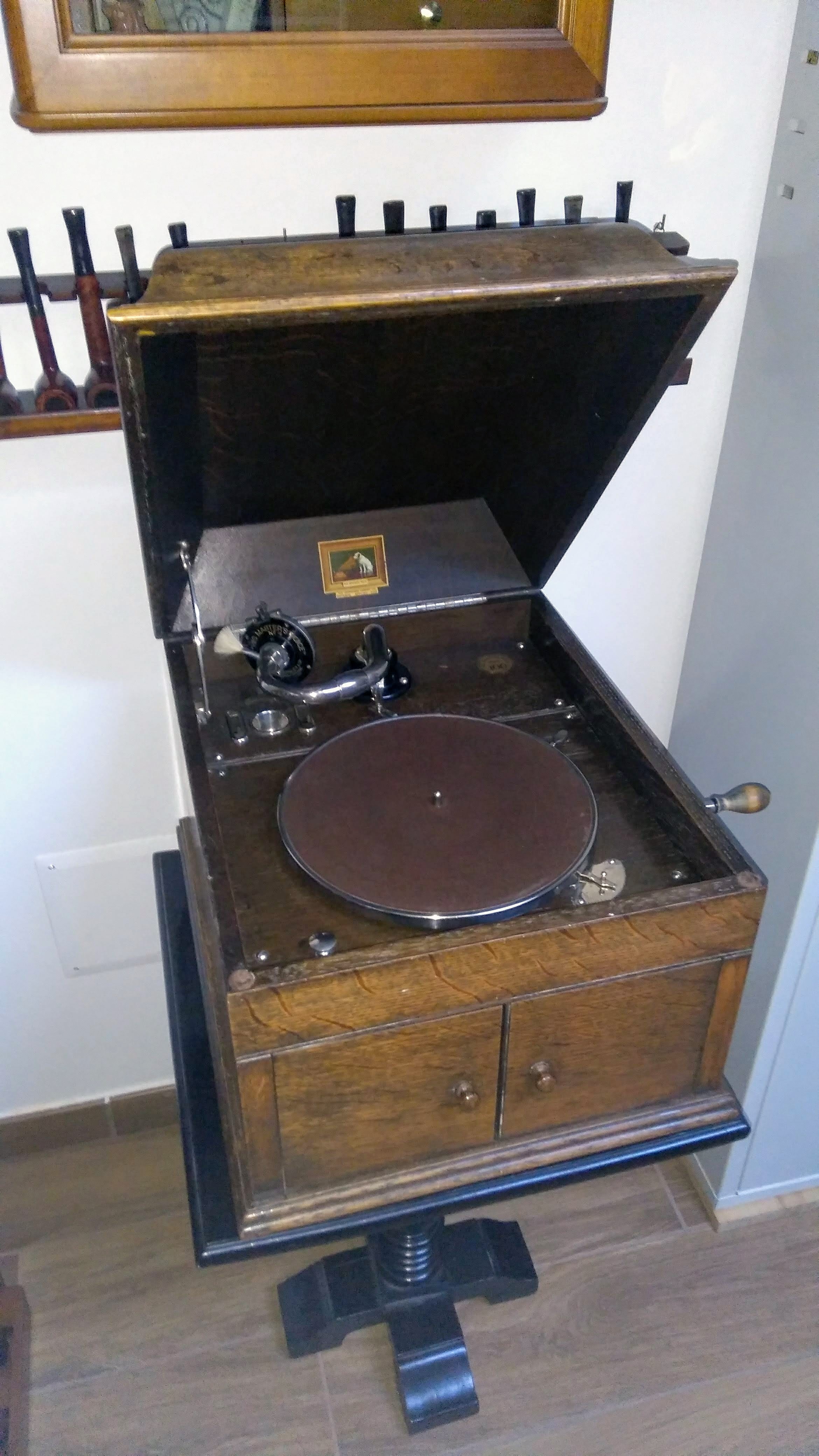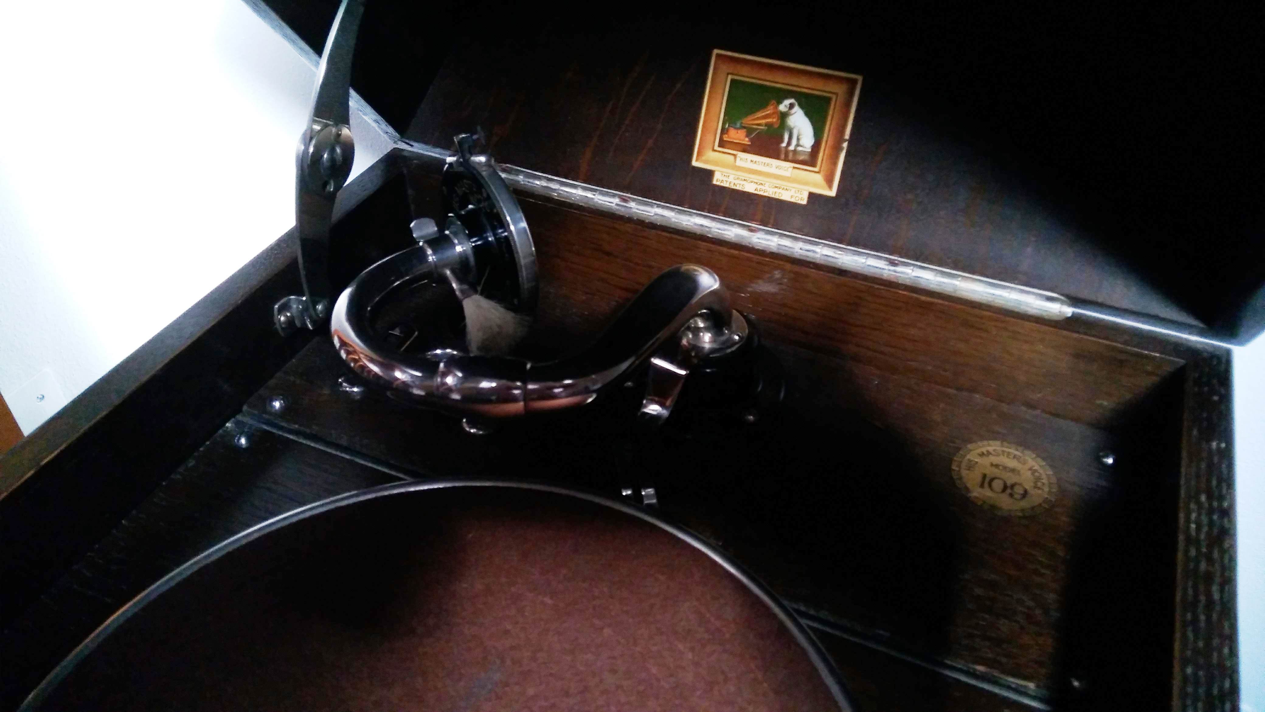 Here's the last guest added to my sample of acoustic gramophones: an HMV-109, the only internal horn machine I own apart from the portables. Due to overall ignorance and lack of specific documentation (still chasing a copy of "His Master's Gramophone" book without luck), some features of this model are either unknown to me or obscure.