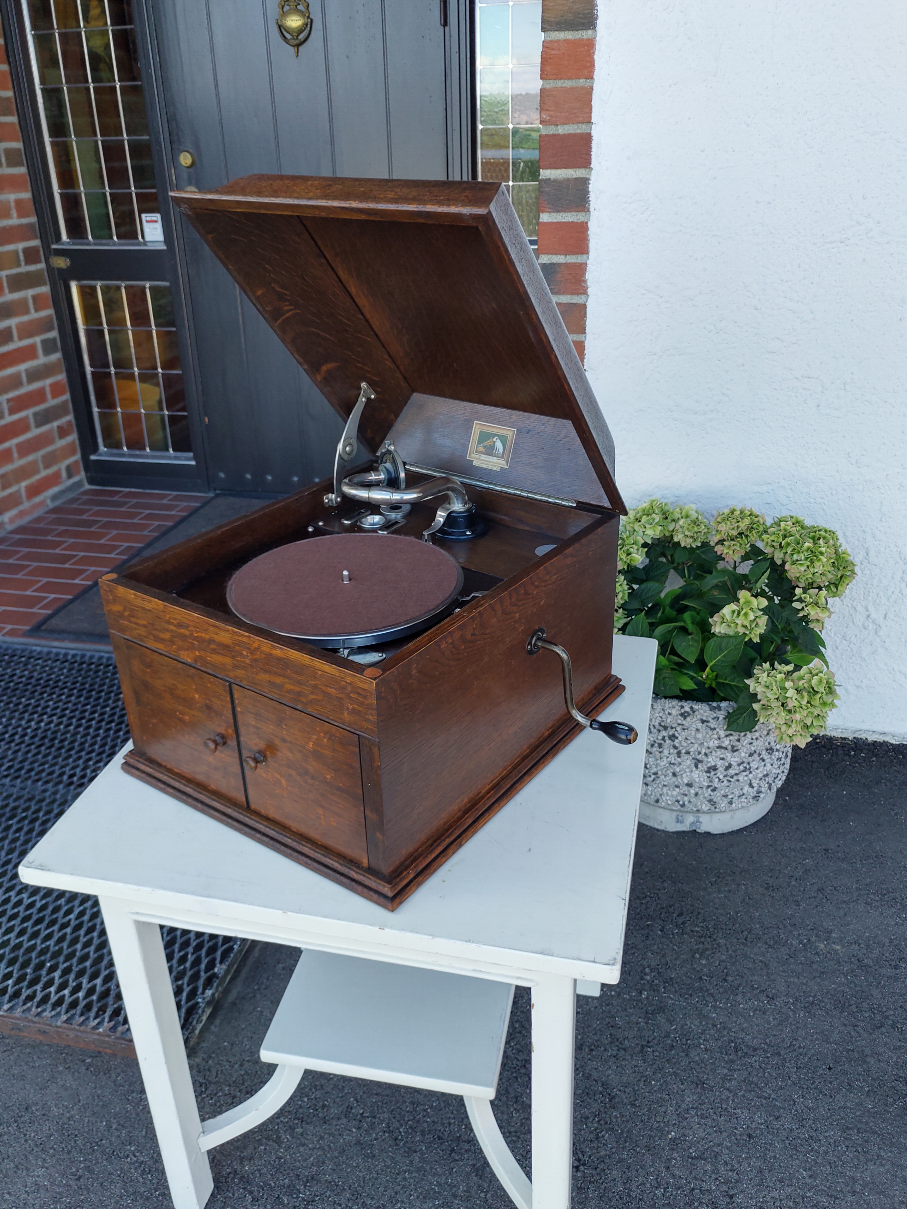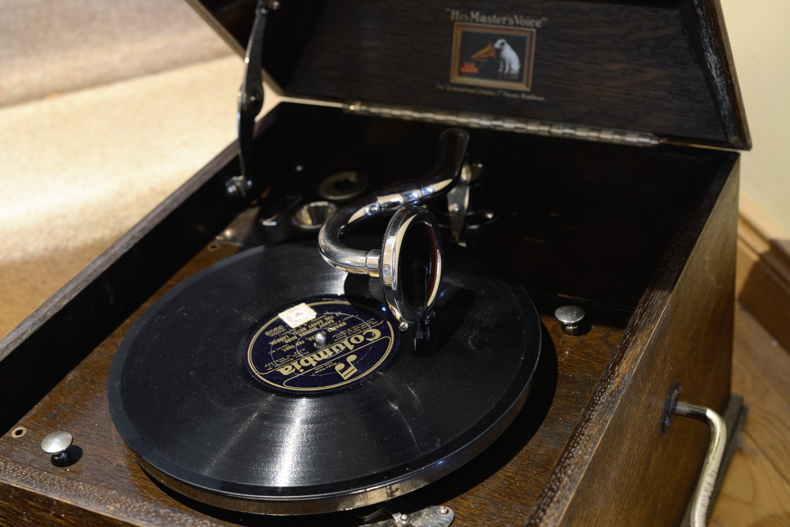 Those were great little performers; part of the "Improved Gramophone" line offered by the Gramophone Co to play the newly introduced electrical recordings. The gradual taper of the tonearm/elongated horn, combined with the #4 sound box, allowed the passage of a stronger mid-range than was possible on the earlier table models. You can also hear a strong "hint" of bass on some records.
