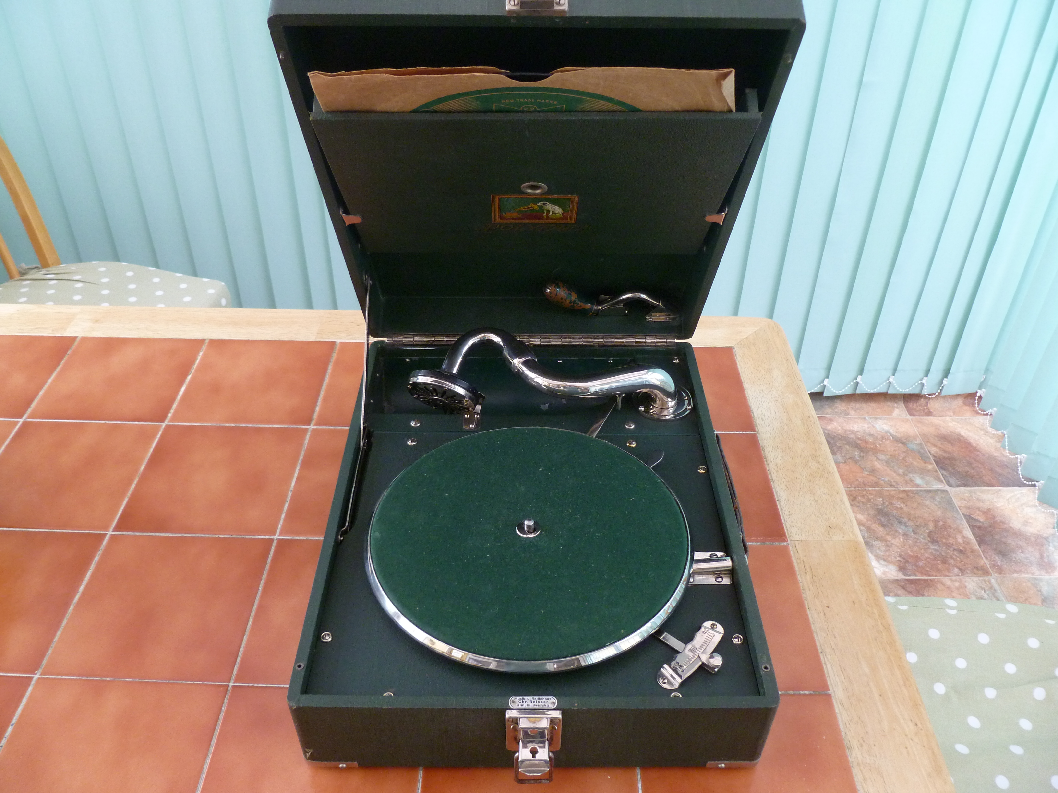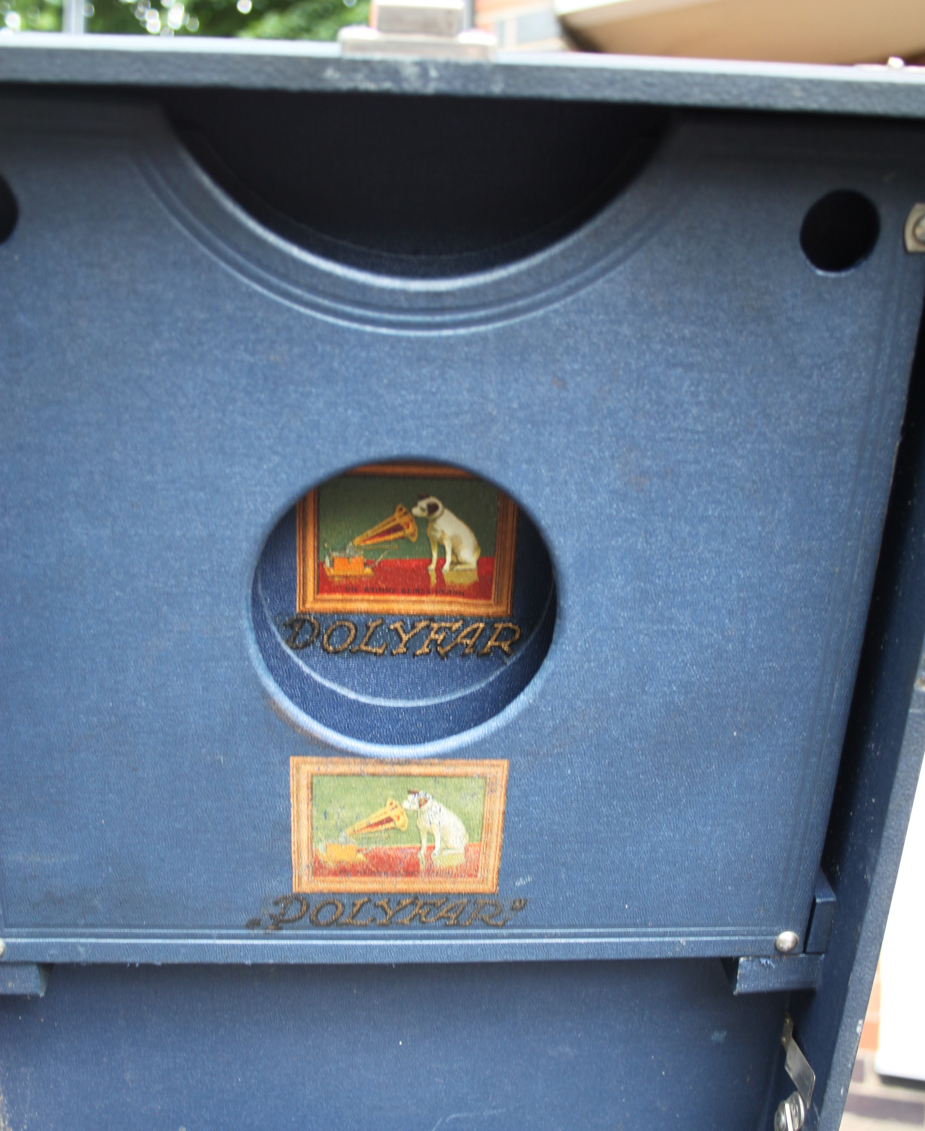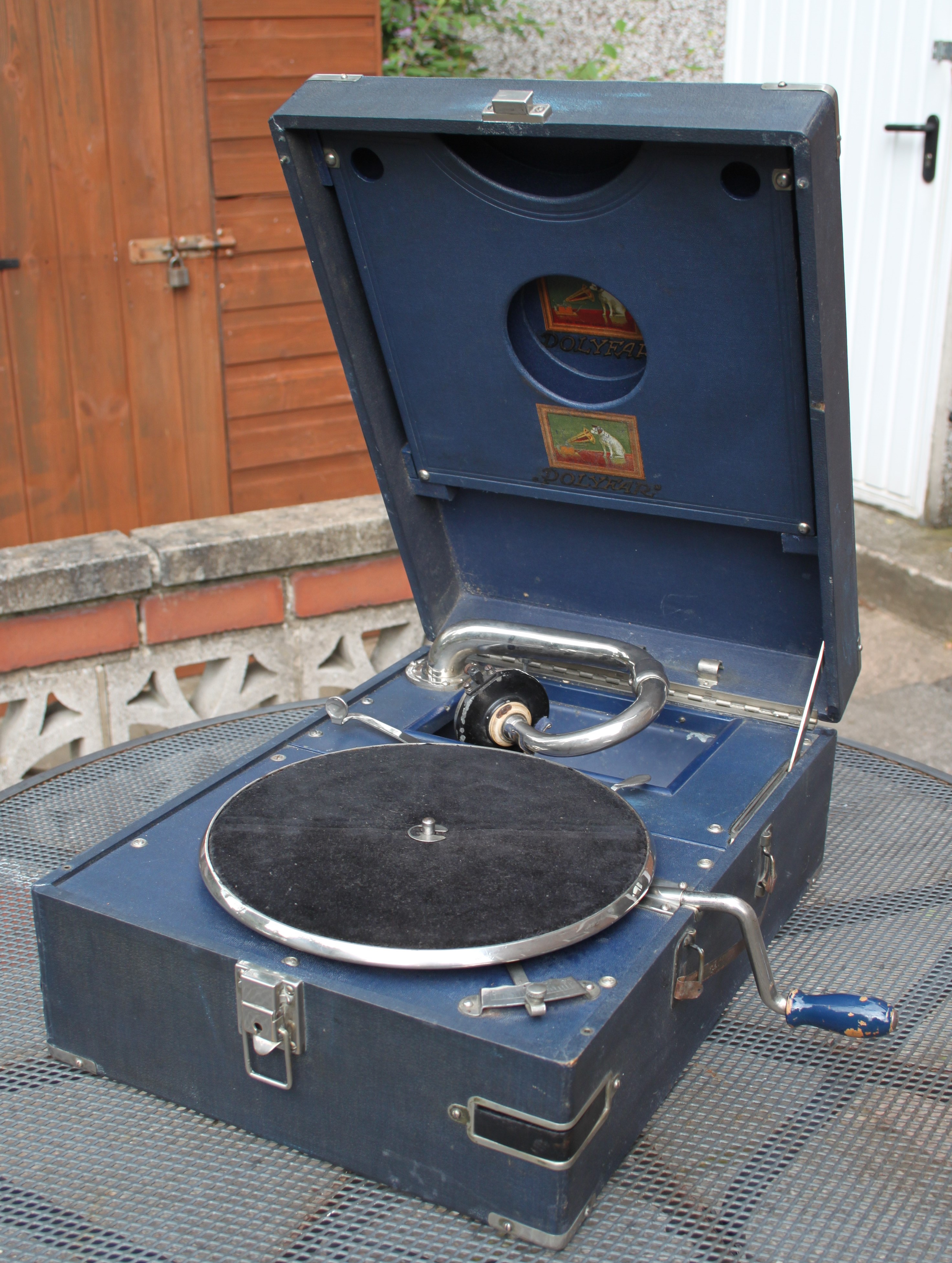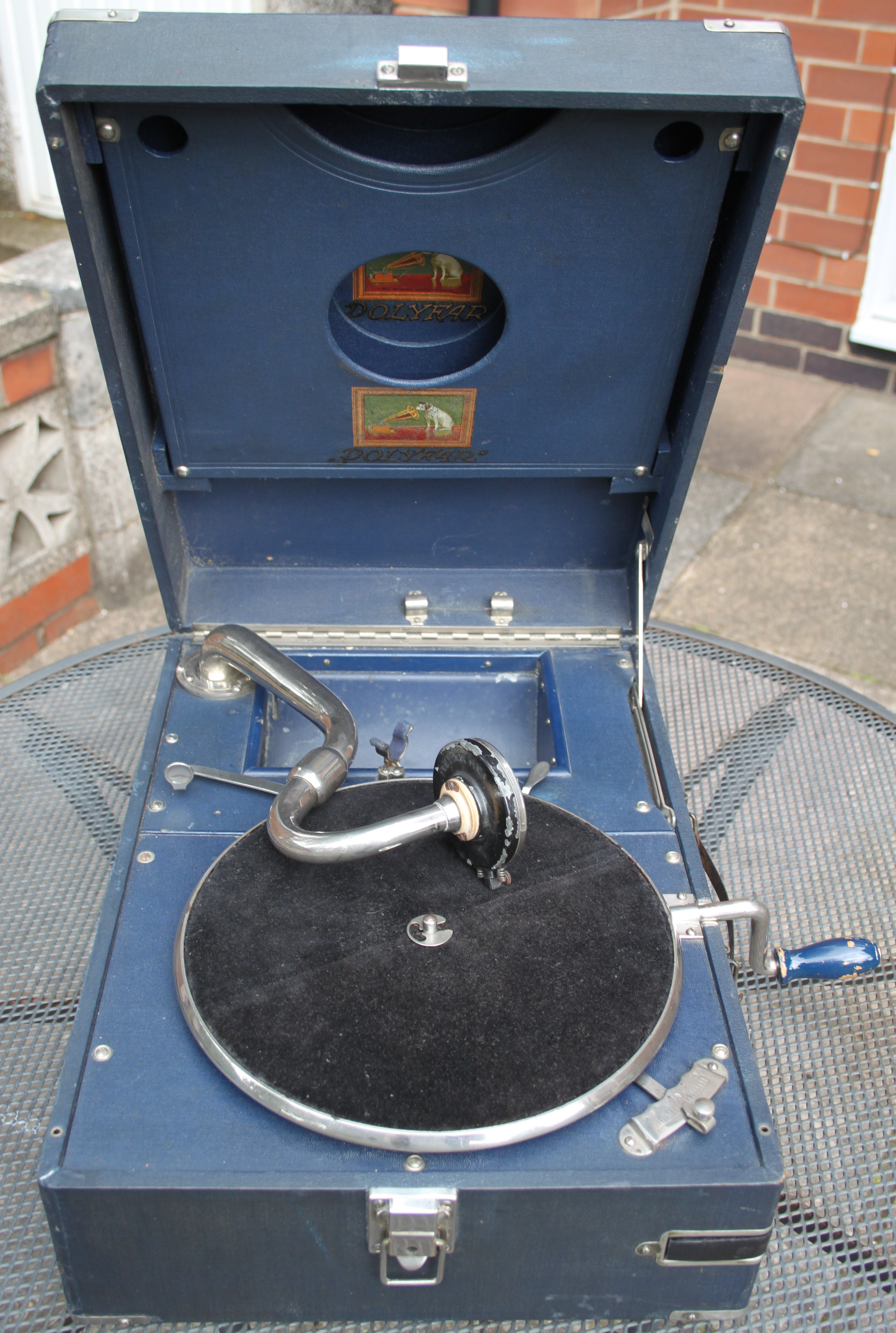Living in the UK, we don't tend to see many of the French or German versions of HMV portables but I have recently acquired this blue German Polyfar. I had always assumed they were basically HMV machines but with a different label but I now find it is the other way round ! There is not one feature of this portable which it shares in common with an HMV portable. The case is a different size, the tone arm comes form the left of the horn, the soundbox is different, the motor is different, there is a removable record storage device in the lid, the handle is different, the corners are different etc etc. It is in effect, a Polydor portable with an HMV badge. Why did HMV put their name to another manufacturer's machine in this way ? Were they not allowed to sell HMV machines in Germany ? Did they own Polydor or was it some sort of licensing deal ? I would be interested to learn the story behind these machines .... Any idea of the date of this one ?