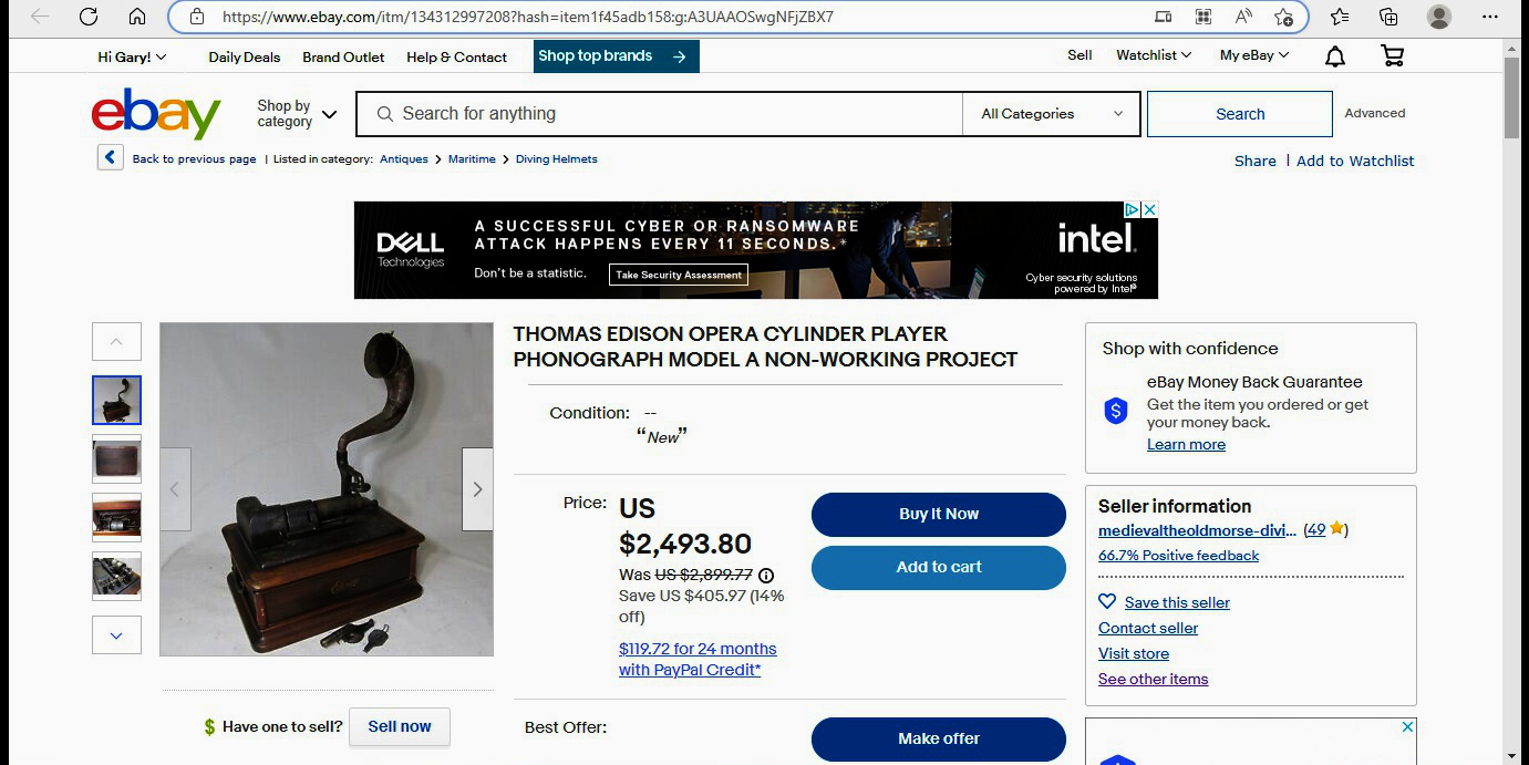 Yup. Total scam. He's offering lots of phonographs and crapophones, with a variety of different pictures that were obviously taken from many sources. I know I've seen some of them before. This listing has a picture stolen from my website: https://www.ebay.com/itm/134318385509