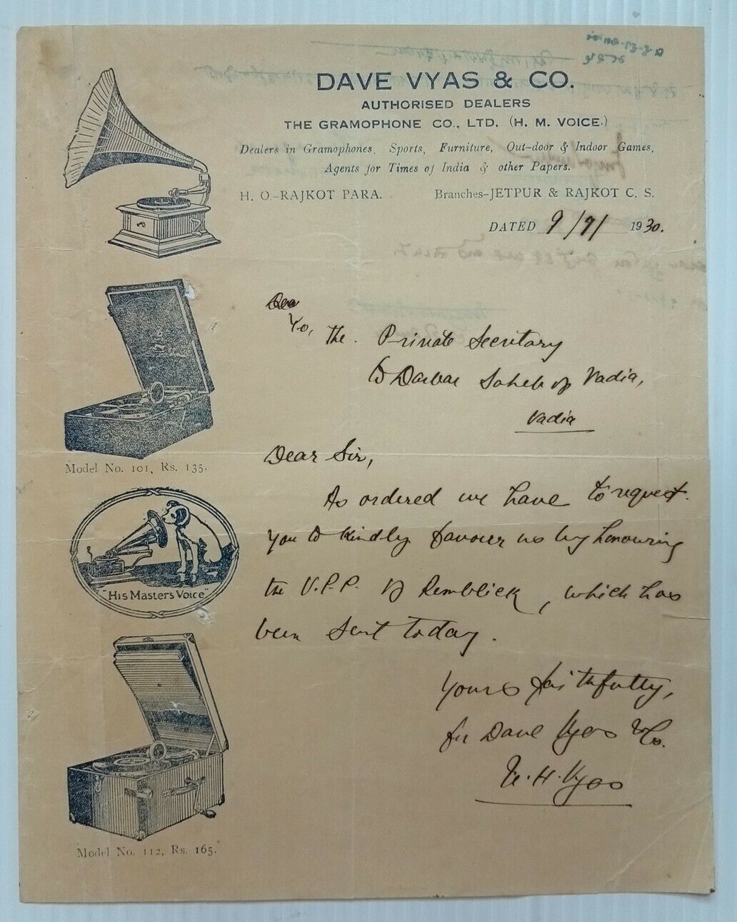 Indian HMV dealer's letterhead.