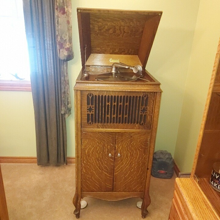 Can anyone identify this Brunswick Phonograph model? A new collector has sent it to me for identification, because the tags are missing and I’m going through the books, can’t identify it.