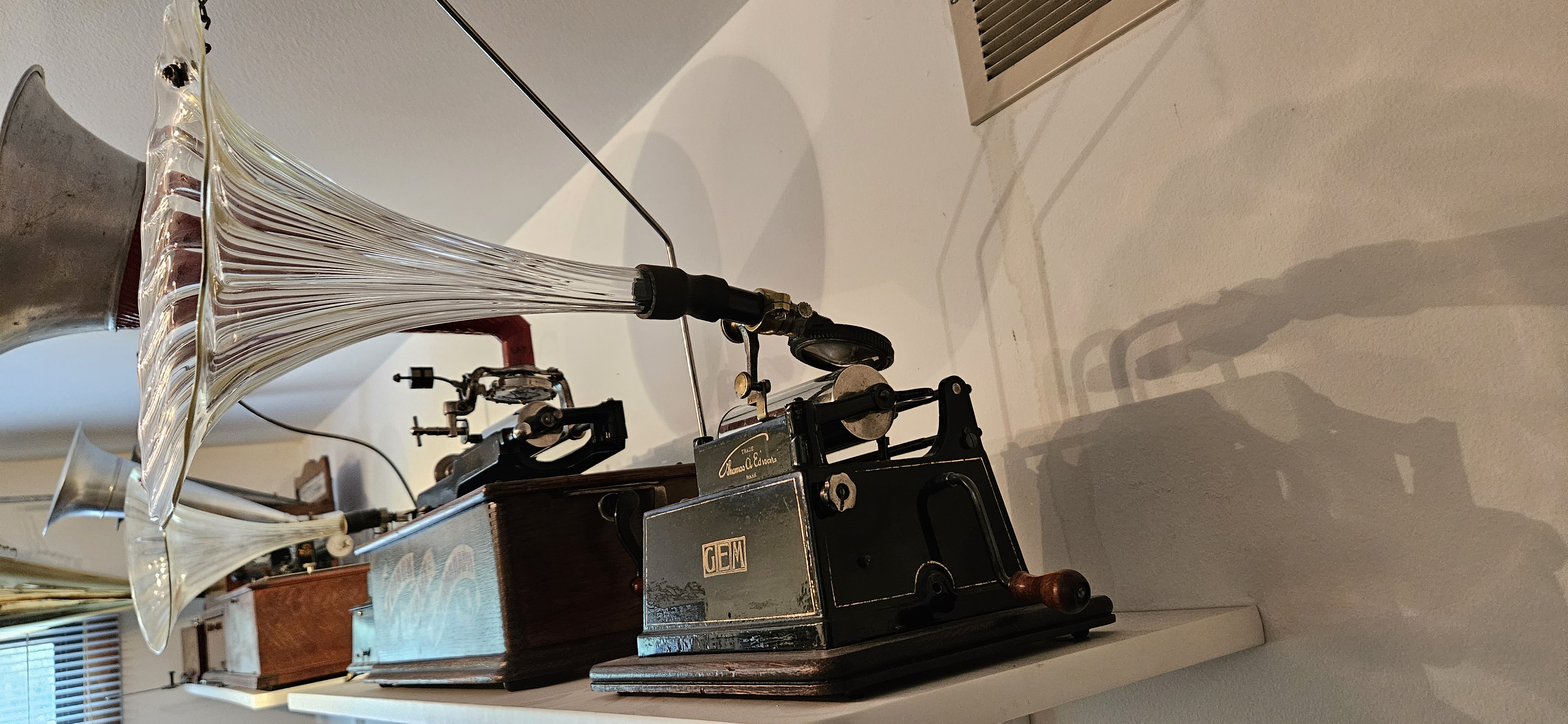 Edison Gem B w/ Glass Horn and Henry Seymour attachment, which includes the arm designed to fit a Gem and the reproducer. The Diaphragm is celluloid.