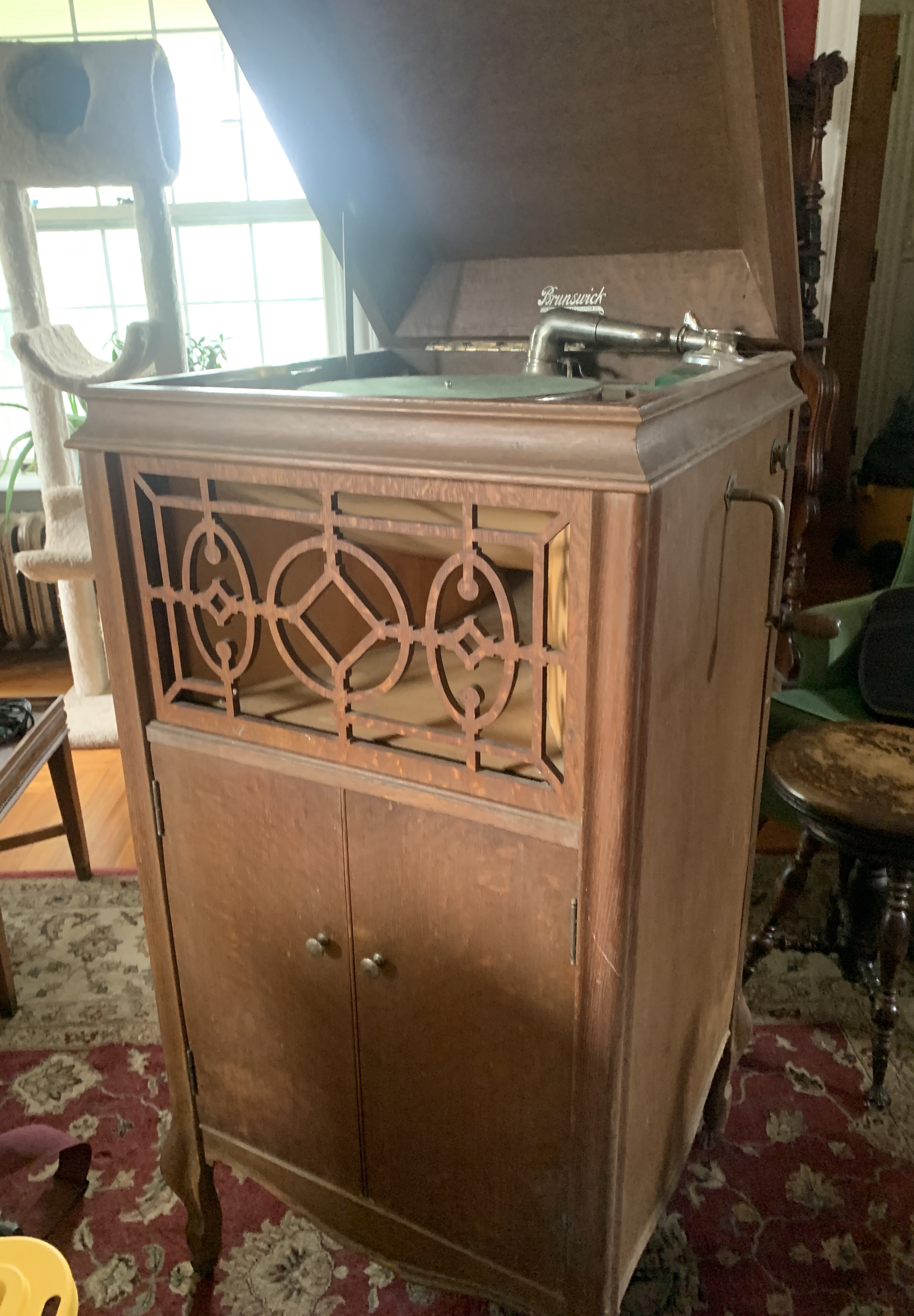 I think you have found a very nice early Brunswick Ultona tone arm phonograph. It looks to me a wax finished golden oak. A plus in my opinion.