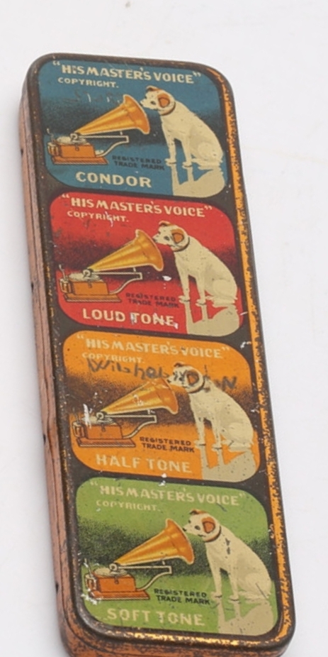 I also limit myself to the HMV/Victor/Berliner lines, so particularly the canadain tin you posted tickled my fancy. Most of my tins are the rather common HMV variety, except with the variations being langauge. I think I've covered French, Spanish and Italian, and the odd German "condor" needle tin (no one has yet explained to me what those were supposed to do). The most unusual one I have is one that has different needle typoes in one long tin, with different compartments, and the lid with the images of all the tin lids...gramophone78 wrote:Zeppy,Although I appreciate your kind words toward my tins. There are so many other tins out there at are better in so may ways. For example, my interest is mainly Canadian & US HMV related. A good friend of mine showed me a German or Swiis tin that is outstanding compared to what I posted. I was hoping in starting this thread that members would show some of the more uncommon tins that they may have. I myself would love to see some of the Zeppelin tins that were made......very cool...