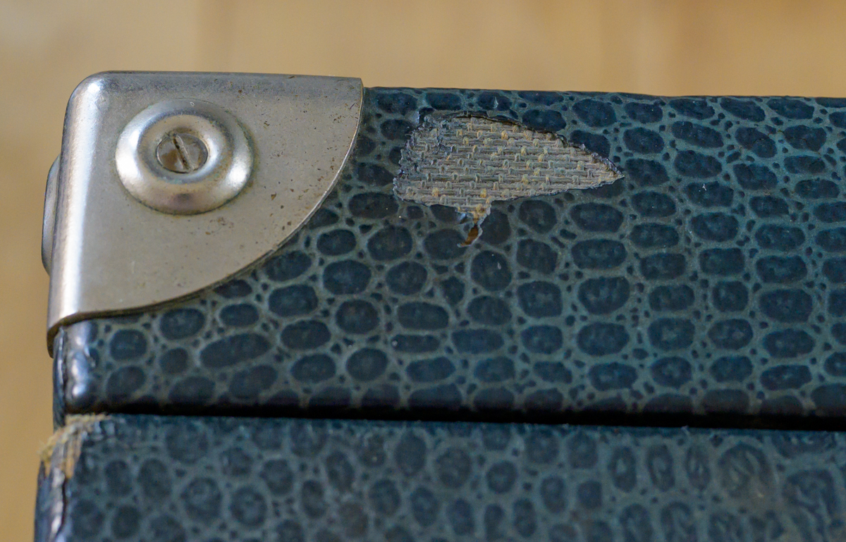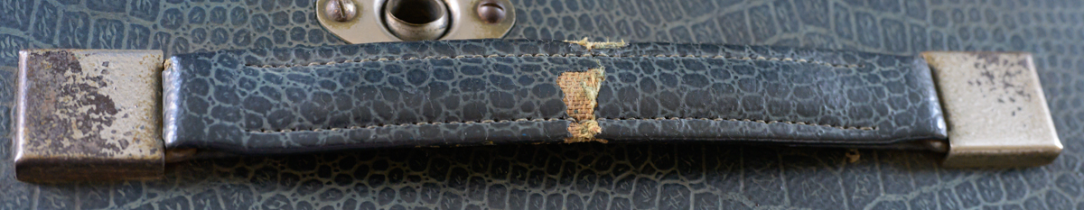 The case is sound and solid. I can't see any woodworm. The rexine is mostly complete, sound, and clean. There are a couple of small losses – I’ve photgraphed the worst. The blue rexine is still present on the handle, but split across the middle. I'm guessing that could be repaired. The rexine on the motor board looks a bit mucky, but is complete.