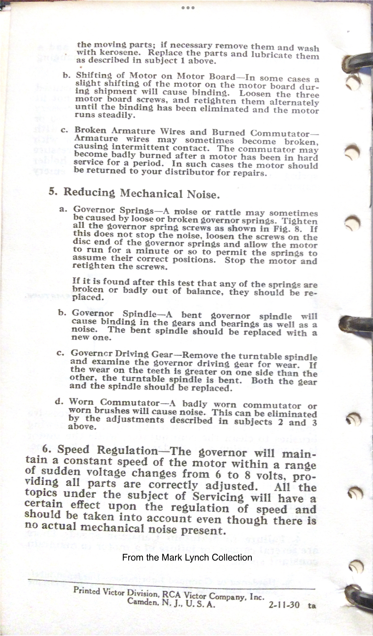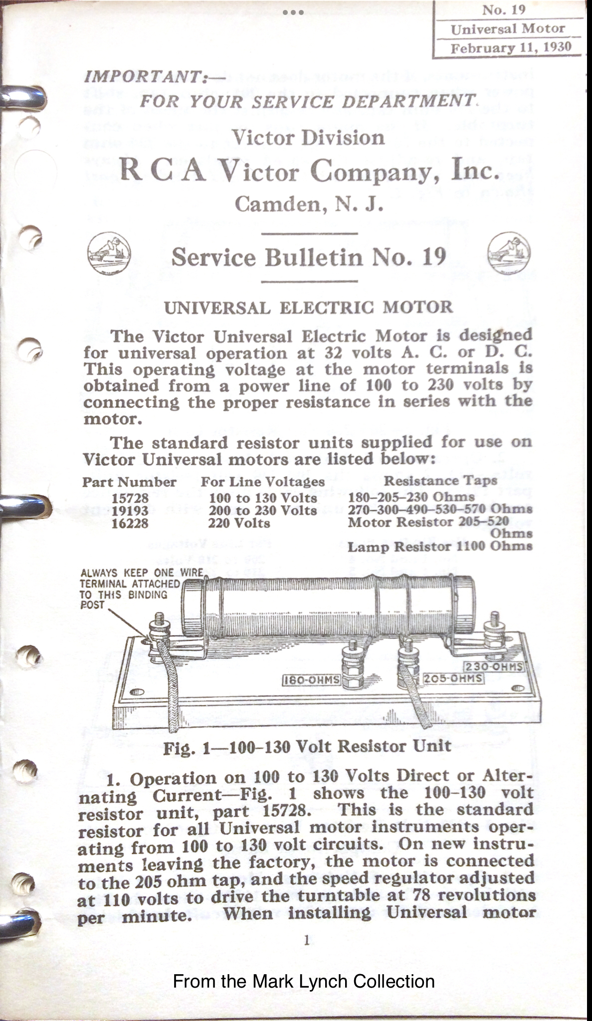 Here is the dealer service bulletin that RCA Victor printed on February 11,1930 in regards to repairing the Universal electric motor and the associated resistors.