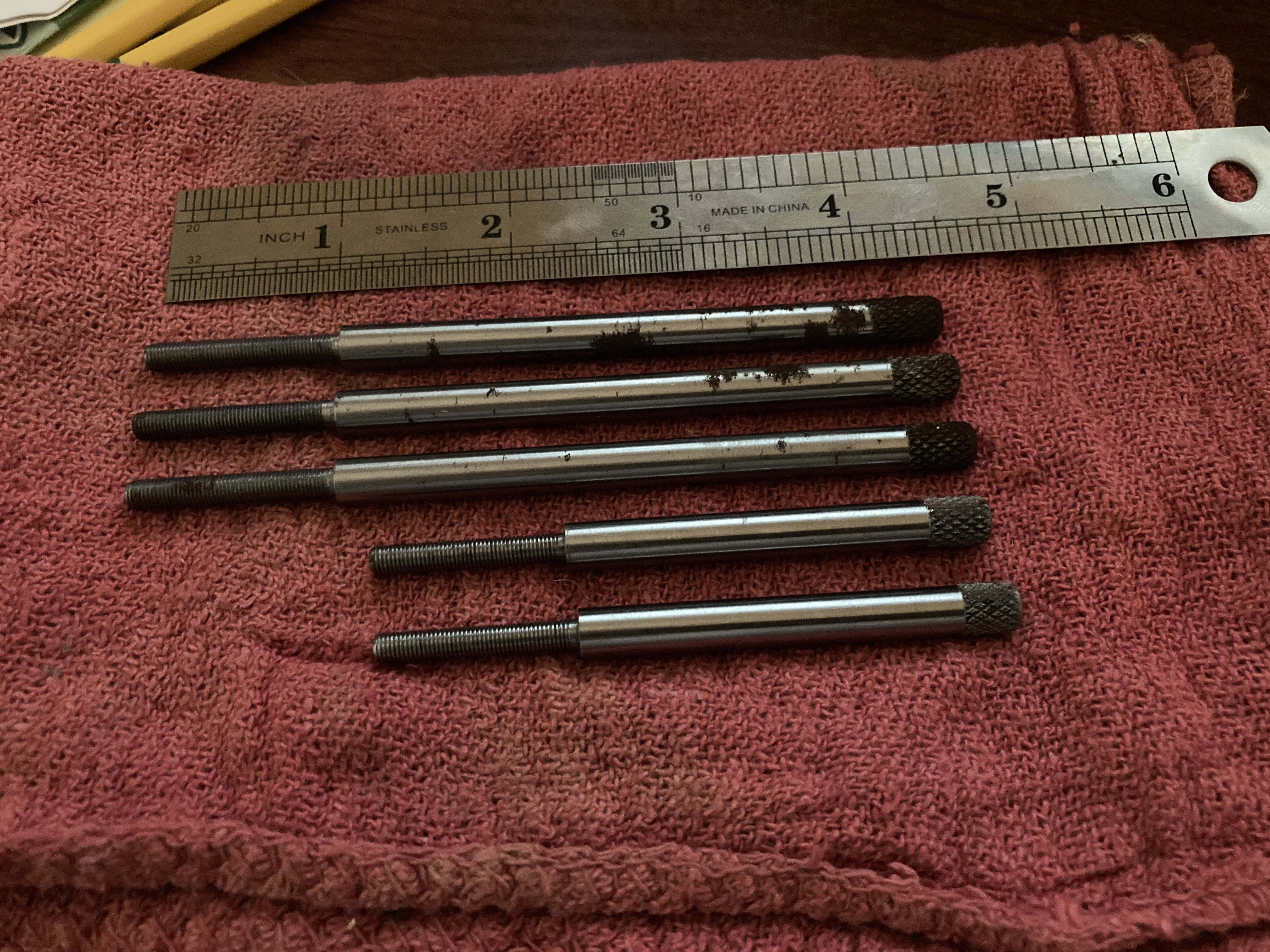 One is 4-½" long from ¼" rod stock. Machined thread length is 1", knurled length is ⅜", thread size is #8-48, some oxidation, 3 available