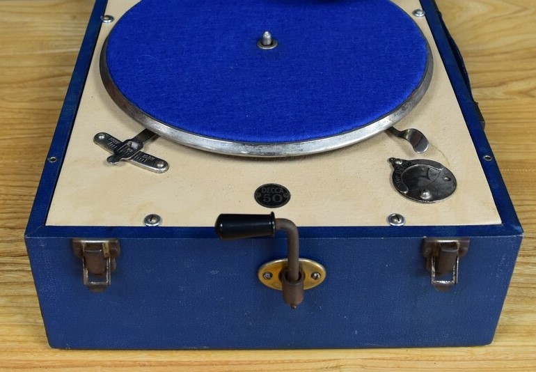 I don't know who made the Trek portable, but the distinctive winding handle which folds against the case rather than into it (as with pre-EMI Columbia portables) was also used on many post war Decca portables such as this Decca 50 :