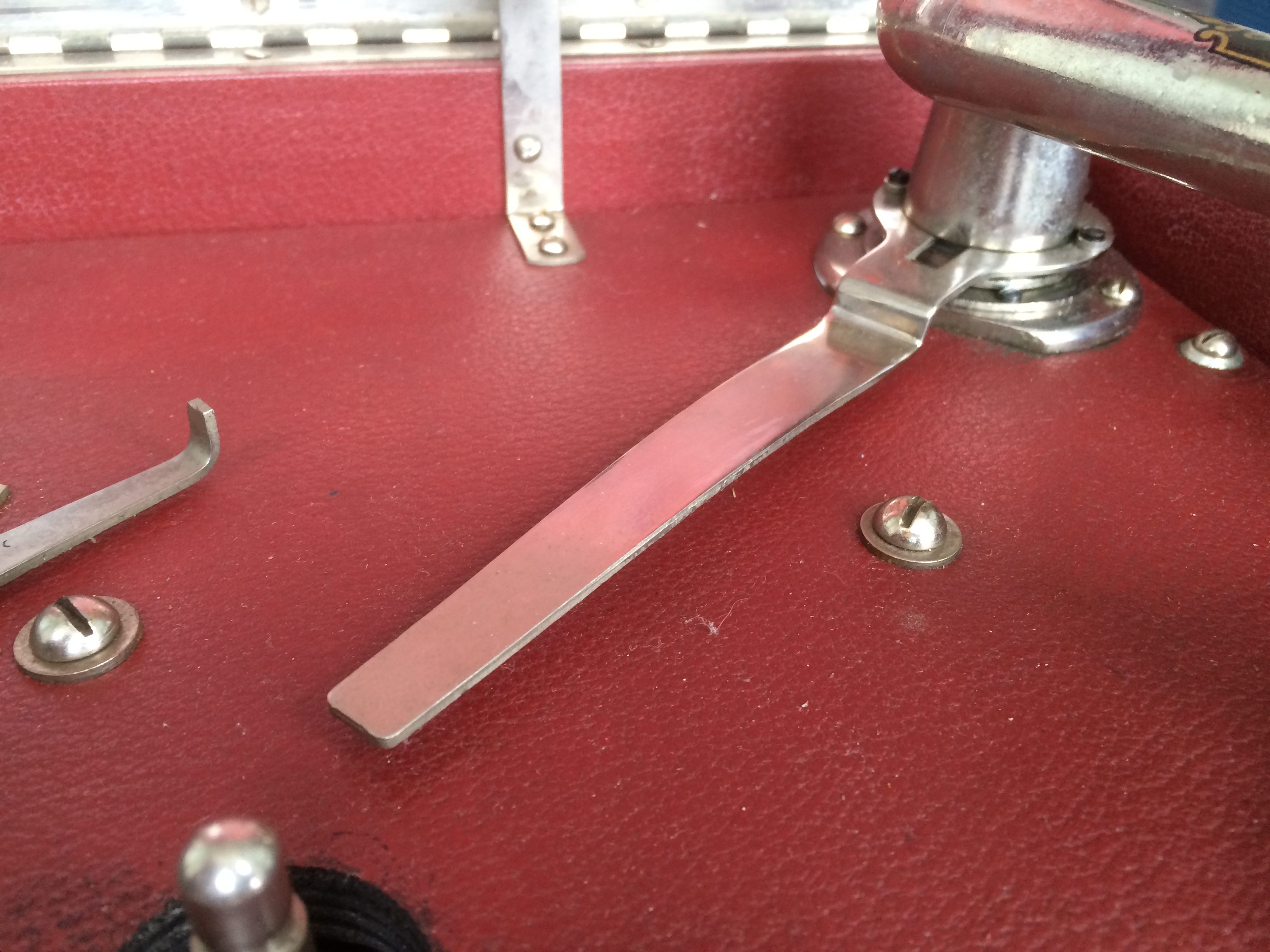 You mentioned the red example which I have also seen but I was referring to the green crocodile grained leather one at £375. Its tatty and although with gilt fittings, the tonearm is bare metal. Is it aluminium or some nasty pot metal?