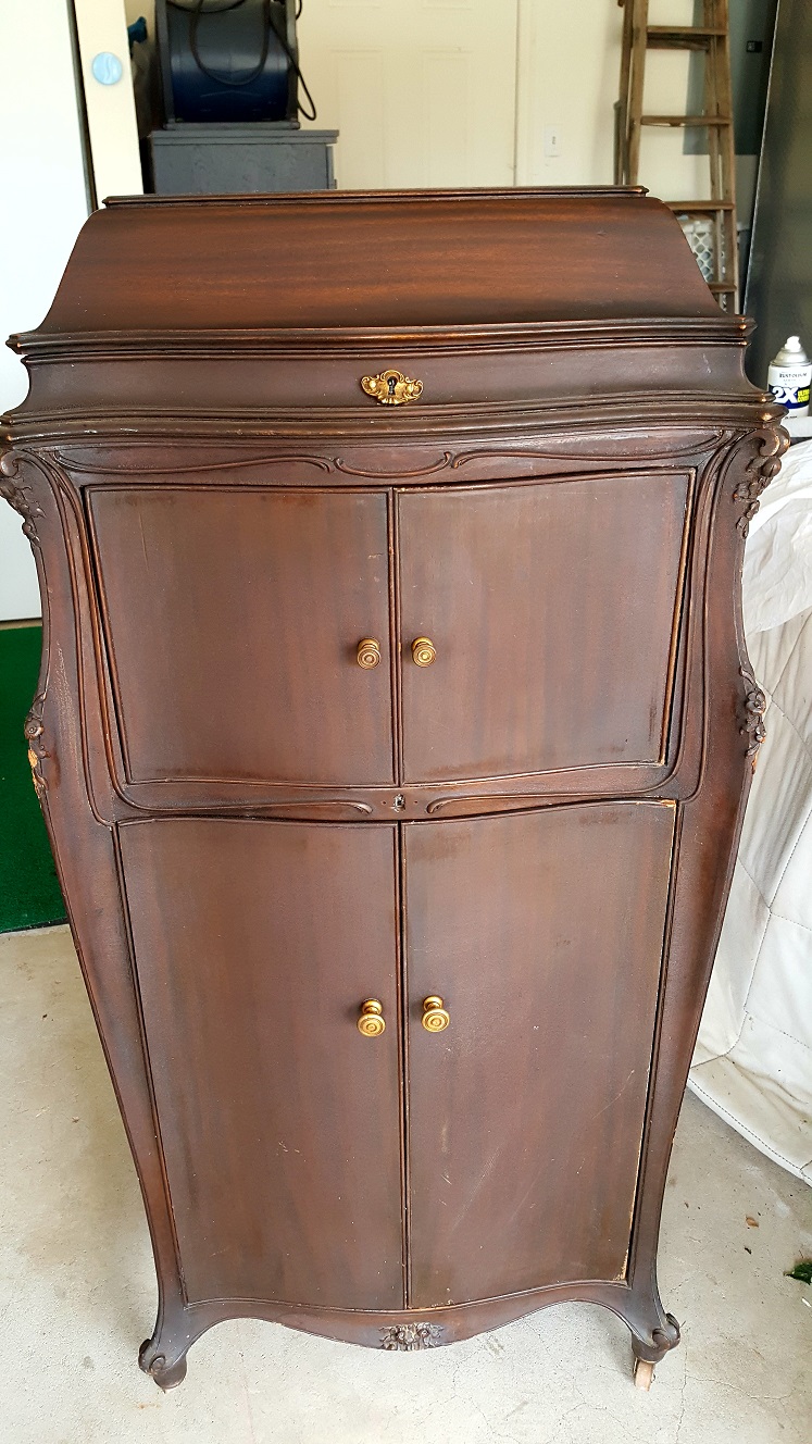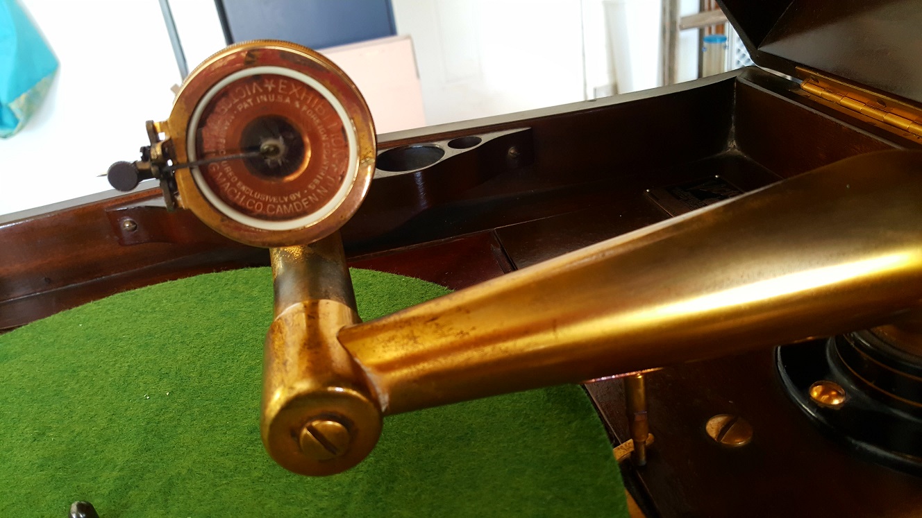 This is an early 1917 model VV-XVII, as indicated by the serial # and Exhibition Reproducer (which changed to #2 reproducer later in 1917). The 4-spring motor has been cleaned and lubed; plays well. The gold Exhibition reproducer has been rebuilt with new gaskets and sounds great. The mahogany cabinet has age-appropriate alligatoring, which can be cleaned to return it to its original finish. There is some damage to the corner carvings, as seen in the pics. If you're looking for a project with a good prospect of making a beautiful Bombay cabinet, this is it. All the gold-plated hardware is there (missing 1 lower escutcheon). Can arrange delivery within 100 miles of Norman, Oklahoma. Thanks, Roy