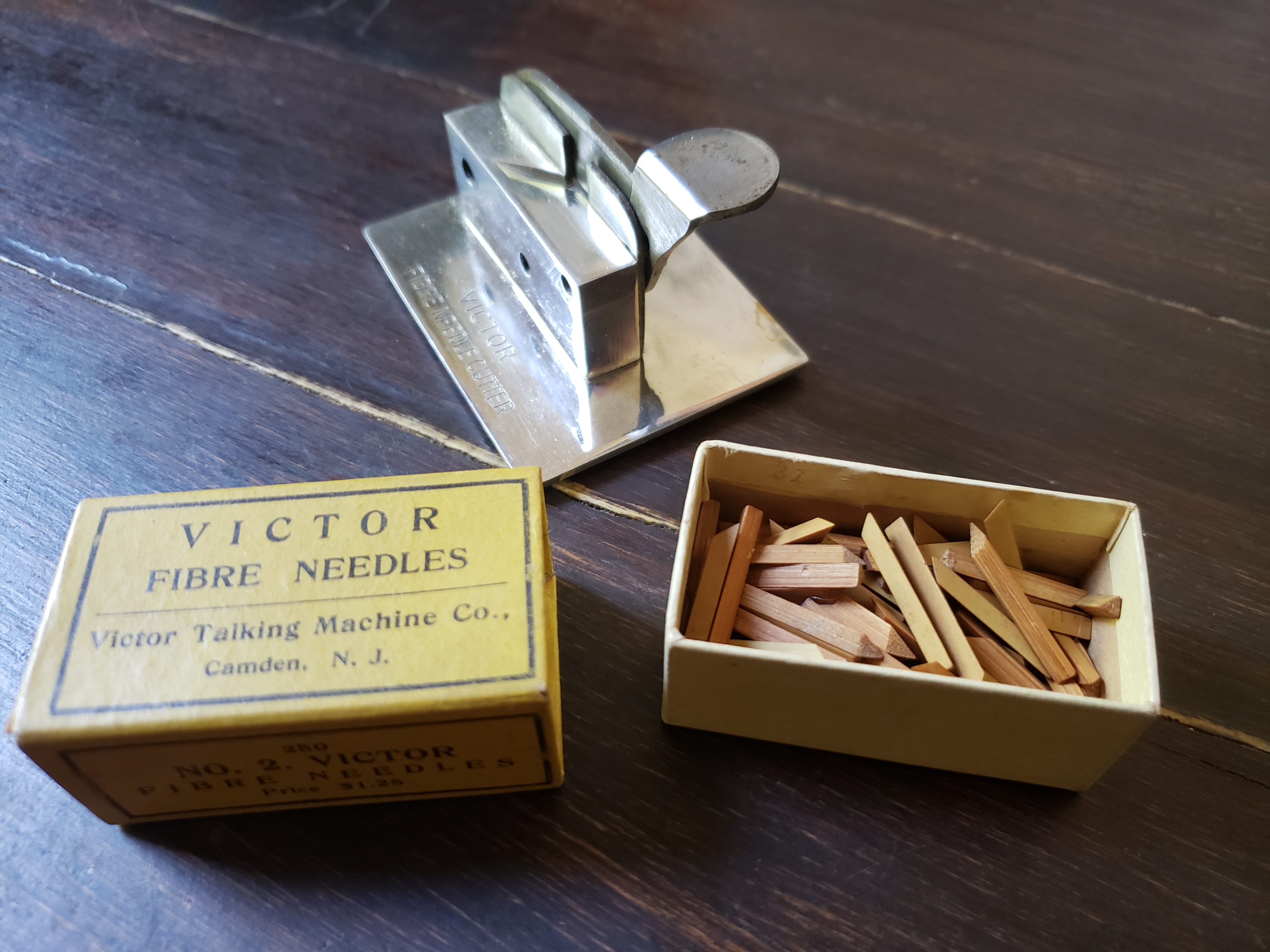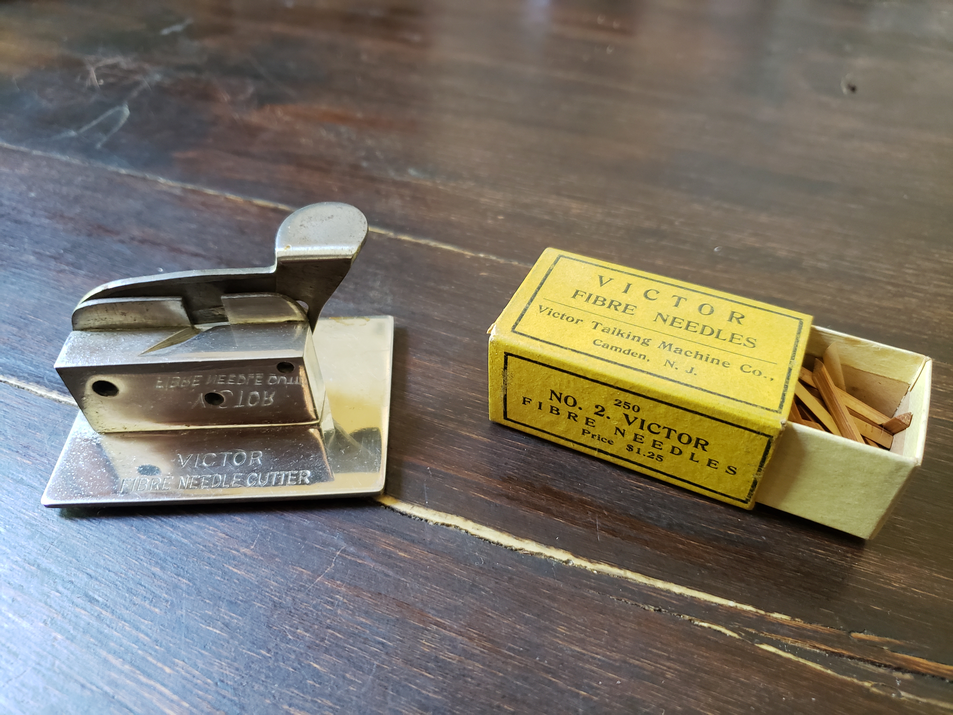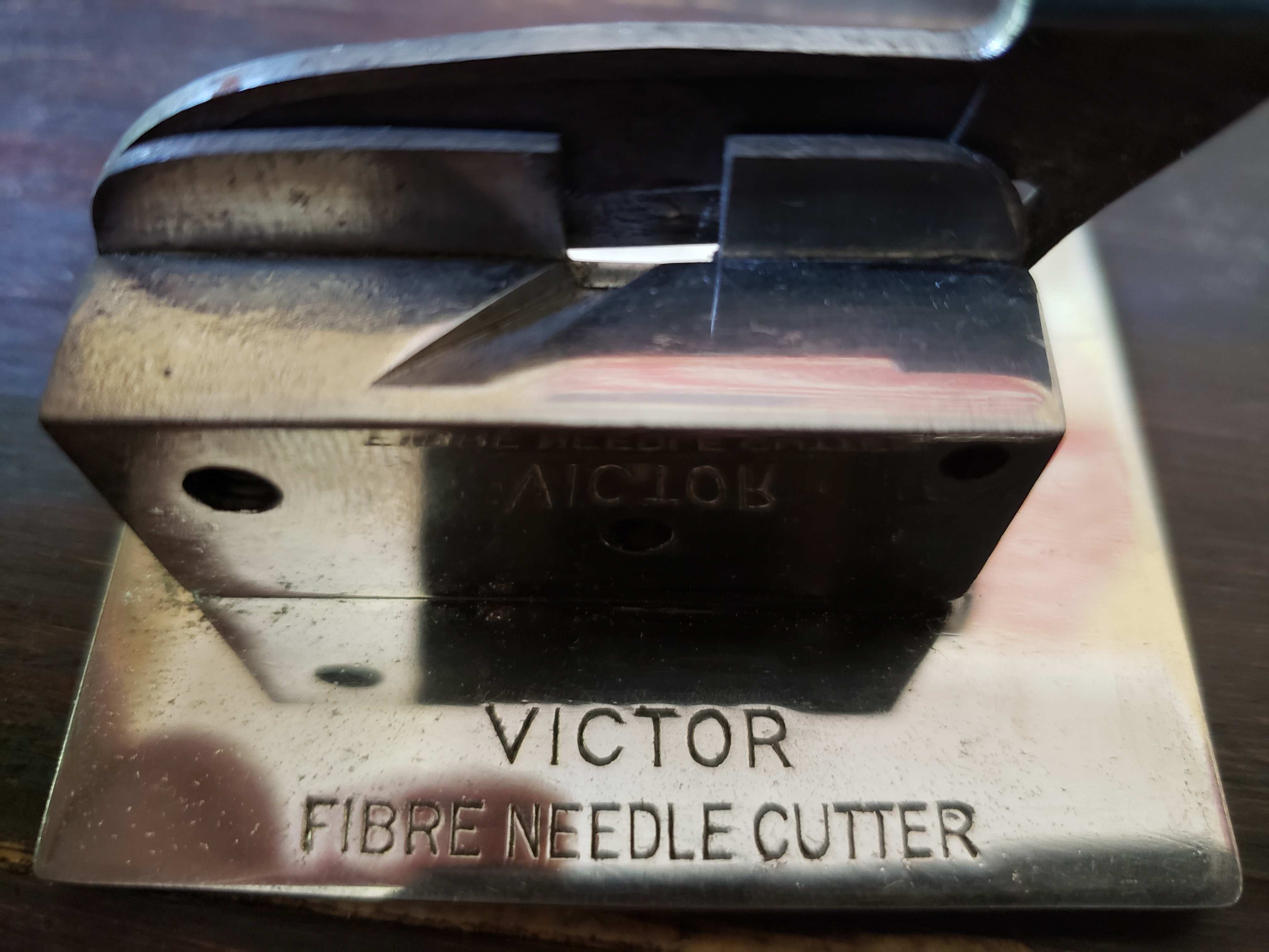 Nickel plated Victor Fibre Needle Cutter in near-mint condition with box of original Victor fibre needles. Somewhere north of 100 needles in box - about 110 or so if I counted them right. Cutter has a good sharp blade and cuts a sharp tip every time.