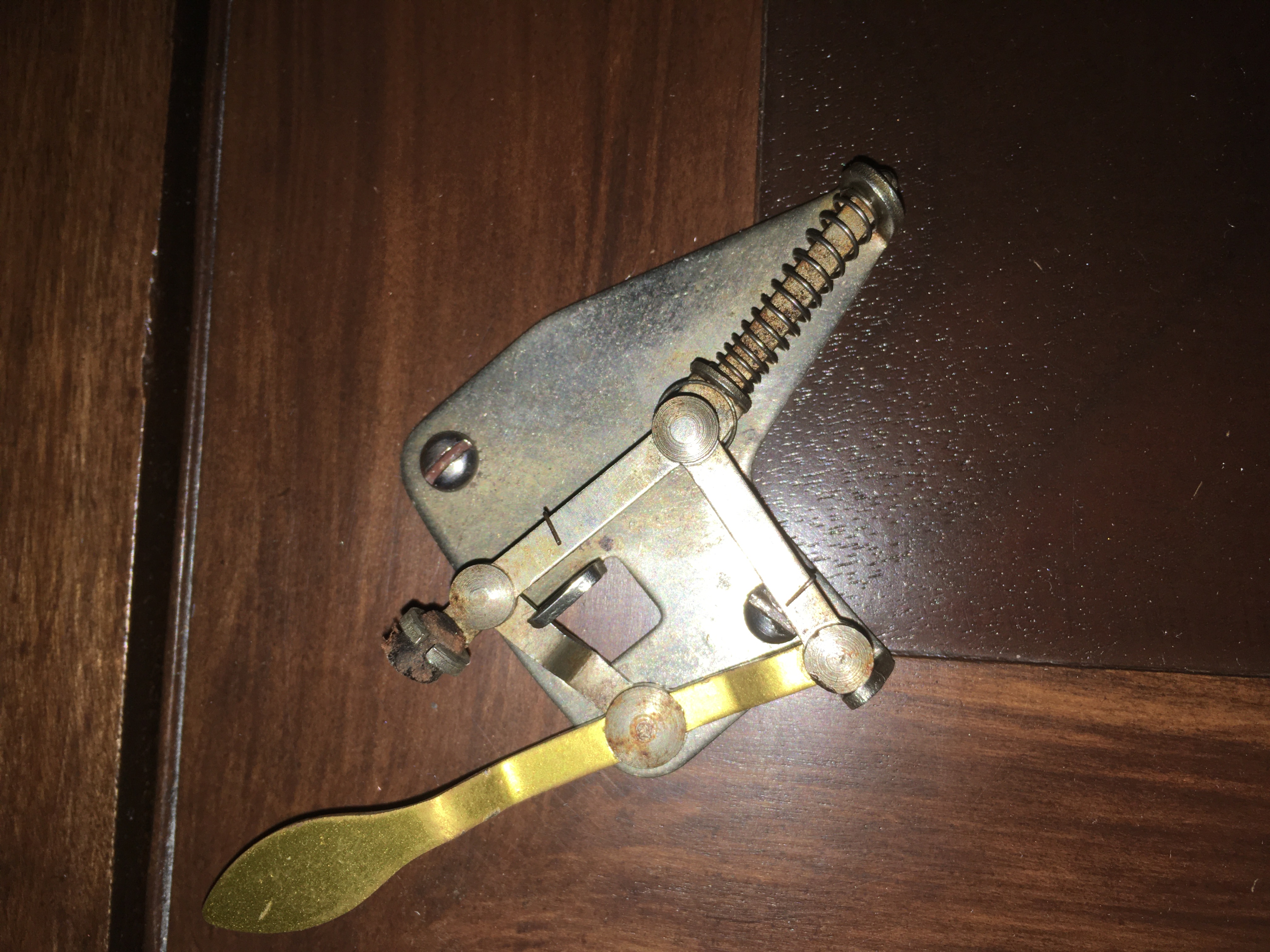 I don't know if "scissor" is the right word, but that is what the action of this brake reminds me of. This is being readied to reattach to the VV-X I'm currently working on. What strikes me as odd is that I have literally scoured the web (and, to the best of my ability, this forum) and cannot find even one picture of this type of brake. I'm sure they aren't rare per se, but I was curious to know how long this particular brake was utilized and around what year(s). Paul Edie's site mentions only when Victor generally began using the "tab" brake, but there is no mention of this one specifically. The donor VV-X cabinet in oak had the bullet brake and the mahogany donor with an "A" suffix had this style of brake.