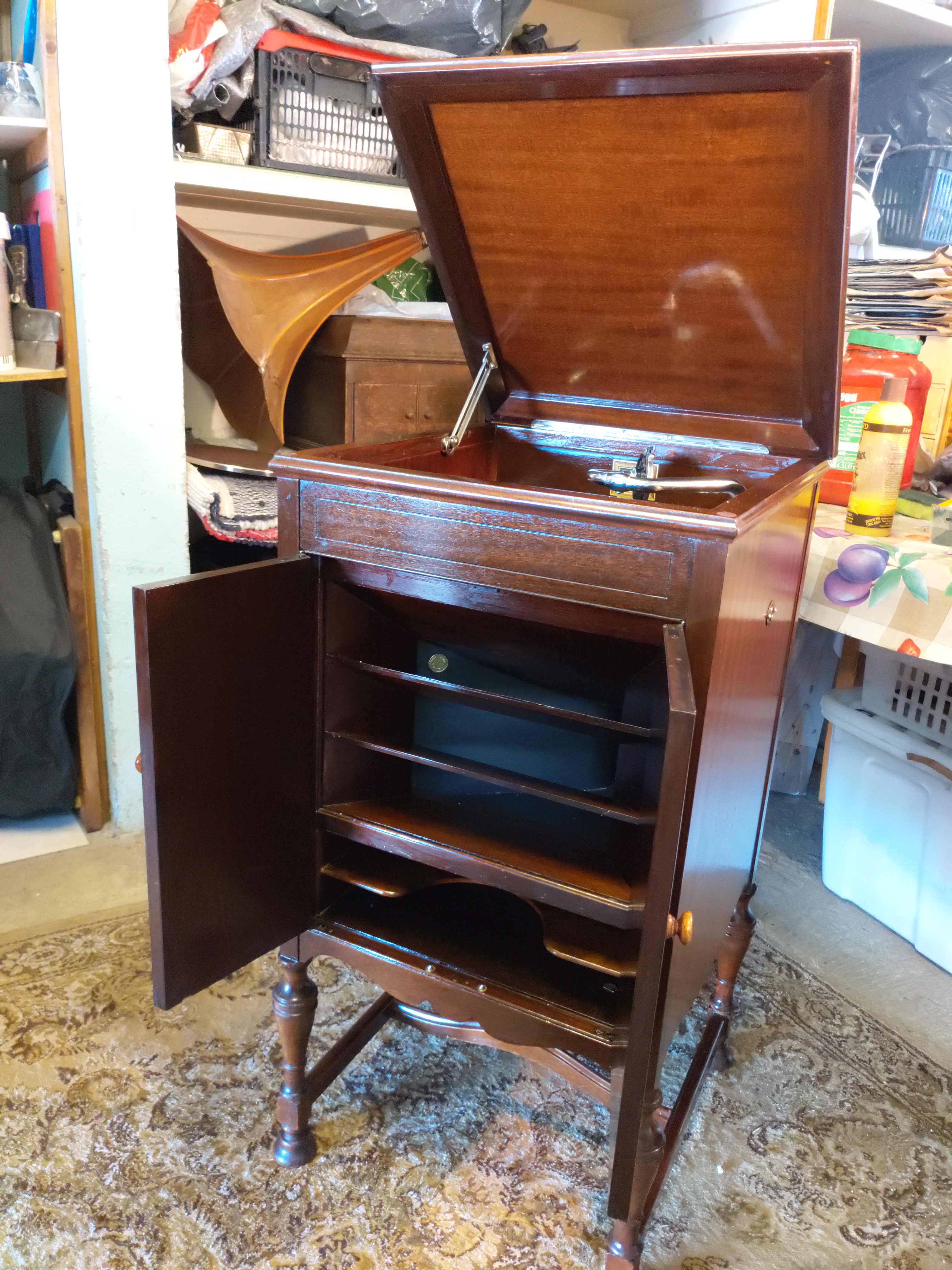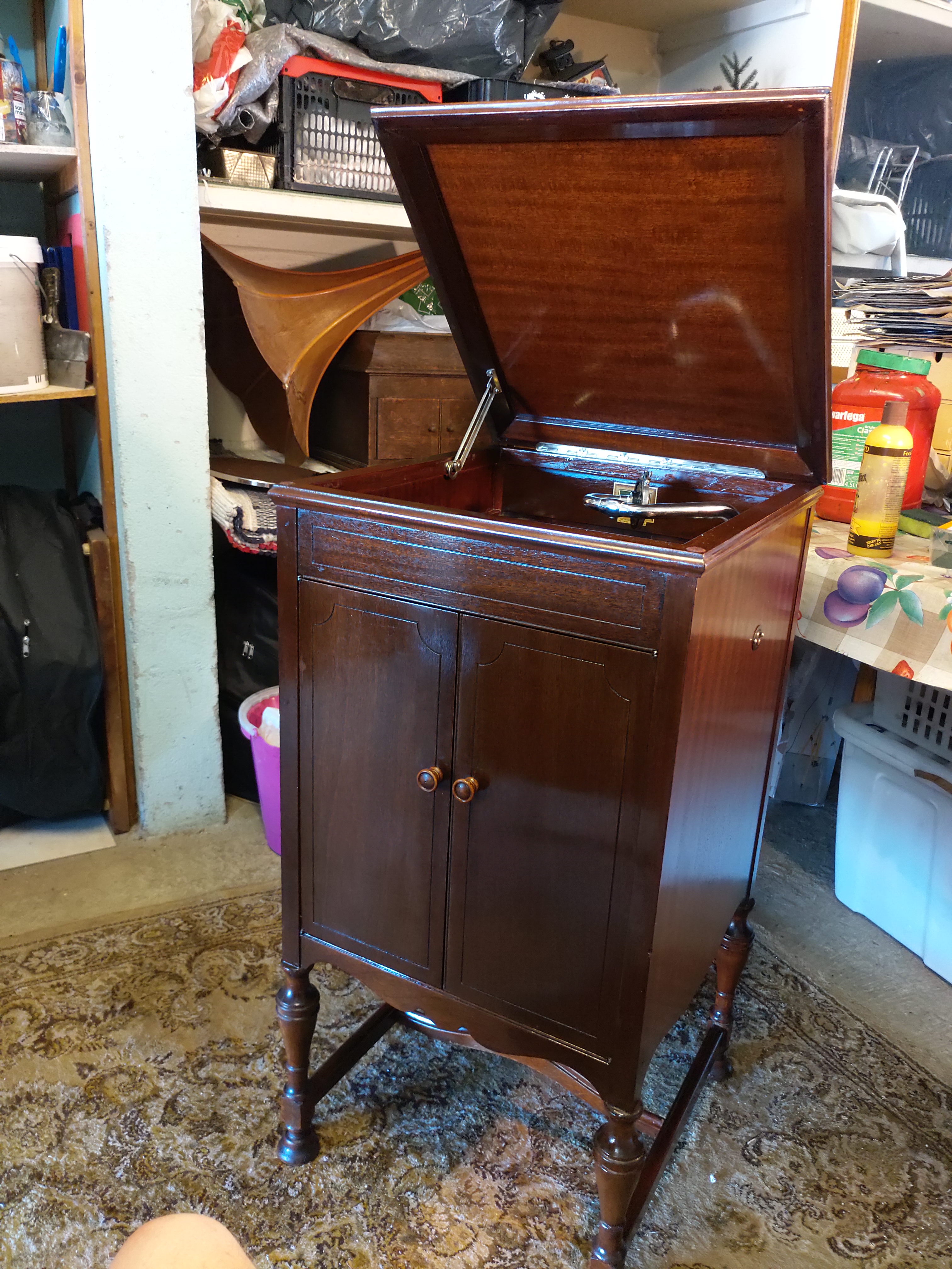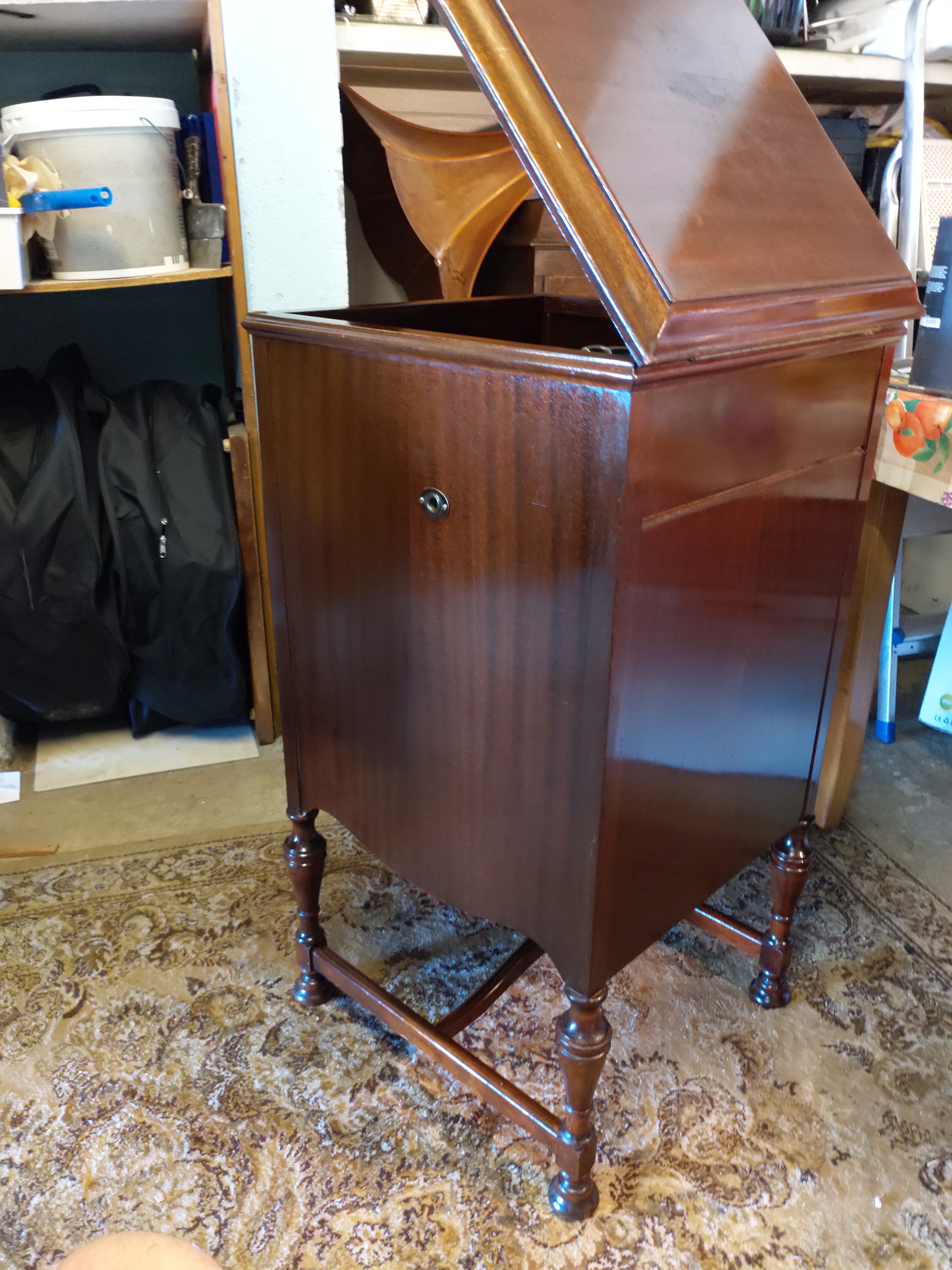 Thanks for telling your story Jamie, I always love to hear such stories, and it always also give an extra boost to post photos of different machines that turn up. Yes, it is nice to see the difference between the two 156 machines, and I will upload some photos also of the horn later on, for reference. Right now the mahogany machine has received some treatment on the cabinet, while the oak version is straight out of the sellers ( dry) basement.