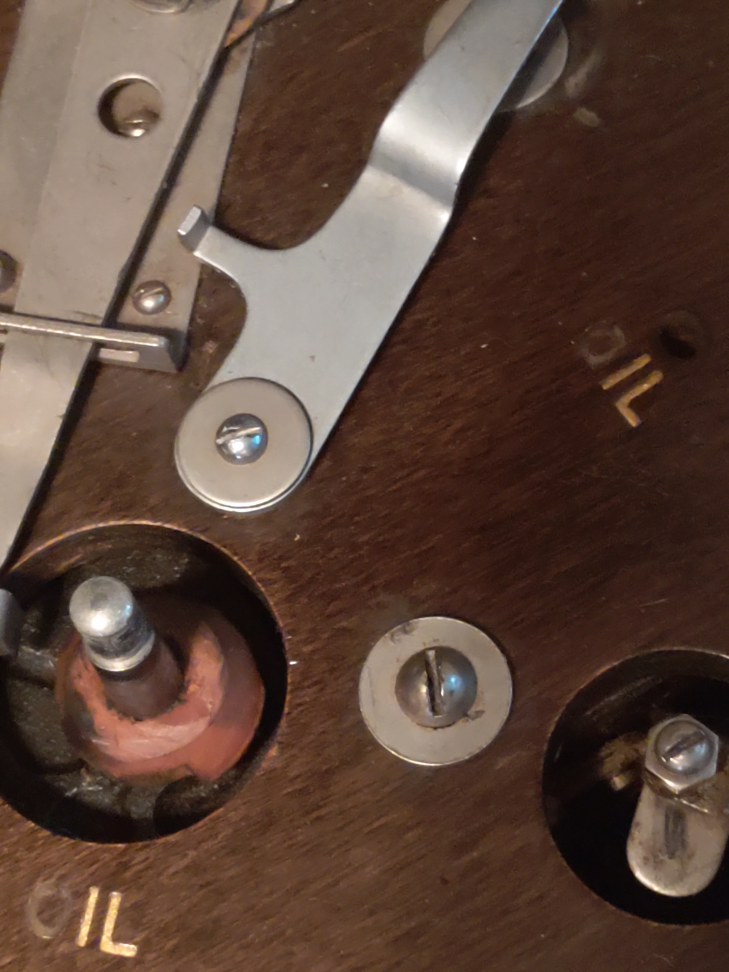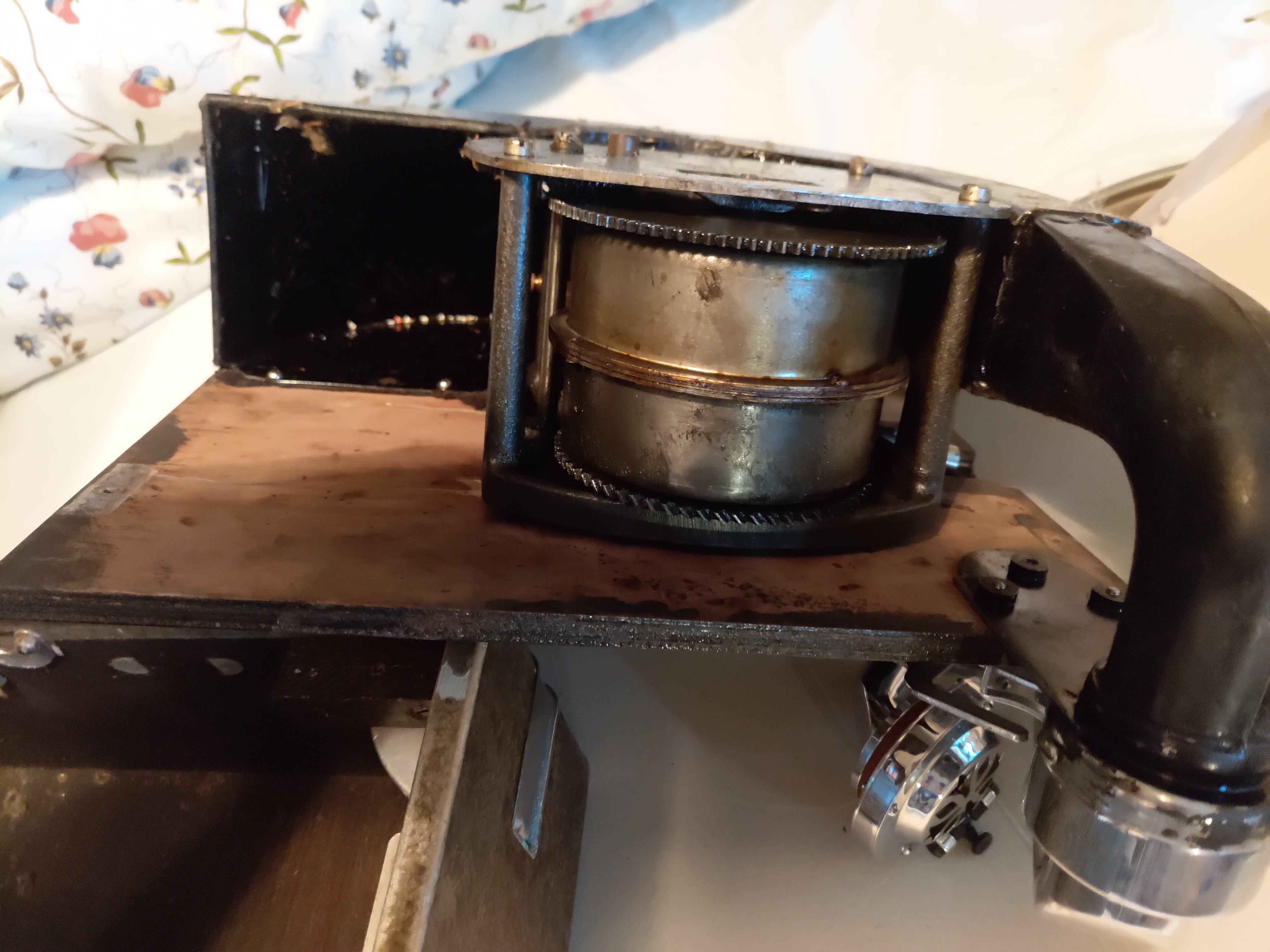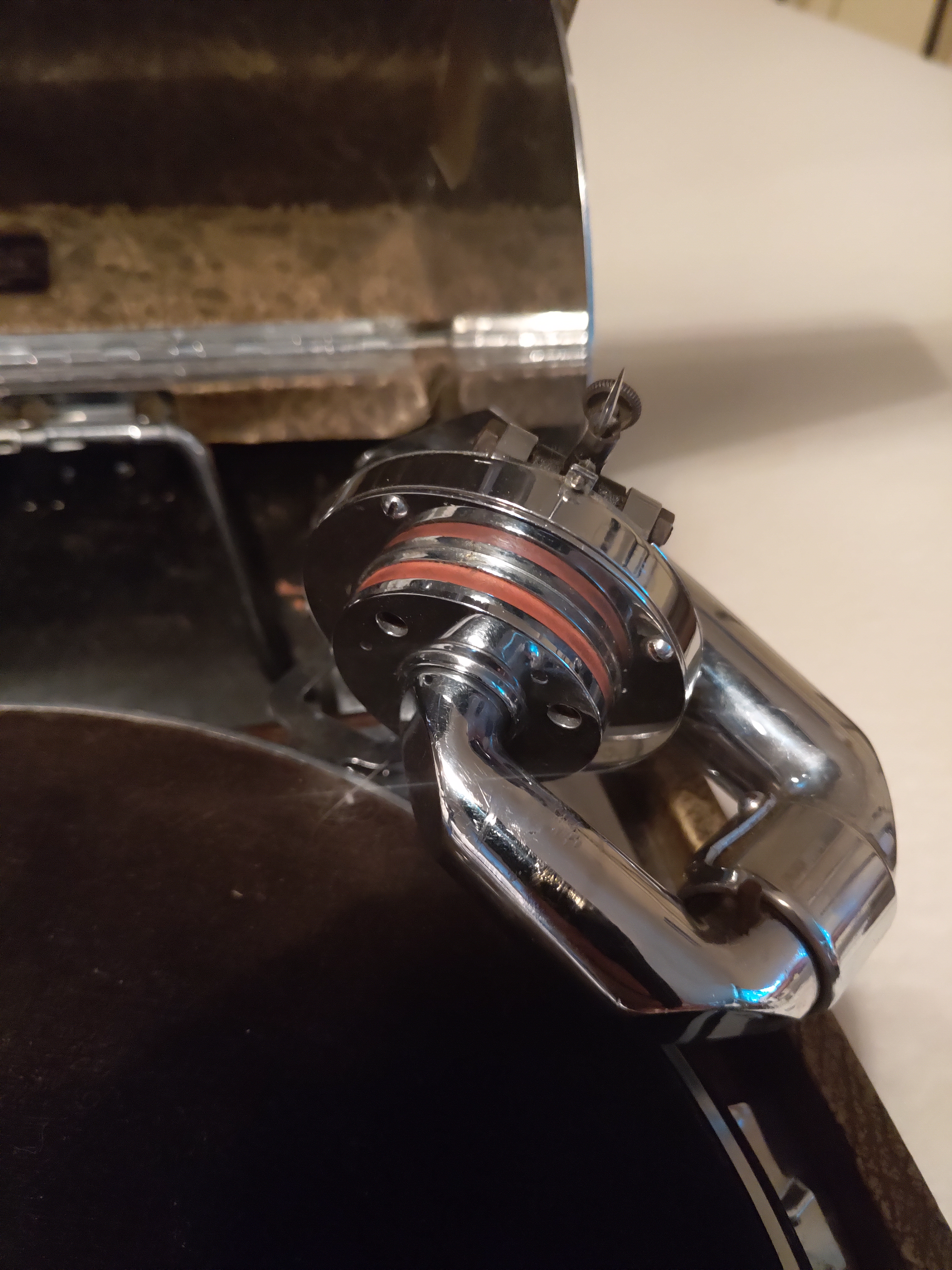 This machine was given to me without the crank, and also has no reproducer. The reproducer is relatively easy to replace, but I can’t get the motor out yet to have a look at it, so the crank end shape eludes me. There are a couple of rusty screws holding down the remains of the motor board that won’t come out, and I will need to soak with penetrating oil to get them free. If one of you could measure the crank, so I can seek out or make a replacement, I would be most grateful. The motor does spin freely, and the arm looks to be in decent shape.