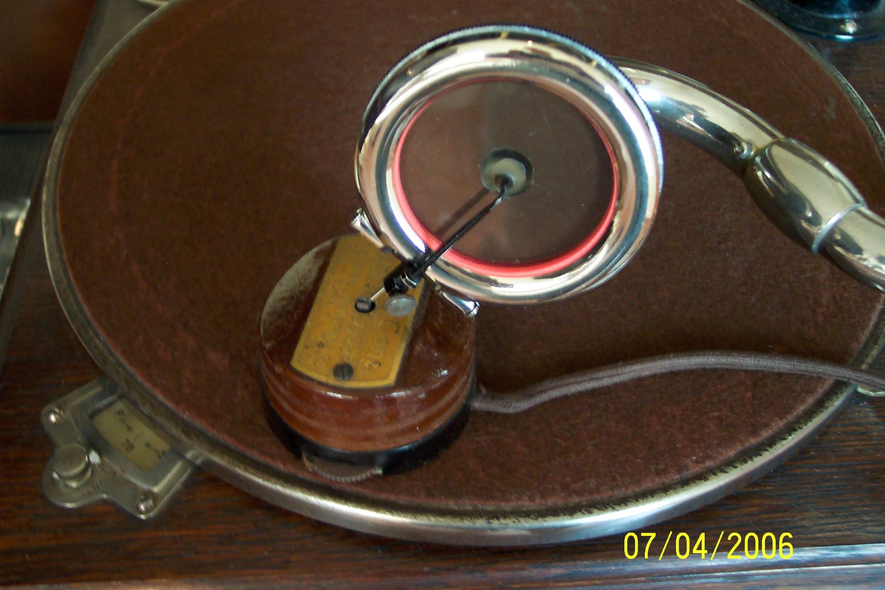 Here's some pix of one I bought at the Union show 15 years ago. It actually worked reasonably well. As stated in an earlier post, it does take a bit of power to drive it. I was able to attach a CD player to a keyboard amplifier and connect the external output of the amplifier to the Dulce-Tone needle gizmo. Imagine listening to ABBA's "Dancing Queen" through the horn of an HMV 32. :monkey: