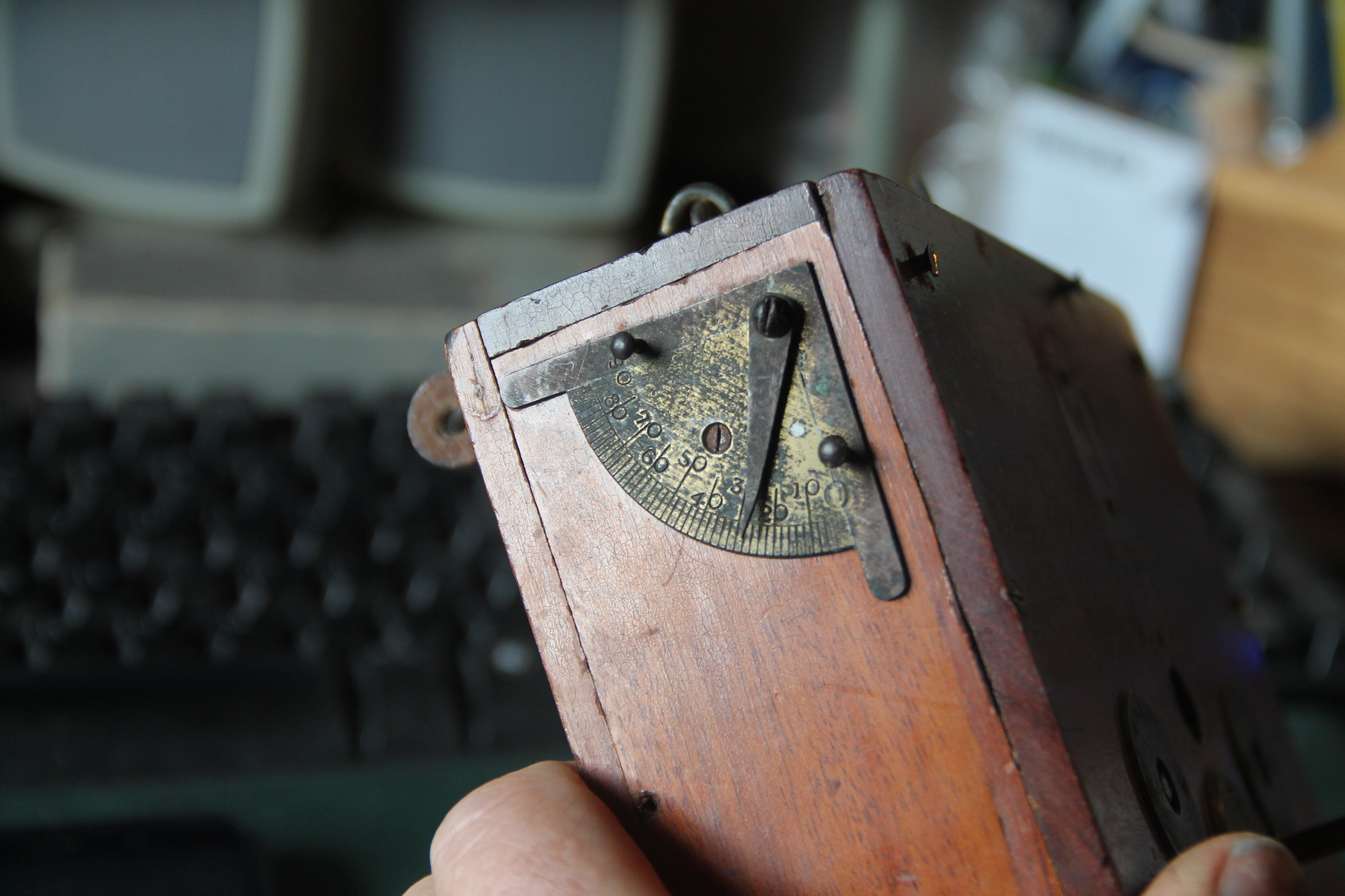 For completeness I have added photos of the top and a curious addition on the side. Fast and slow lever on the top is what started the search in Graces catalogue. I could never understand how you could have a fast and slow 1 hour revolution. There is nothing at all on the back of the box.