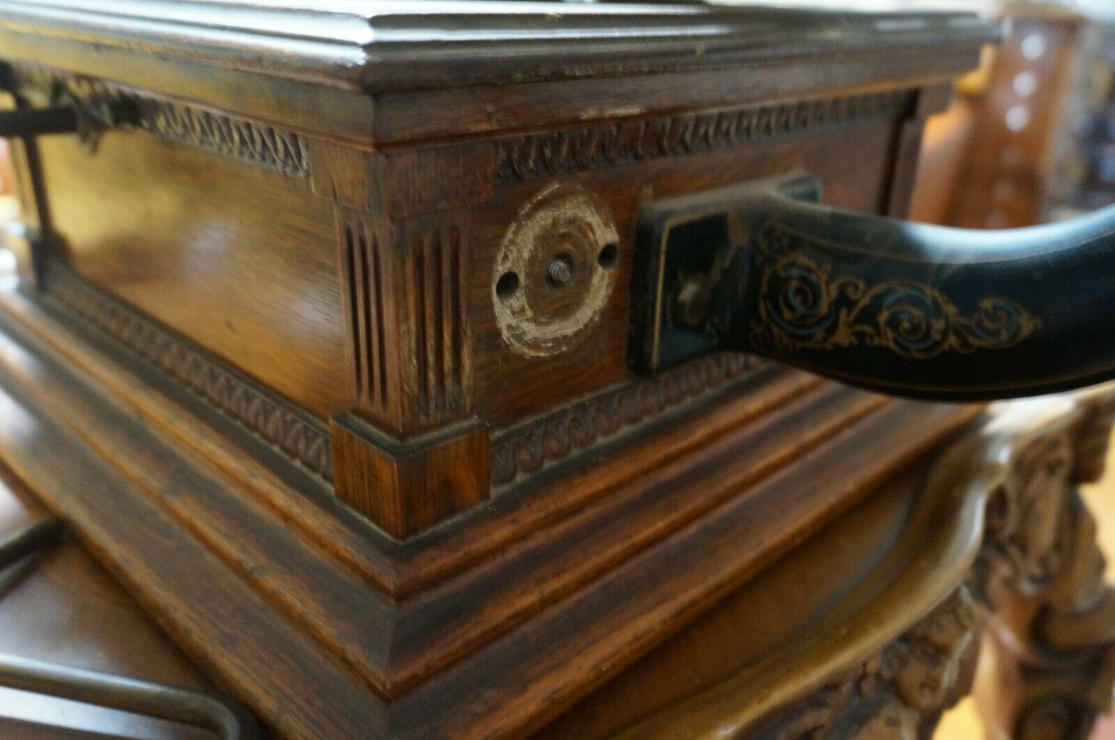 Some in the past, have suggested that it was used to support a small tray that held needles, etc. This rod at least has the look of age and of possibly having been with the phonograph for a very long time, maybe since new. If so, this would seem to suggest that the "tray" theory may be a valid one.