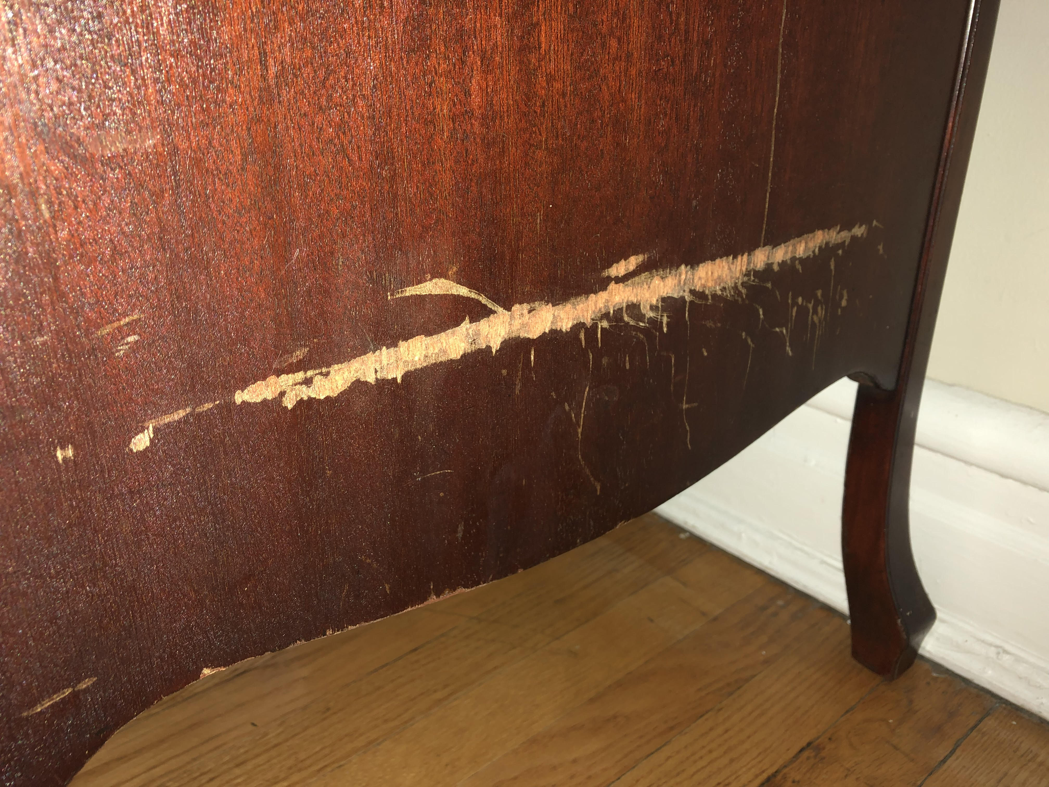 Hello all, I'm the steward of my VVX, a family heirloom gifted to my great-grandparents on their wedding day in the mid-1920's. I've resolved myself to touch up the finish, first using Howard Products' Clean-A-Finish and then Restor-A-Finish. But first, I think I need to deal with a fairly deep scratch on the side of the VVX. I don't expect or want the machine to be 'perfect', but I do think that a light sanding before Clean-A-Finish & Restor-A-Finish go on might be smart. If the sanded area doesn't accept stain, I thought I'd hide the area using a stain marker. Anyway, I'm a definite novice at this and was in search of advice as far as what kind of grit(s) I might use. A couple of photos are attached and any guidance is appreciated.