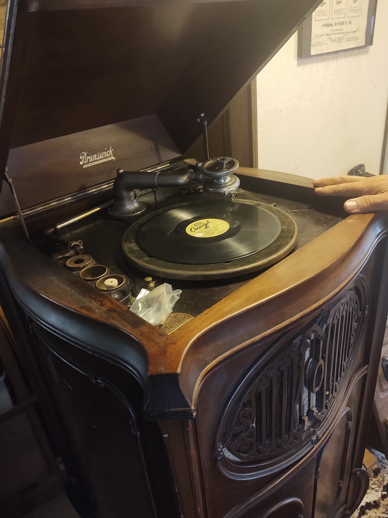 Hi , I am parting out a very uncommon Brunswick Walnut 135, Everything on the machine is available to help you complete a machine you may be wishing to restore, the large 4 spring motor is complete and working, tonearm and reproducer functional, unit has , name plate, lid hardware, unusual horizontal pull out record drawers, lid lock etc. Any of the often missing wood trim can be removed if you are in need, the trim could also be used on a mahogany model. The grill is complete but has some damage , sadly the nail in the coffin on this machine was that the original lid had been replaced at some point with a lid from another Brunswick upright. PM if interested in any parts and I will give you a price, or buy the whole machine. Thanks Larry