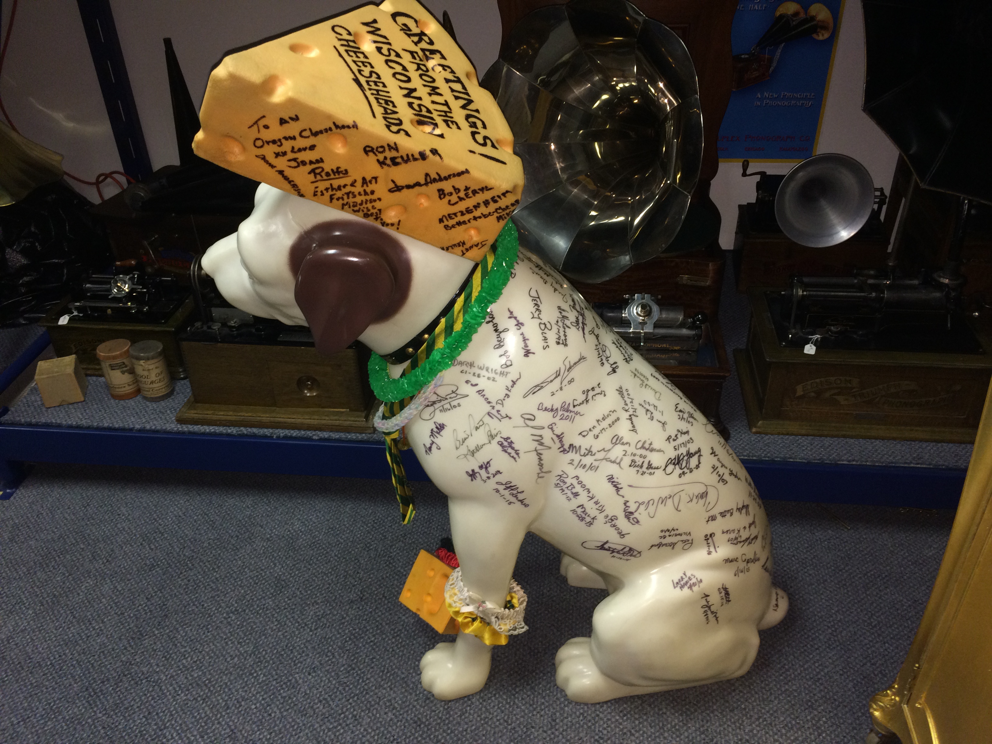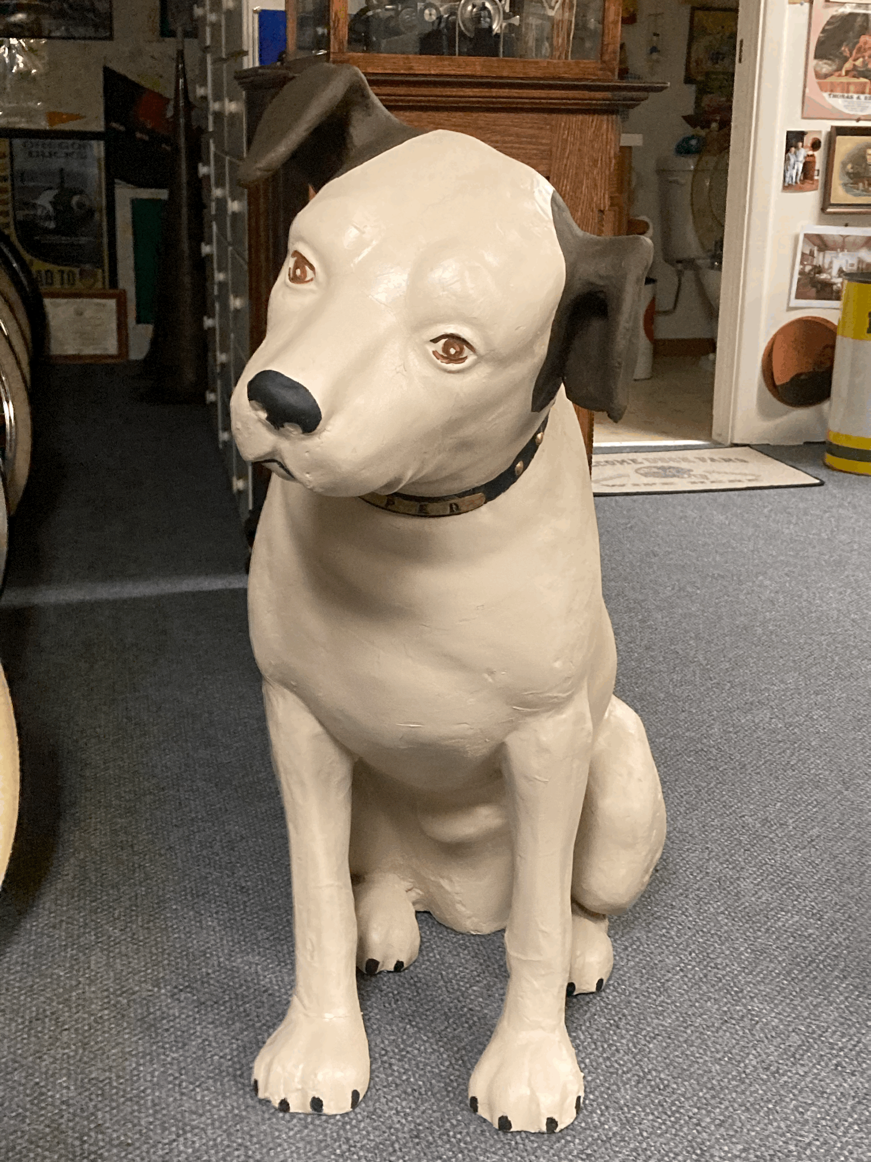 The top photo #1 is a large paper mâché Nipper that was missing his right rear foot. Photo #3 is the same Nipper after repairs. The large Nippers were sold to retail stores and used as a type of advertising. Nipper found himself outside subject to threats from weather or being climbed on by unsupervised kids and those that survived often have signs of repair and/or several layers of paint.
