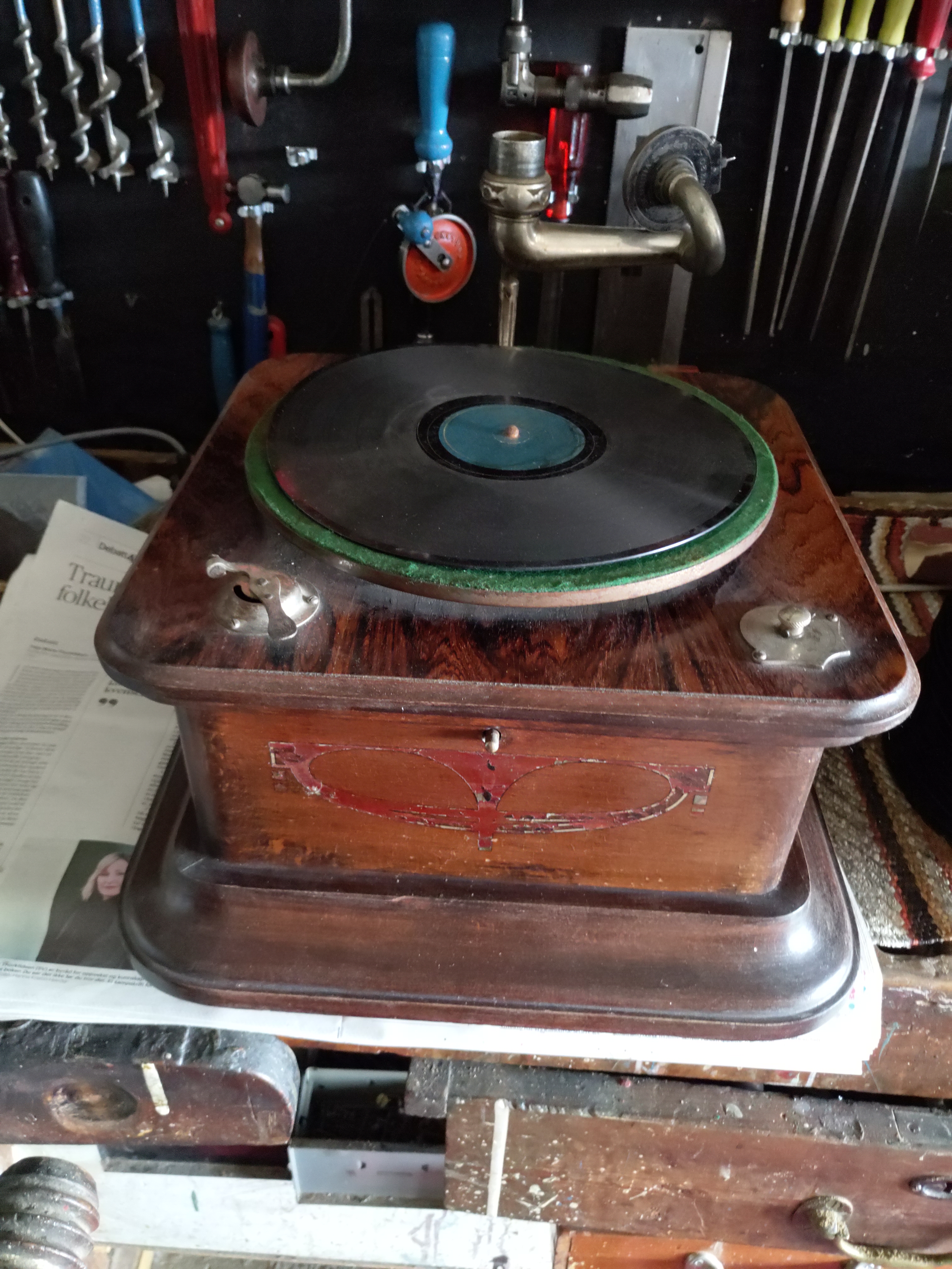 I quickly saw the tonearm was not genuine, there was an extra hold drilled in the wood on the back side to attach the back bracket, and the horn is a small type of peackock horn, typical for the small Swizz horn gramophones of which I already own a few. The needle does absolutely not reach the spindle area, and it was when showing this to the seller, he said I could offer what I wanted for the machine, if I wanted buy it.