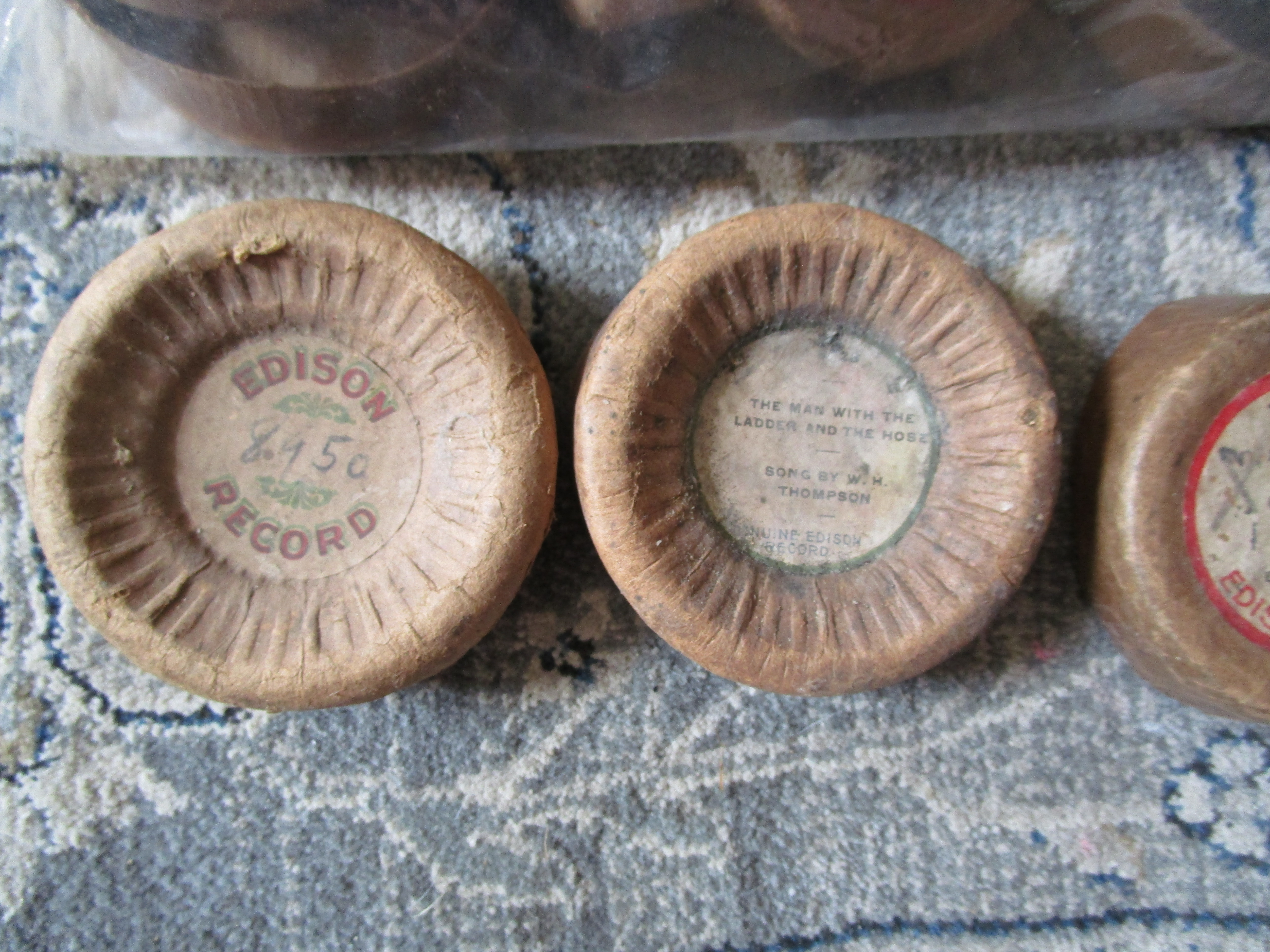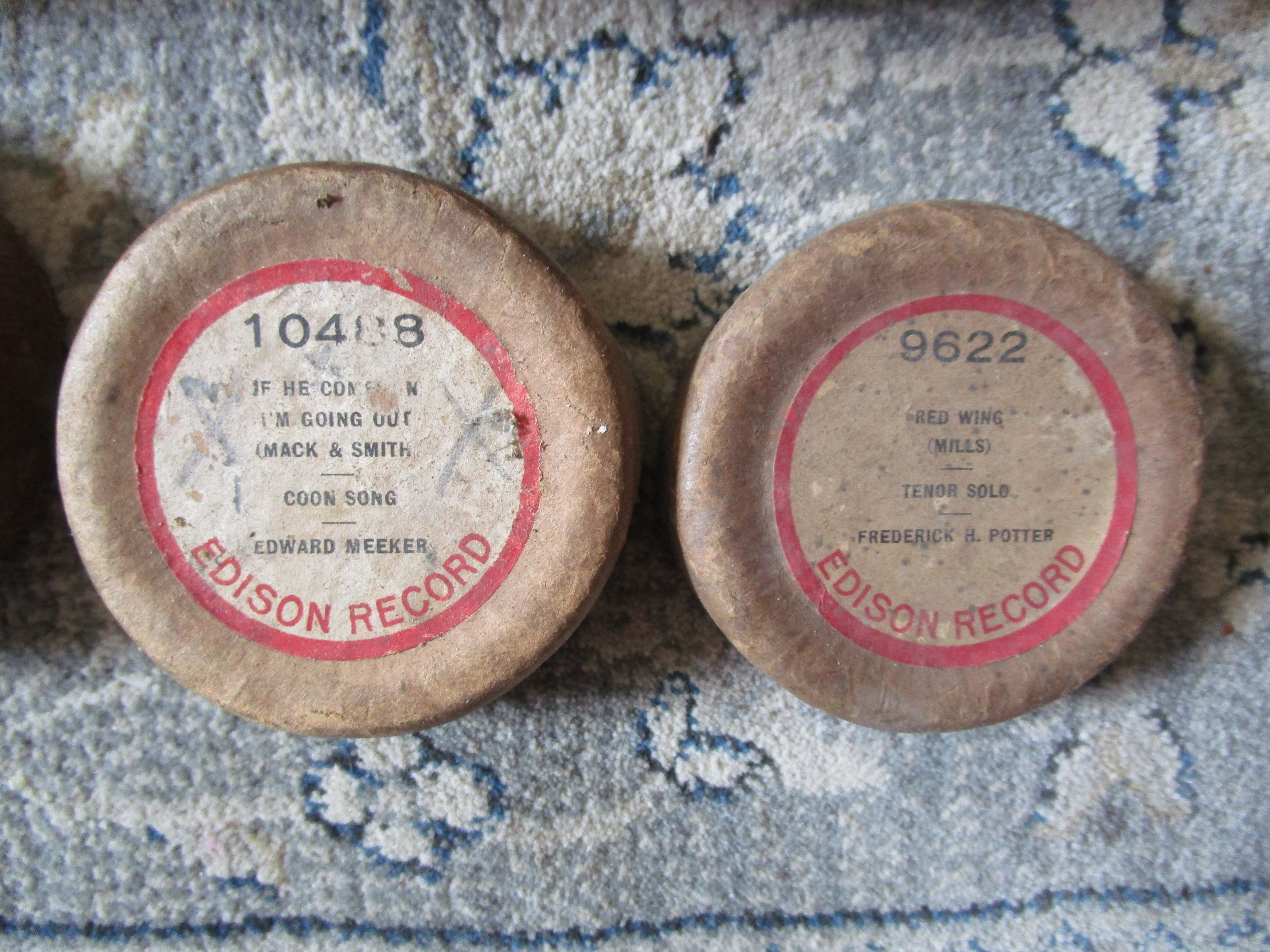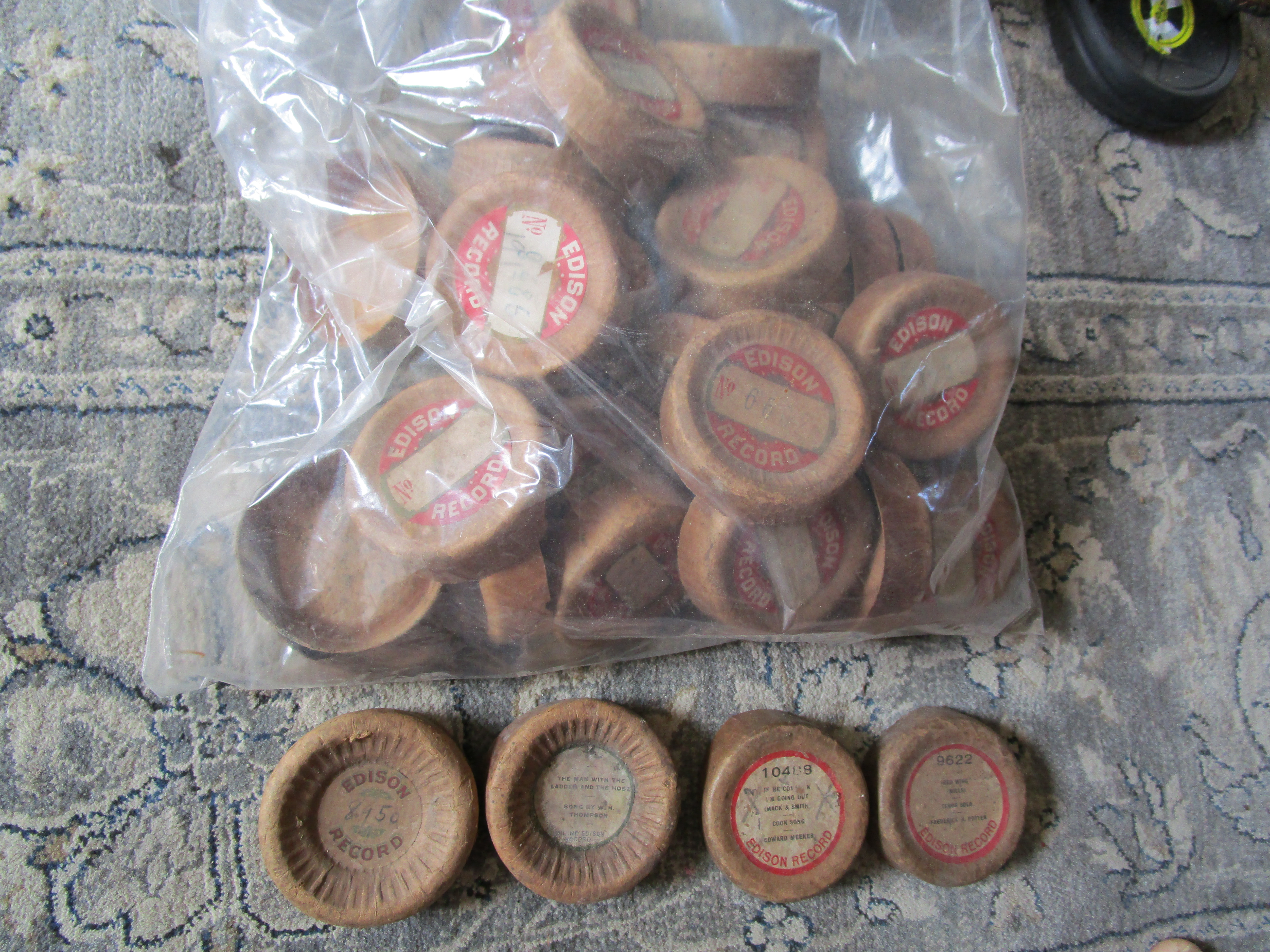 There's about 45 of the Edison 2 minute black wax cylinder lids here. Most in very decent condition. Couple of the early larger size ones that used the inner cardboard core box and a couple of the later ones with titled lids. PM, PayPal Friends or check, USPS extra.