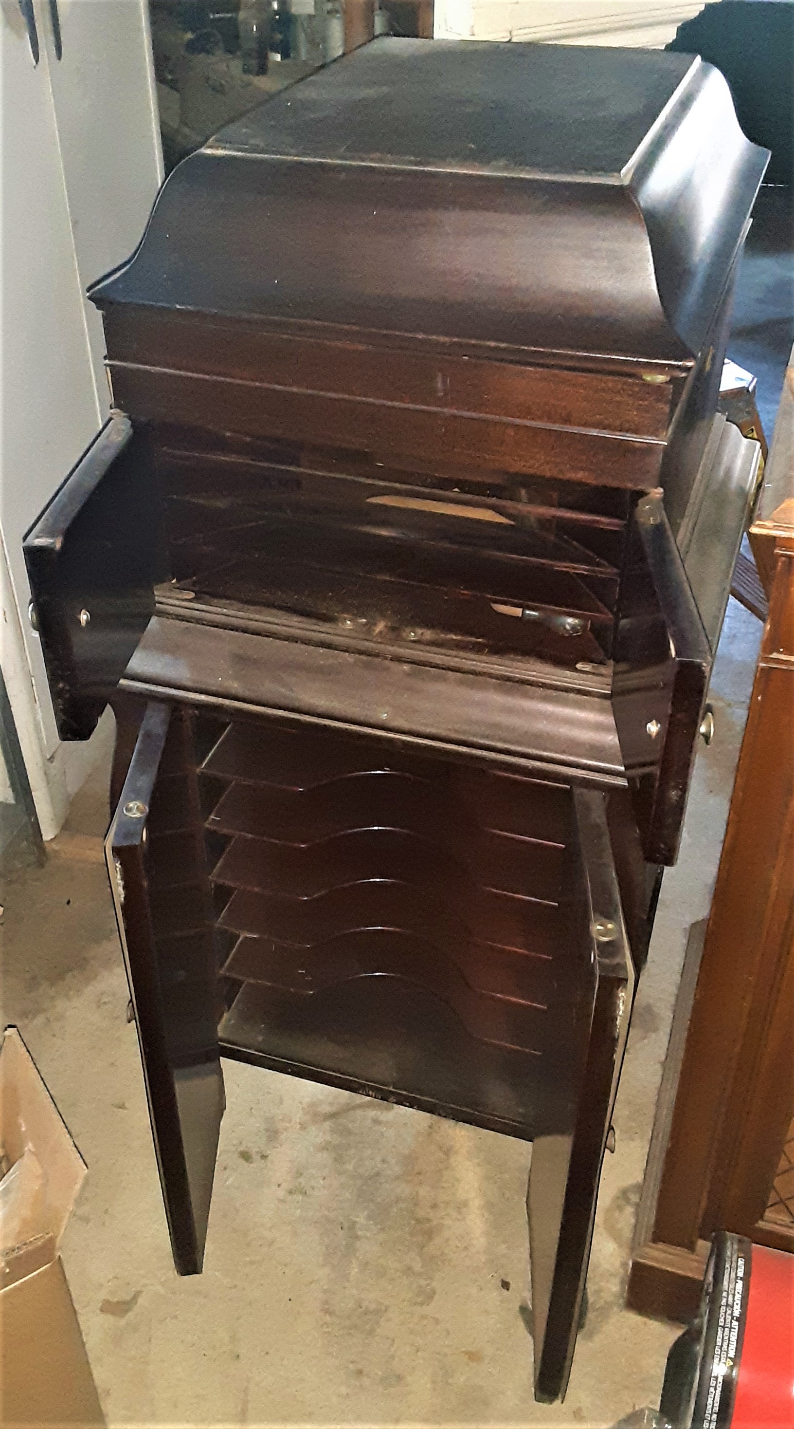 Any record cabinet that is designed for one specific machine is desirable. I've seen a number of cabinets like this one and have always admired the clever design. I think at $300 it is worth considering an offer, perhaps $225 cash.