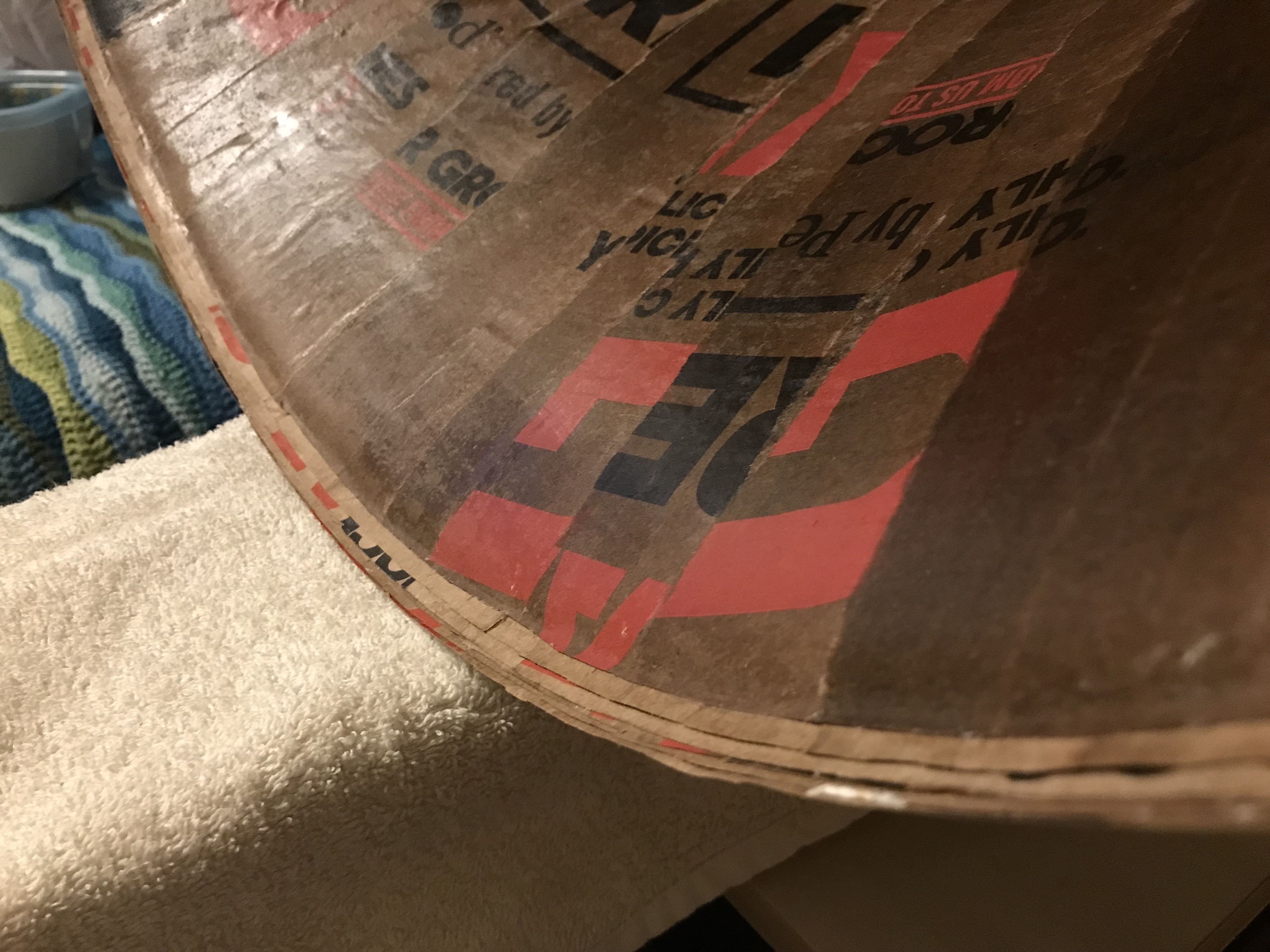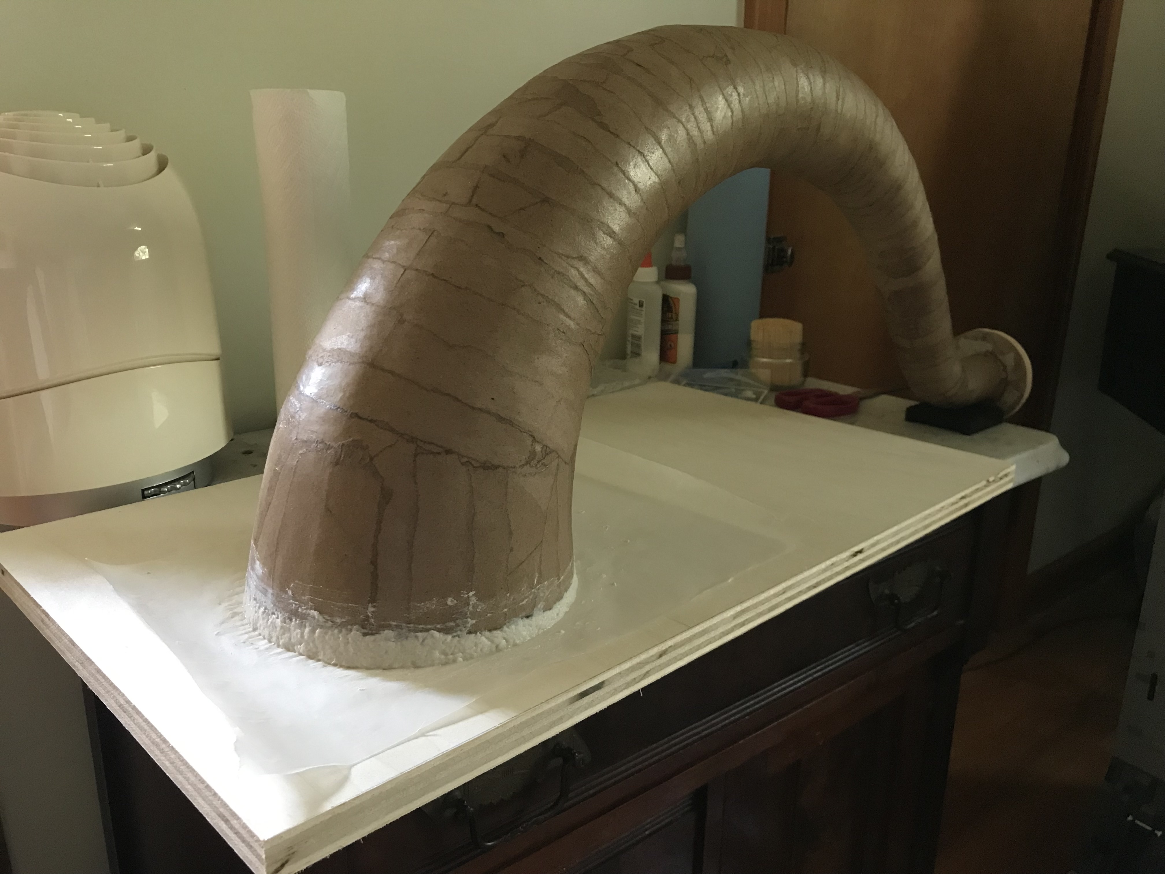 More progress—I filled in the ragged end of the neck with paper mâché paste, added a couple layers of paper over the whole section, glued the wood mounting ring in place, fastened the horn together for some more testing, and cut off the uneven edge from the mouth. Technically, the horn can support itself, but it’s rather unbalanced on the small cabinet and the wooden keel isn’t in place yet, hence the bridge lamp holding it up.