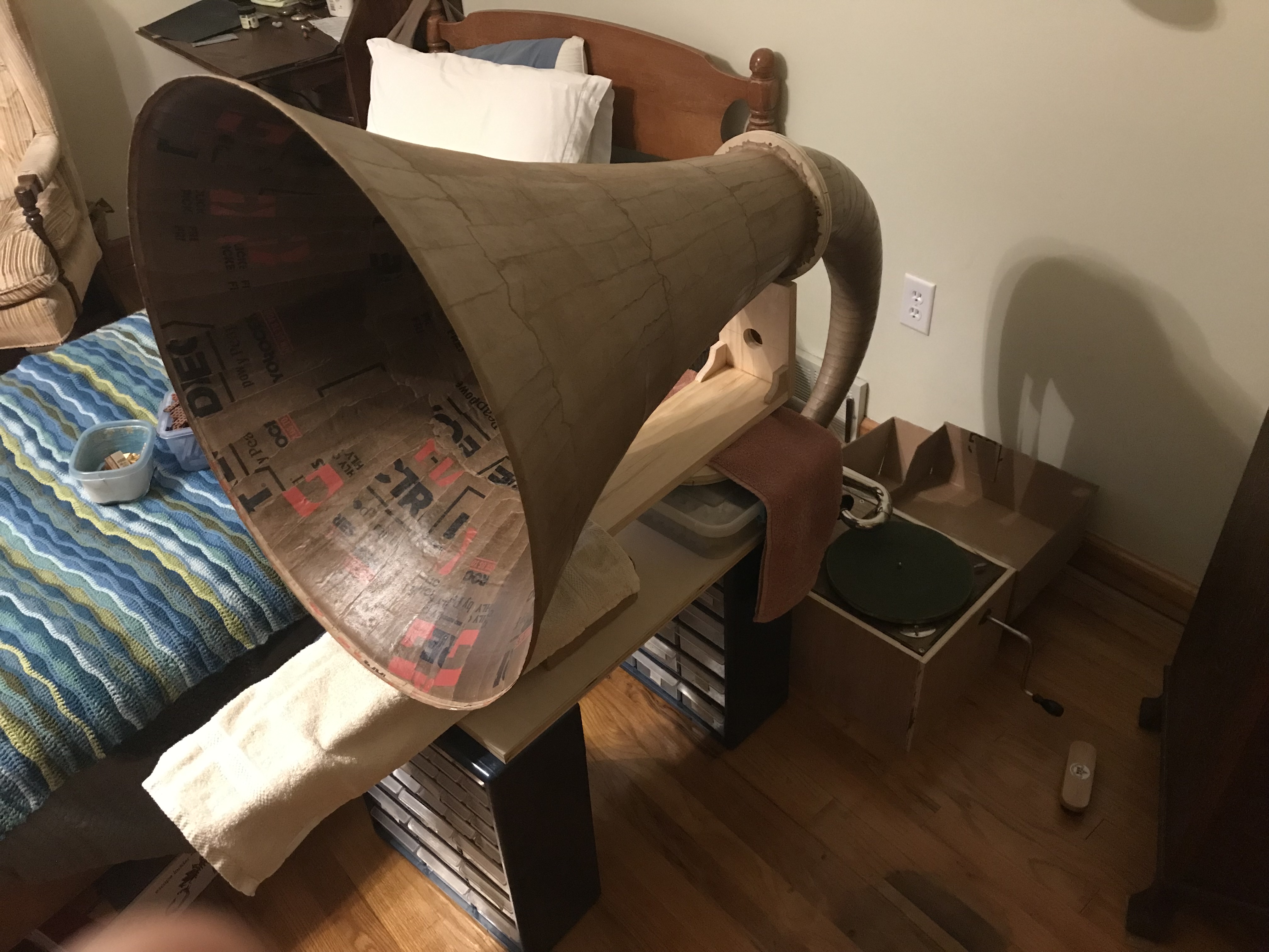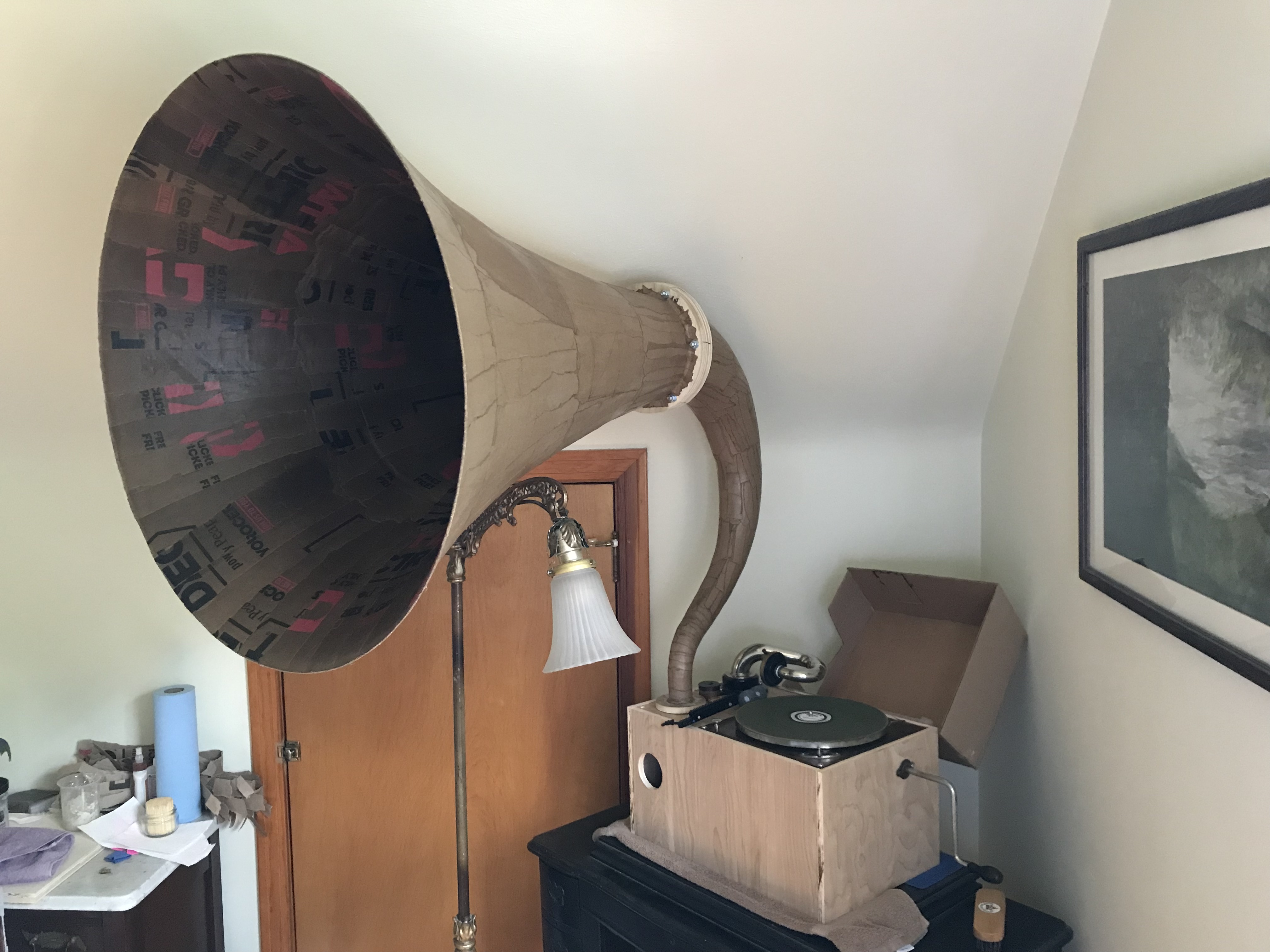 There’s a rather sizeable gap between the neck and the mouth, but even so, the paper horn’s sound is much better than the Alhambra’s; there is more bass, although presumably not as much as there will be when the two halves are sealed properly, and it sounds generally clearer and fuller—it even makes my one Brunswick Light-Ray electric sound almost good.