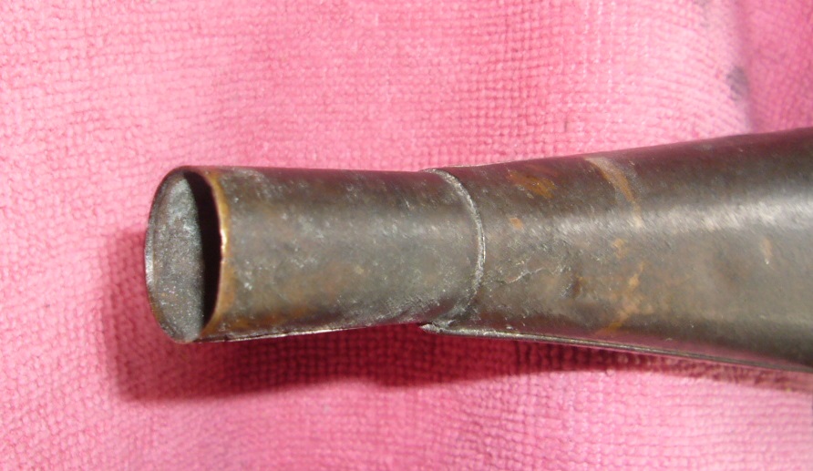 I recently bought a phonograph at auction which came with this 42" brass phonograph horn, the end of it has come off, broken away at the solder joint it seems, but I'm not sure what the original end would have looked like, the opening is ⅞", so it's too large to simply have a straight tubular section there, it should taper down more, but I can't quite visualise how it would have been done in order to make a new piece, does anyone have a similar horn and may be able to provide photographs?