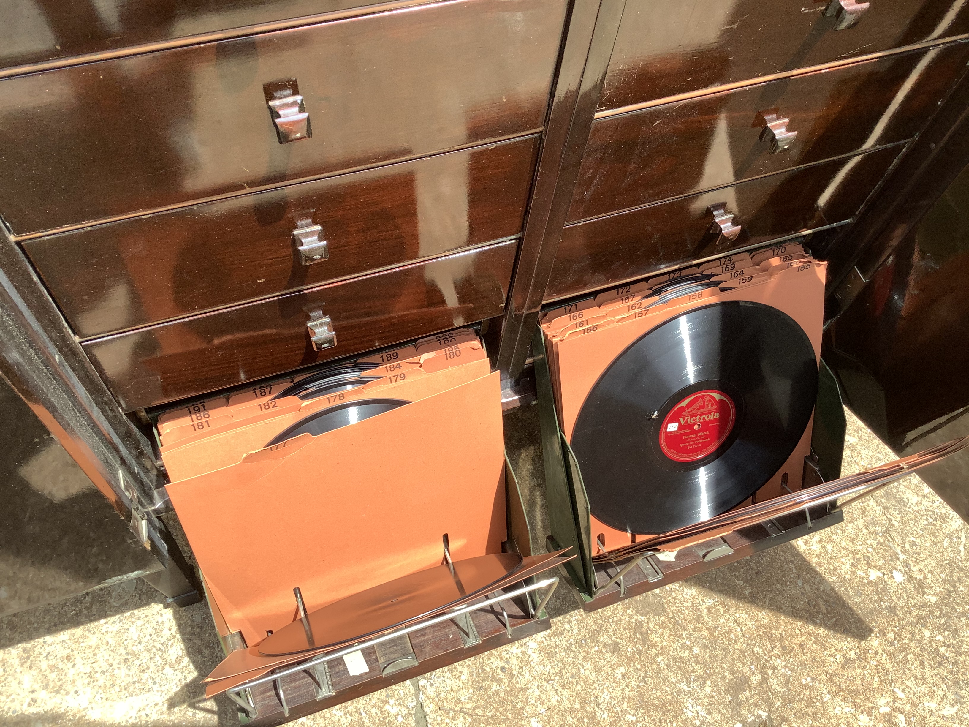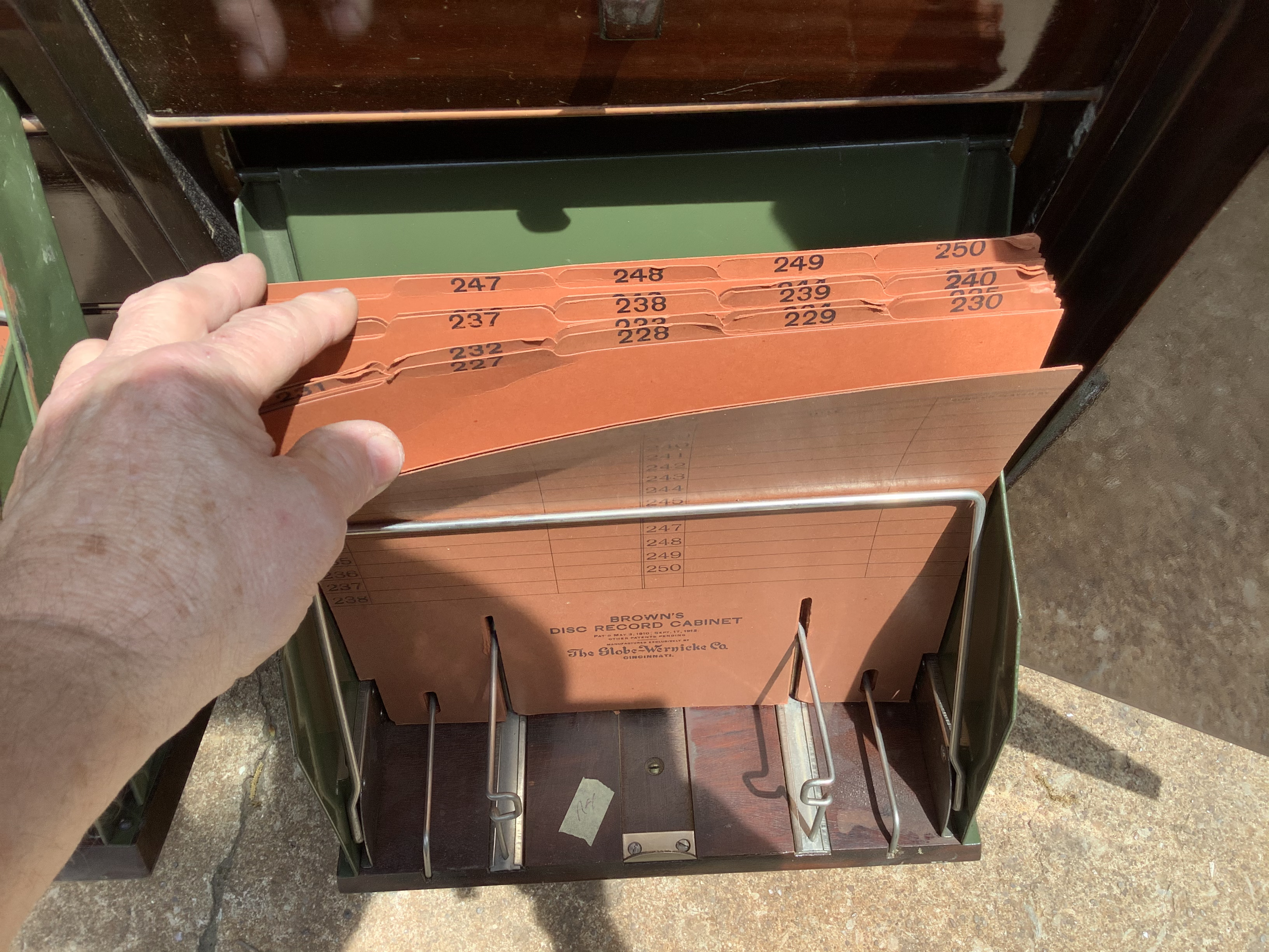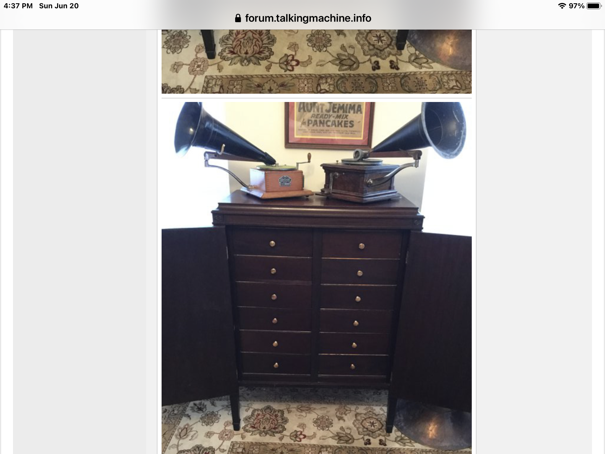 We have a beautiful Globe-Wernicke record cabinet for sale. If you have never seen one of these in person, they are as high of quality piece of furniture imaginable. Beautiful mahogany construction, tilt drawer mechanism that puts your precious record collection at your fingertips. This example has a wonderful original finish. The outside is darkened and alligatored, but throw open the doors and you can see the magnificent original mahogany piano finish in its glory. Enjoy as it is or an easy refinish of the outside will blow your socks off. $750 , we are glad to safely store until pickup is arranged. There are people in the hobby that offer blanket wrap service, and this certainly deserves that treatment. [email protected] to reach me, and we are located just minutes from TA Edison’s birthplace, so kill two birds with one stone!