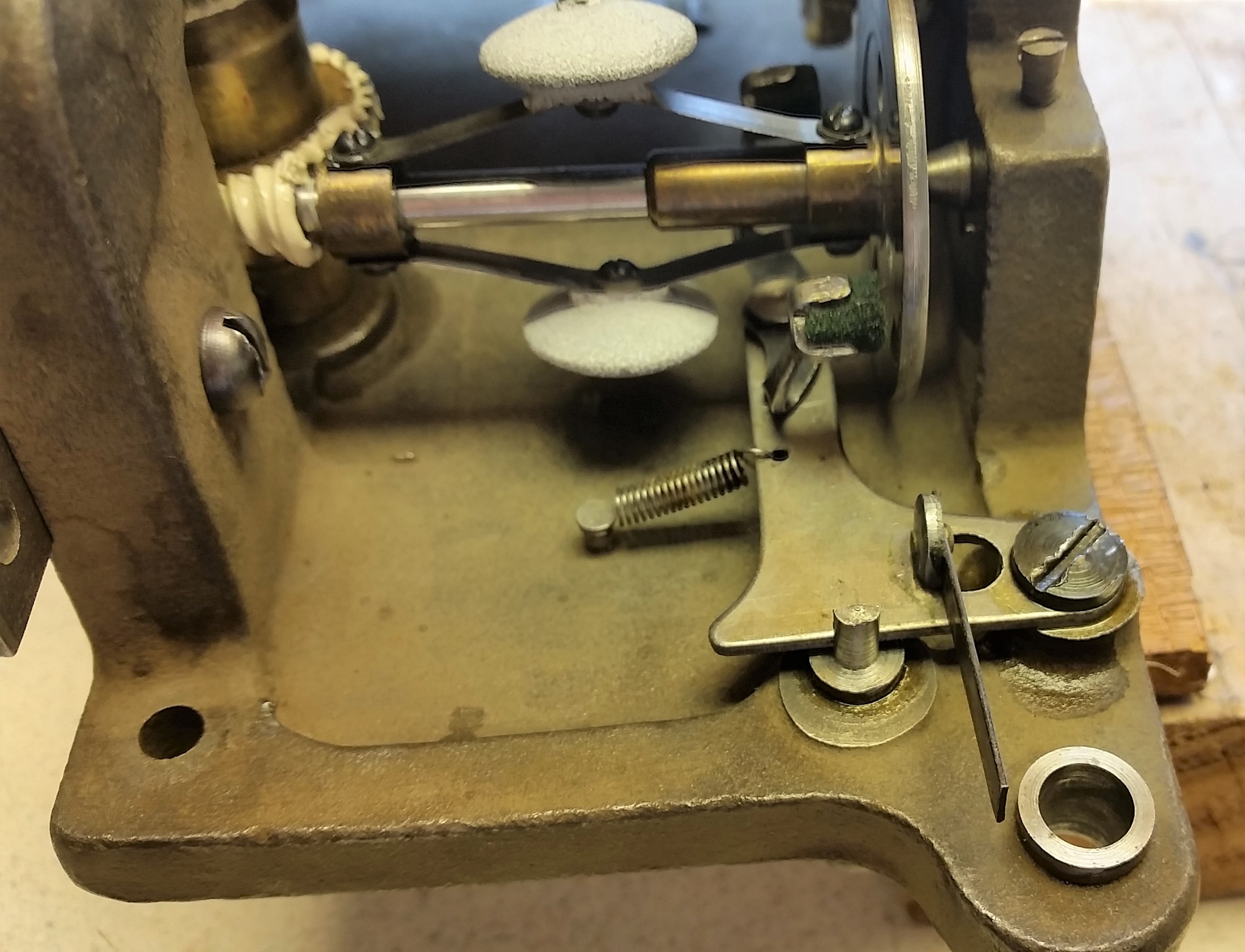I like the engineering here. One setup to control both the speed and brake. Blue arrow for speed through one cam for the felt pad. Red arrow for brake on the other felt pad using a cam. I put a drop of oil on each felt pad.