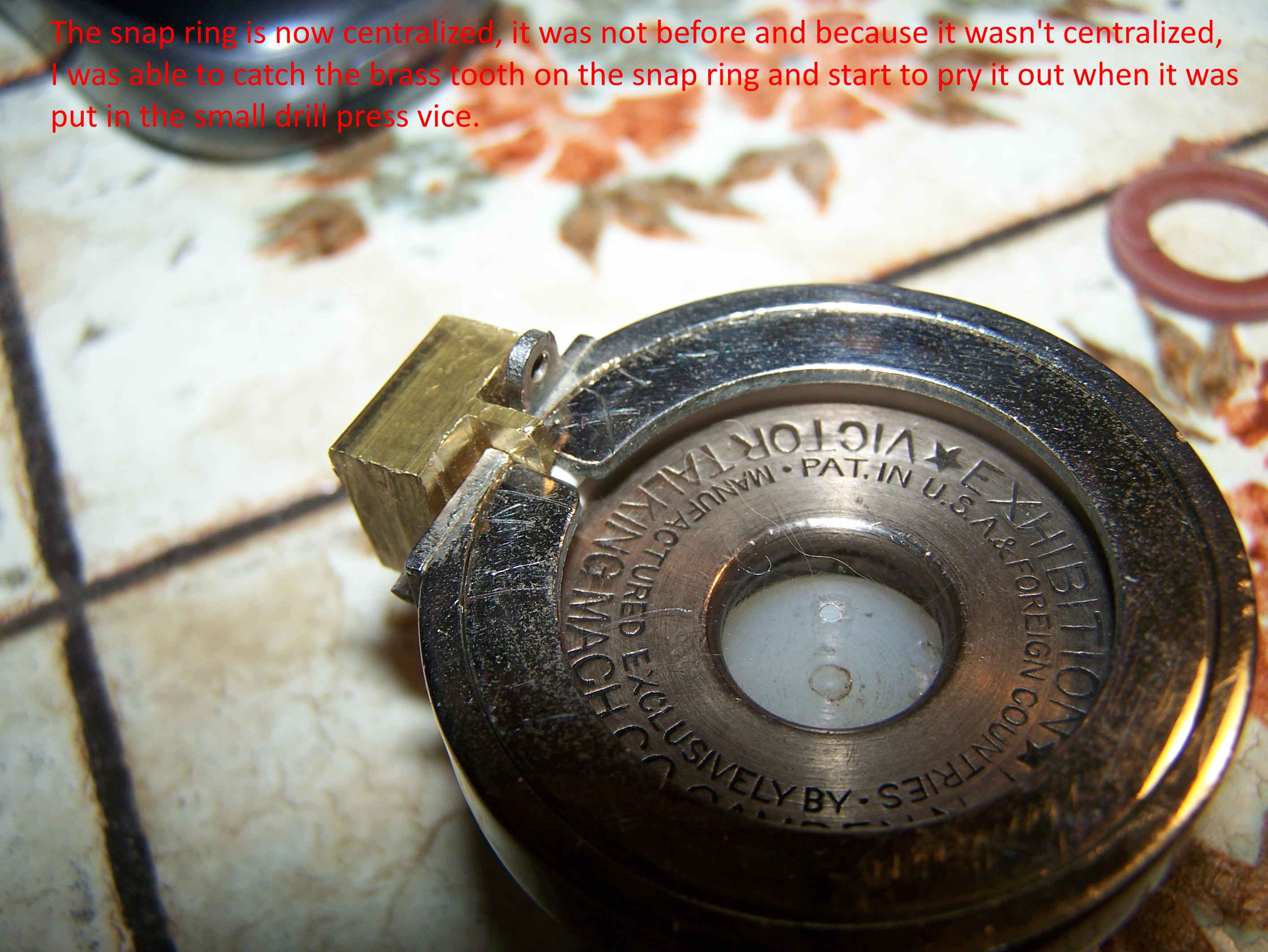 I used a small drill press vice to gently squeeze the snap ring with the brass block so I could start working it out with some jewelers screw drivers.