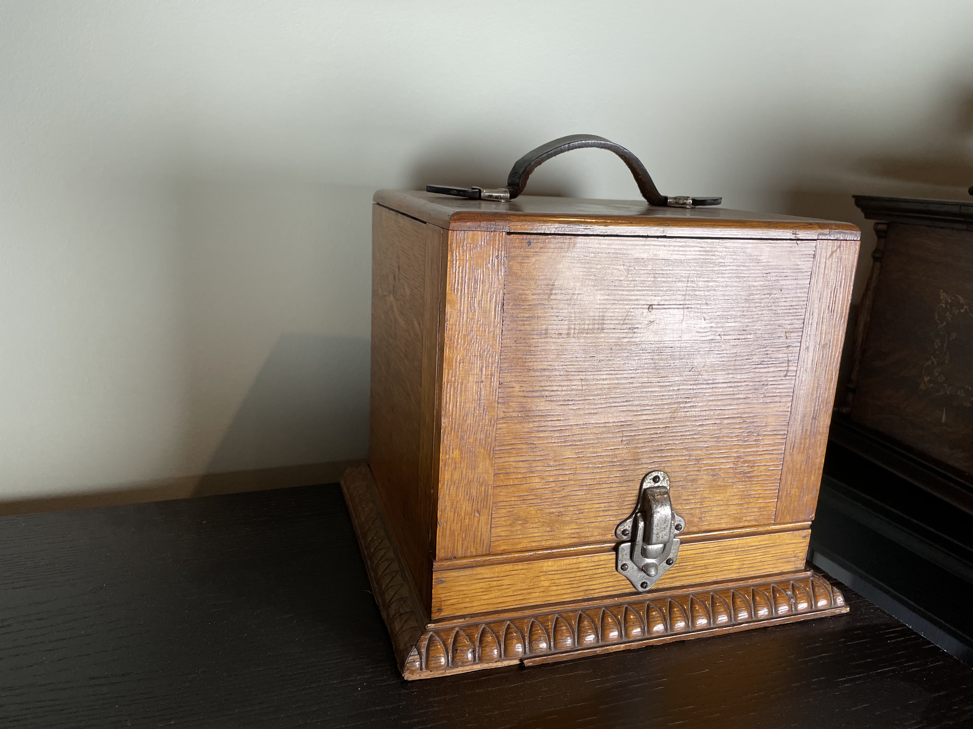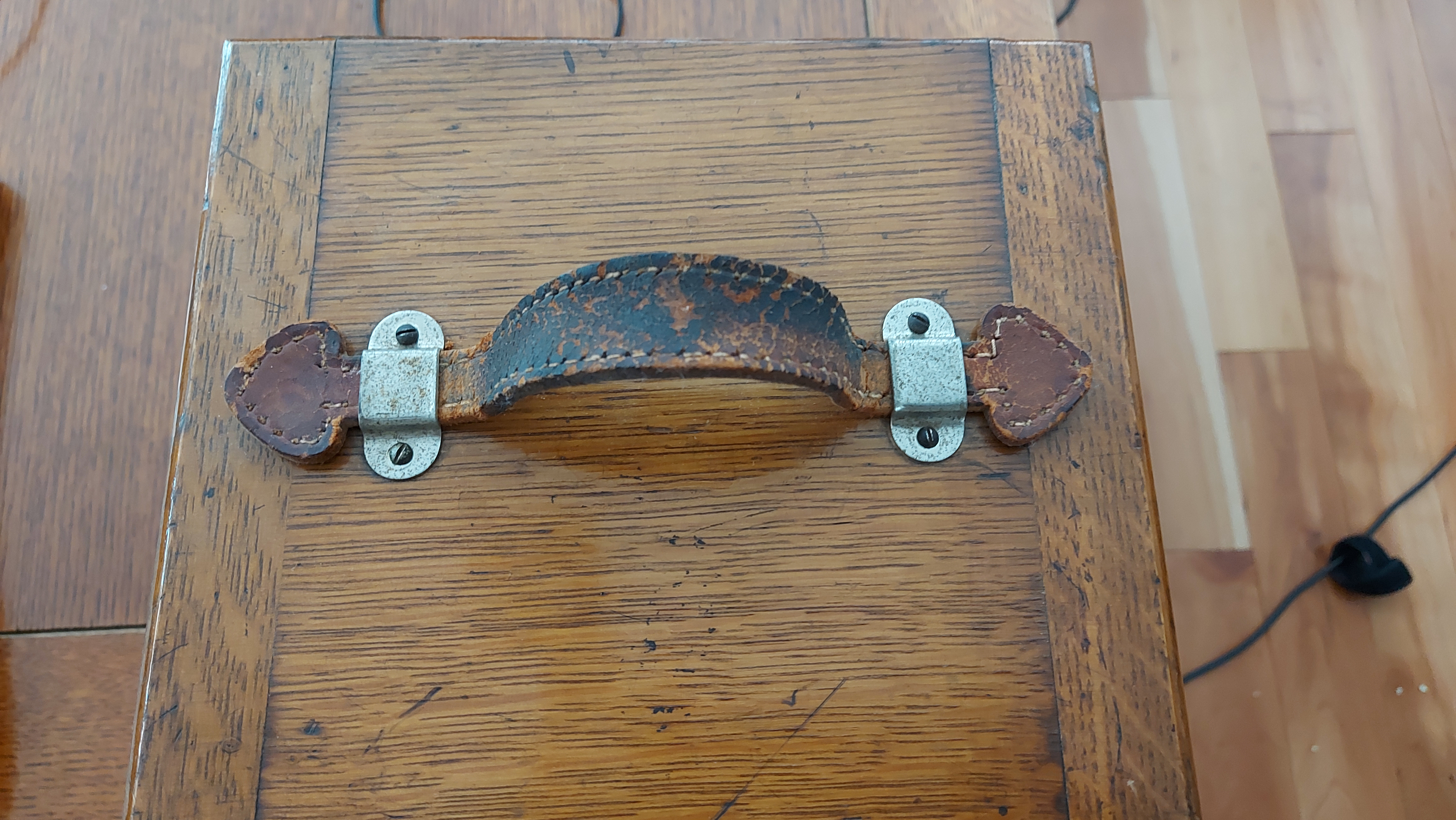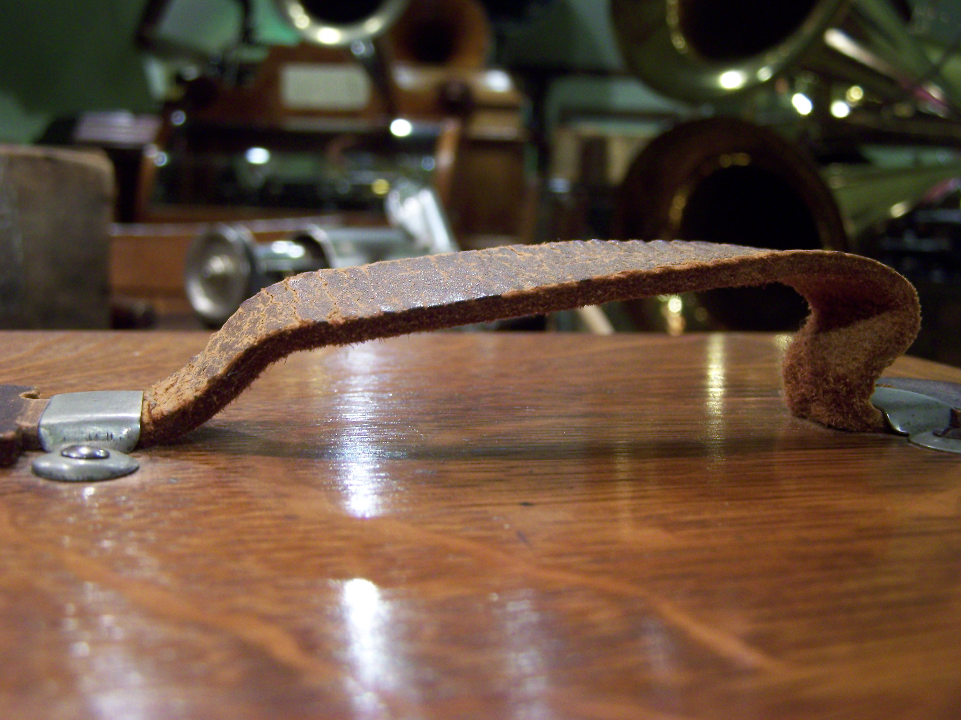 Would anyone be able to share a closeup picture of an original leather carrying handle on a Berliner record box? Mine is missing and I am going to make a replacement out of leather strap and I would like to get it as close as possible to what the original looked like. Any help would be appreciated. Thanks Larry