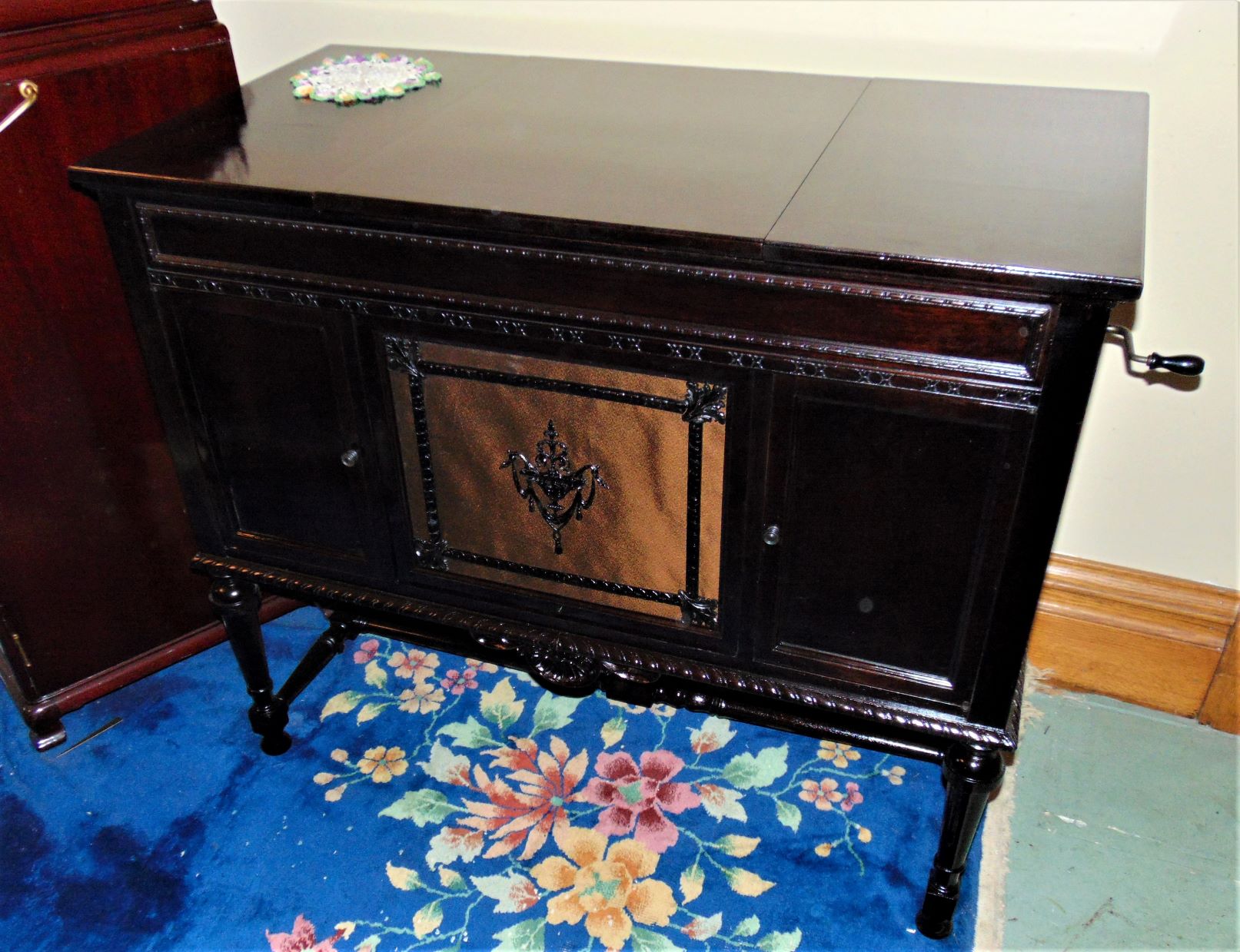 Anyway, it's pretty much done now except I need to put some new domes of silence on the feet and maybe a few other things need tweaking. This is the second from the largest of these machines. I'm refinishing three of these right now and the other two are the two smaller machines. I have to say, it's very well built. Edison must have gotten a good deal on piano varnish and it was really laid on thick on these things. This one had more varnish on it than the two smaller one's did, so it was probably shiner and more of a 'formal' finish than the two smaller machines. The back of the cabinet on this one has mahogany veneer on it, and the two smaller one's are birch. There are just some subtle difference between this one and the two smaller one's. It's really unlikely that most purchasers, or even Edison dealers would have been aware of any of that. Or probably care for that matter. These machines were very dark when they were new. I left one of the areas under the lid alone and just put some clear coat over it so I had a reference point for color. Eduardo did a really nice job on the decal and it looks great. These things are about as much work to refinish as a small piano and I can certainly see why hardly anyone tackles these and refinishes them. Those stupid door hinges are very frustrating to get adjusted and even when everything's put back the way it came apart they will still drive you to distraction. There must be some tricks to those things that I don't understand. So, there are some of my thought's on this monster. I figured you'd like to see a couple of pictures of this thing done as they are actually nice looking when the finish is decent. If the core-wood was not telescoping issues into the face, and if a few other things were a little better on it I probably would have built the lacquer up more and put a piano finish on it. I was just afraid of putting enough finish on it to do that. And it's like they say about "Paint protecting itself from the elements, but exposing it to the critics!" A piano finish will definitely show all the blemishes. I have to say that I really like this thing. This is one style of phonograph that does not wear a bad finish well.