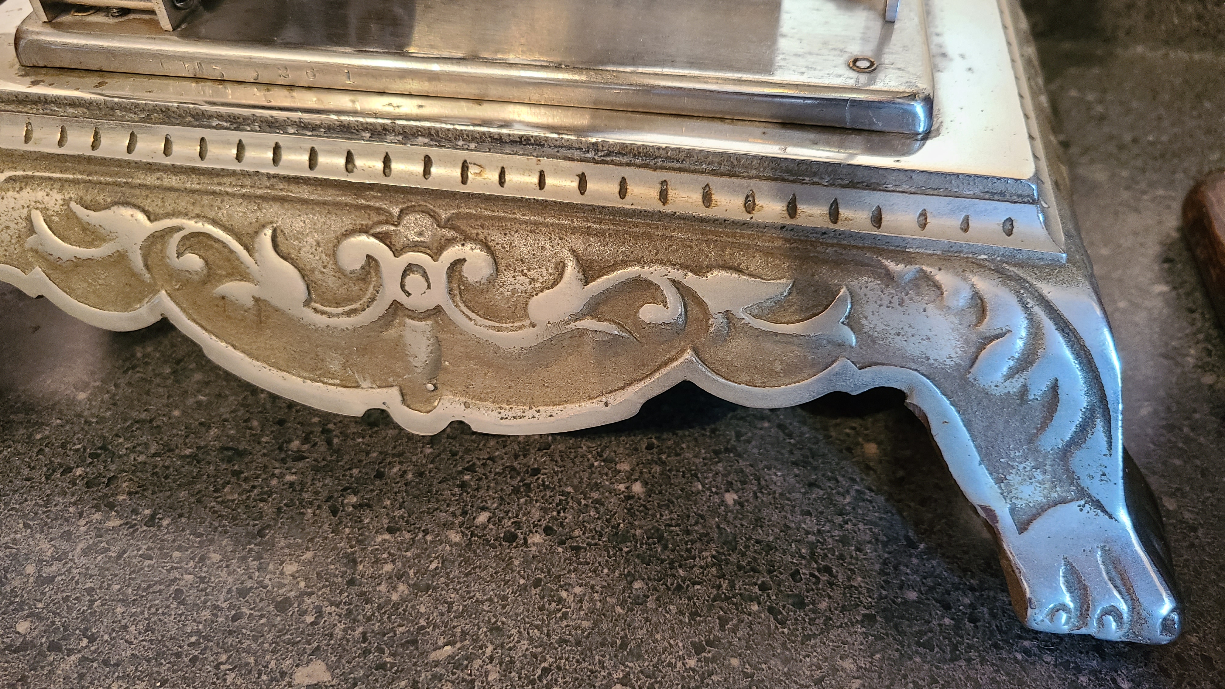 I wish I had better pictures, the machine is not in my hands yet. One thing I found interesting are the wooden/felt interst that were inserted in an indentation in the casting, something not present in the reproductions, at least not the one in this post. This is one of the main things that leads me to beleive it is original, but I could be wrong