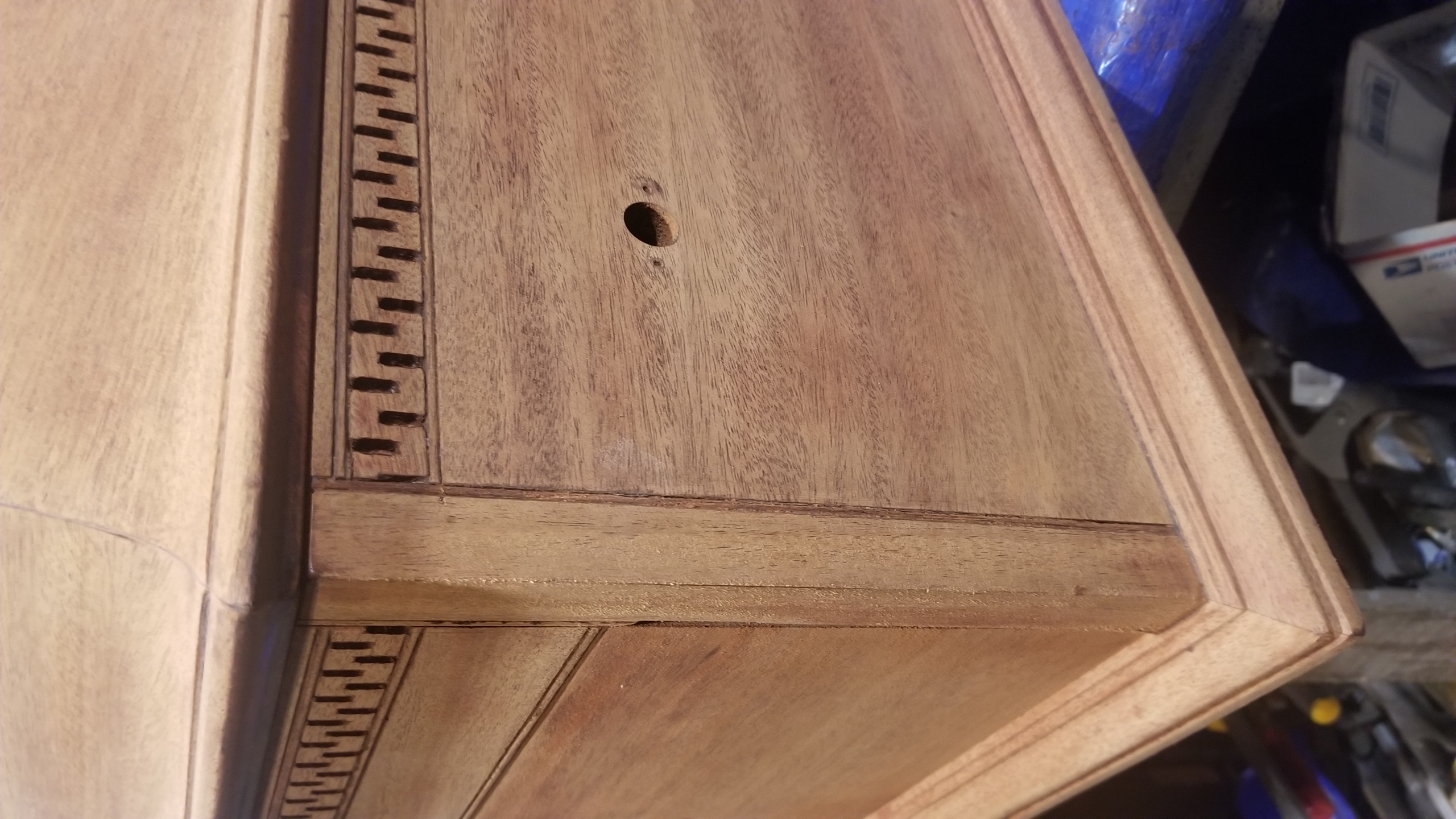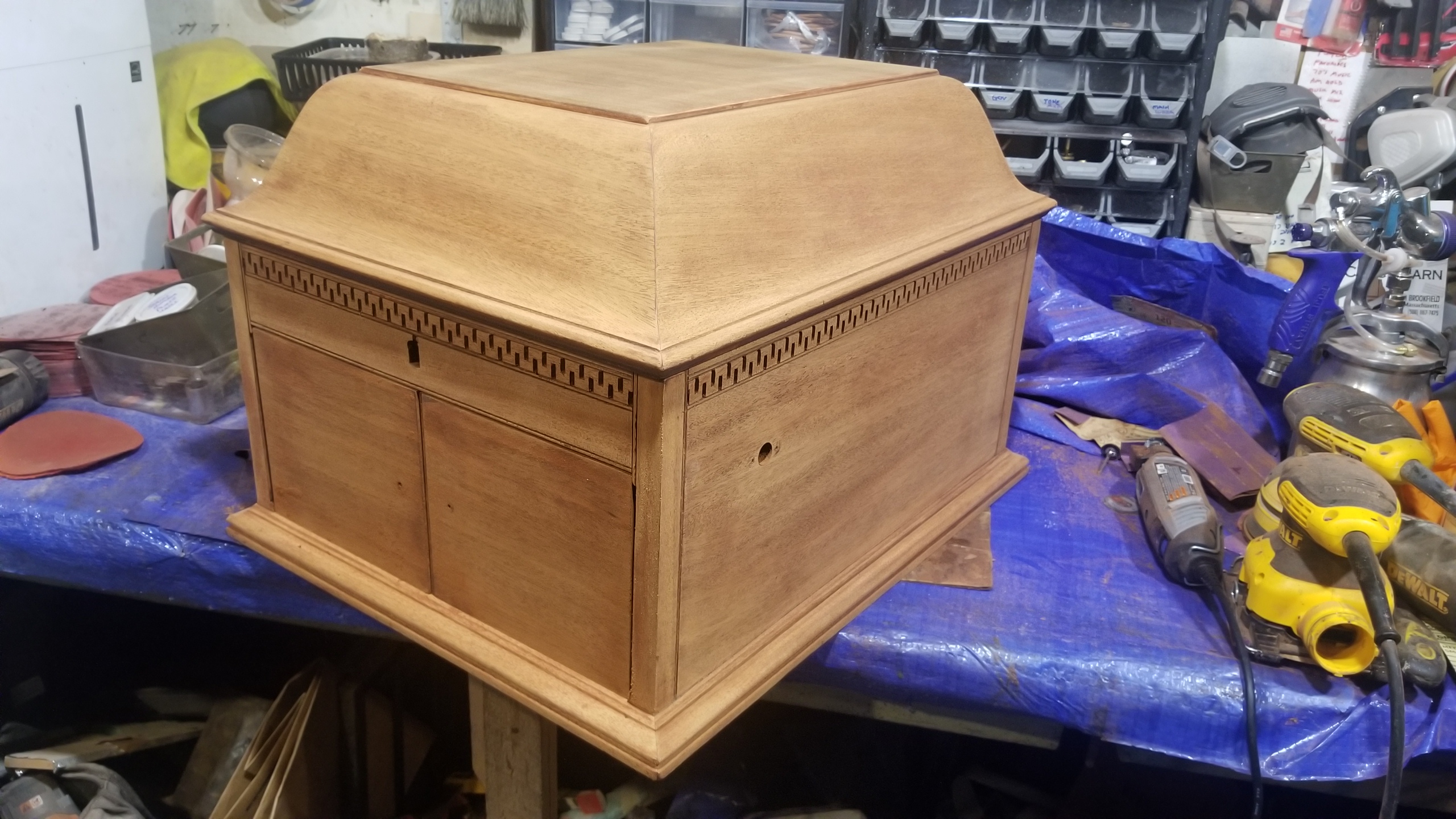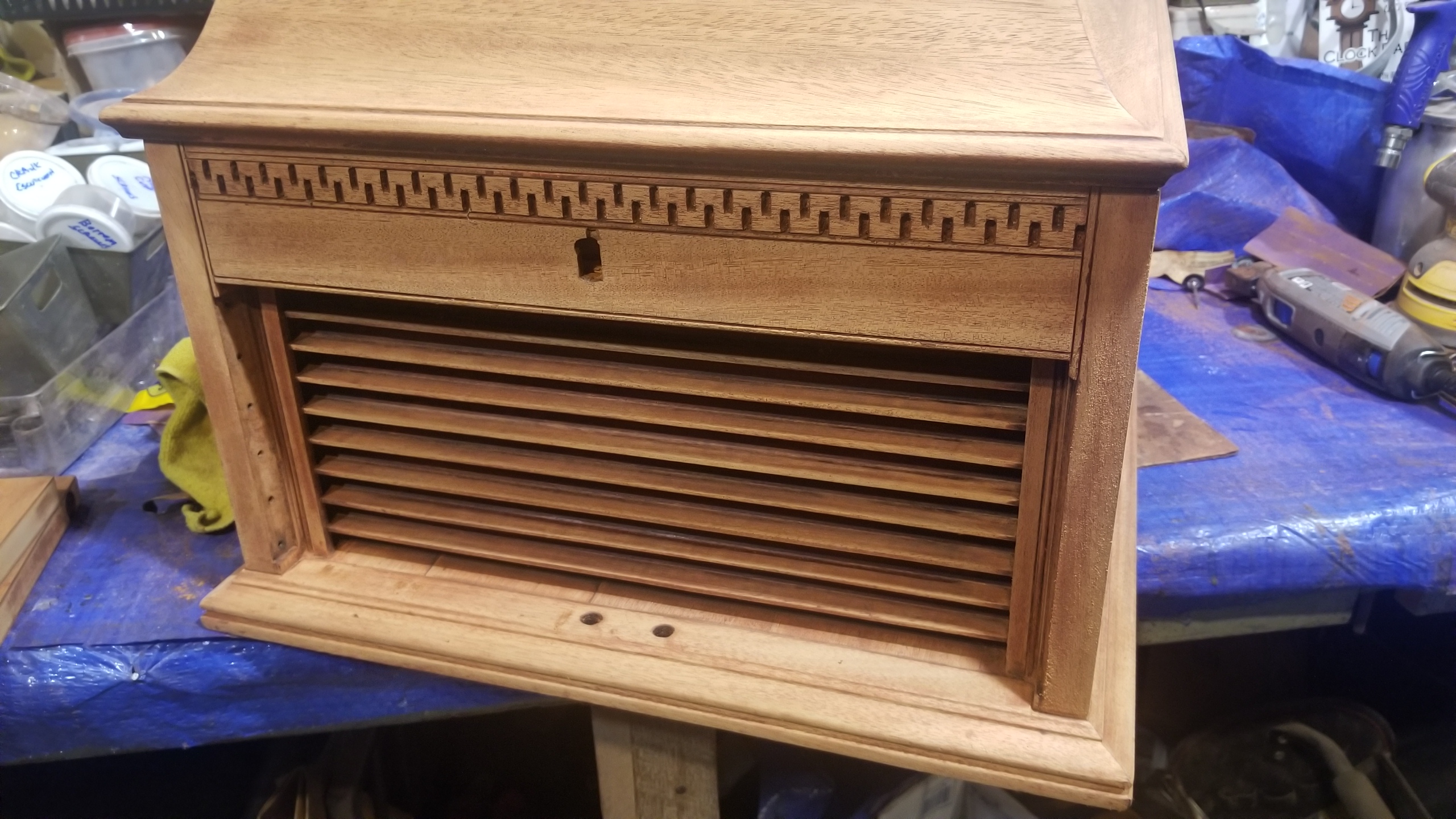 I started working on this 1911 Victrola VV-X table top restore thinking it was going to be simple like all the VV-IX i have done before but finding out there are lots of bead trim everywhere in addition to the wall of troy design around the top. Has a hood lock and even the horn slats are uniquely bent and well made. This is a very well made, impressive cabinet. I suspect it will be a real beauty when complete. As usual, was pretty beat up when i got it.