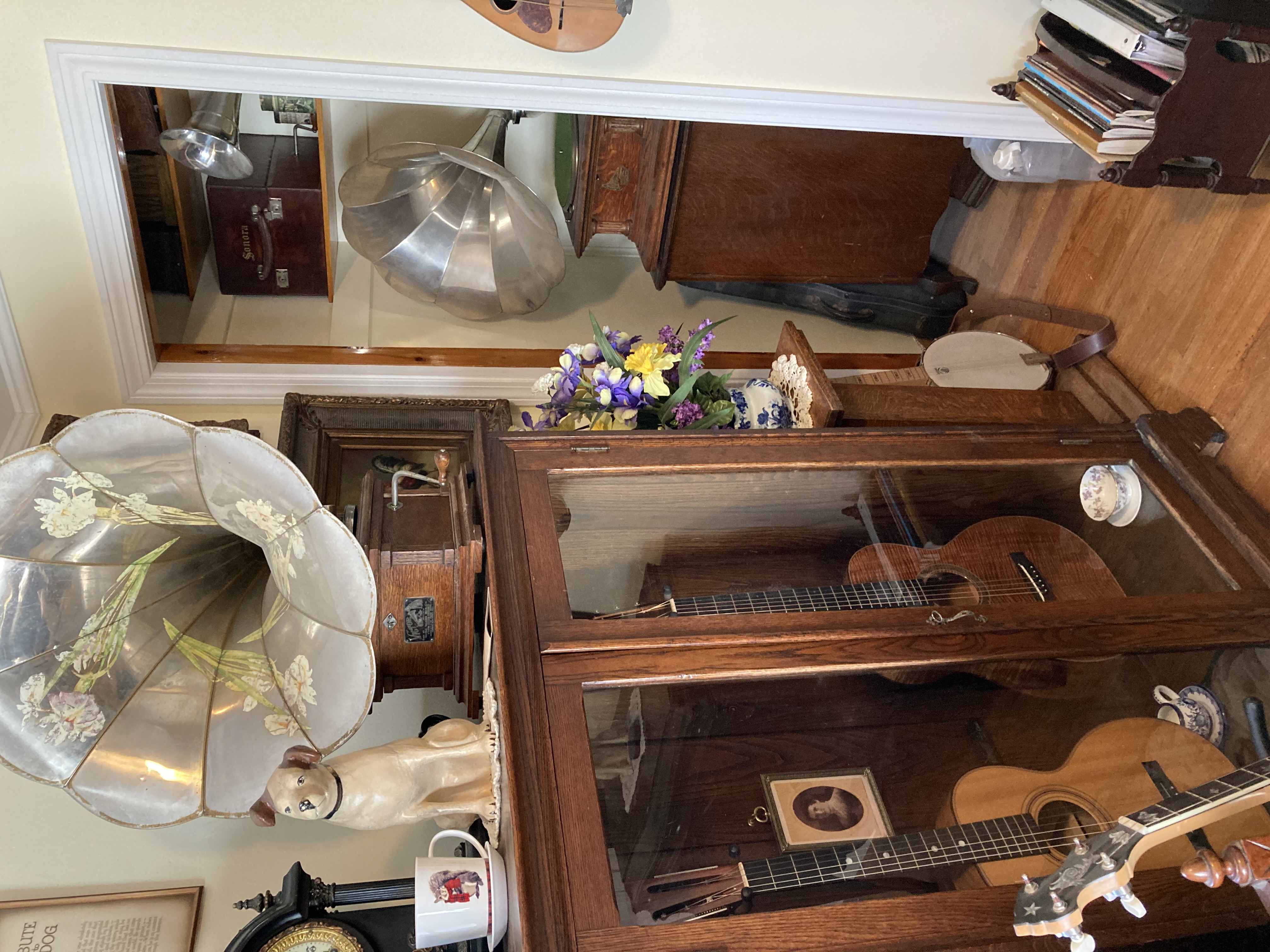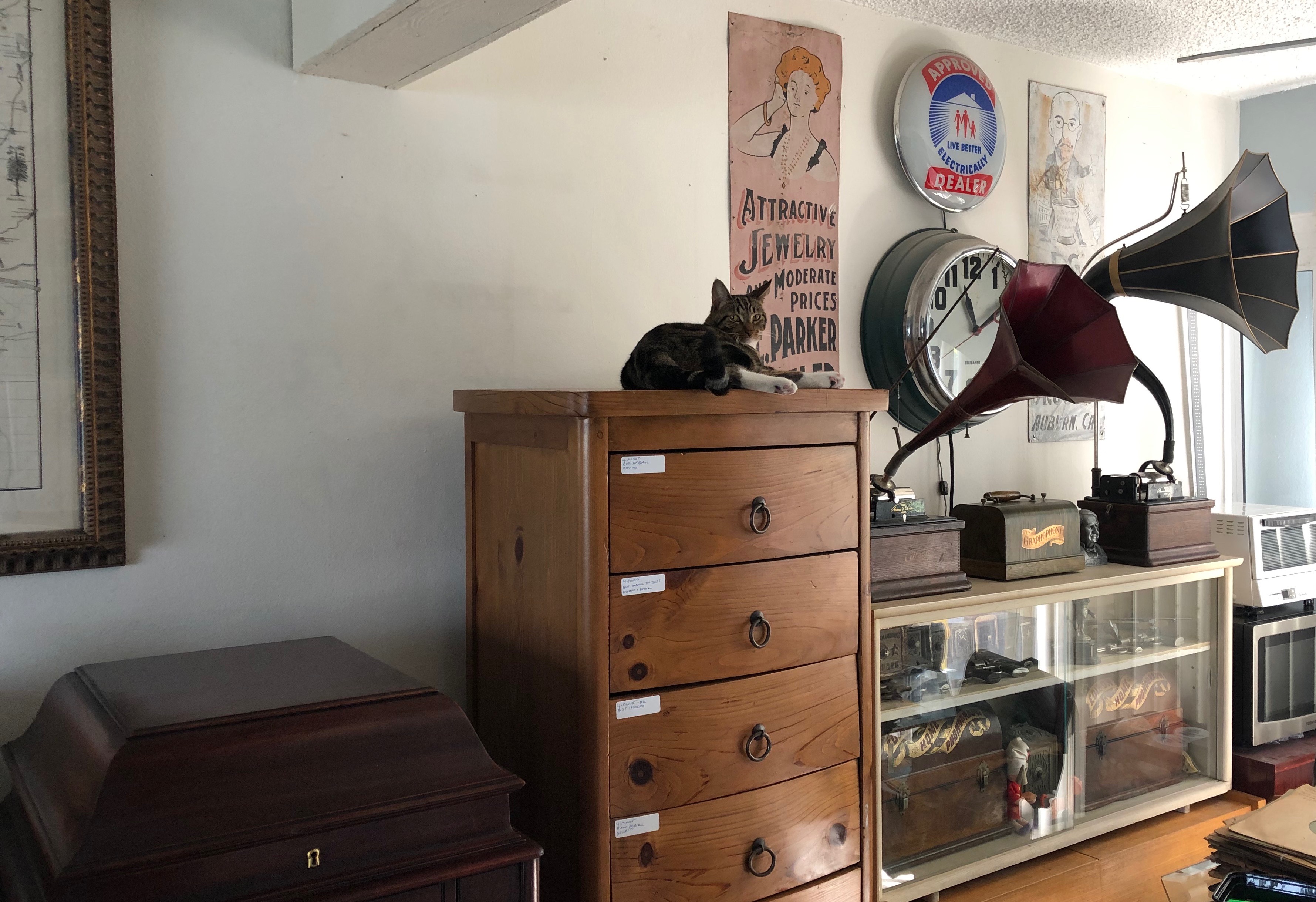 This is just the edge of the kitchen. The display case contains toy bank safes and toy cap guns as well. The chest is new for me and full of cylinders. I was going to put another phonograph on top of the cabinet, but the cat immediately claimed that space for her own and refuses to negotiate the matter.