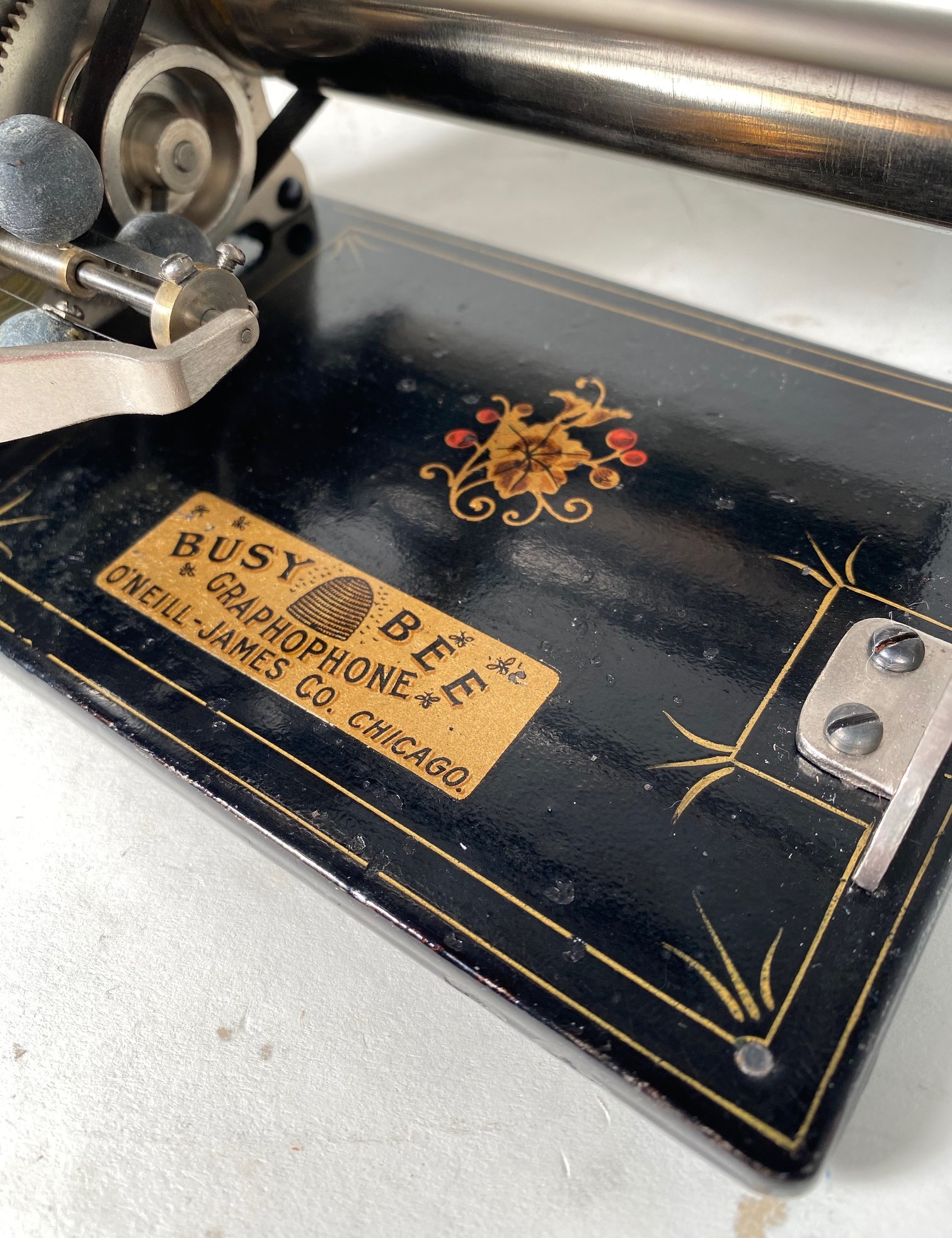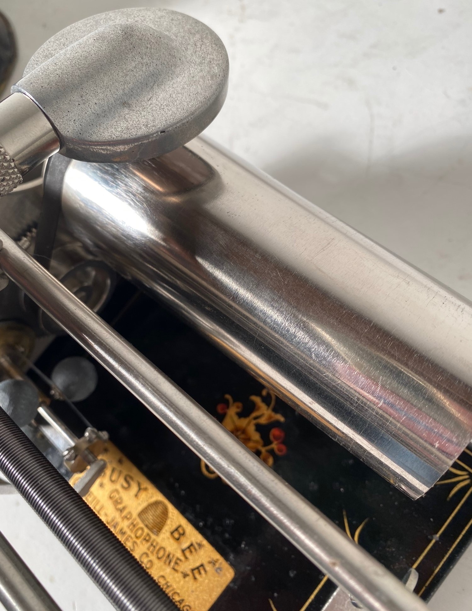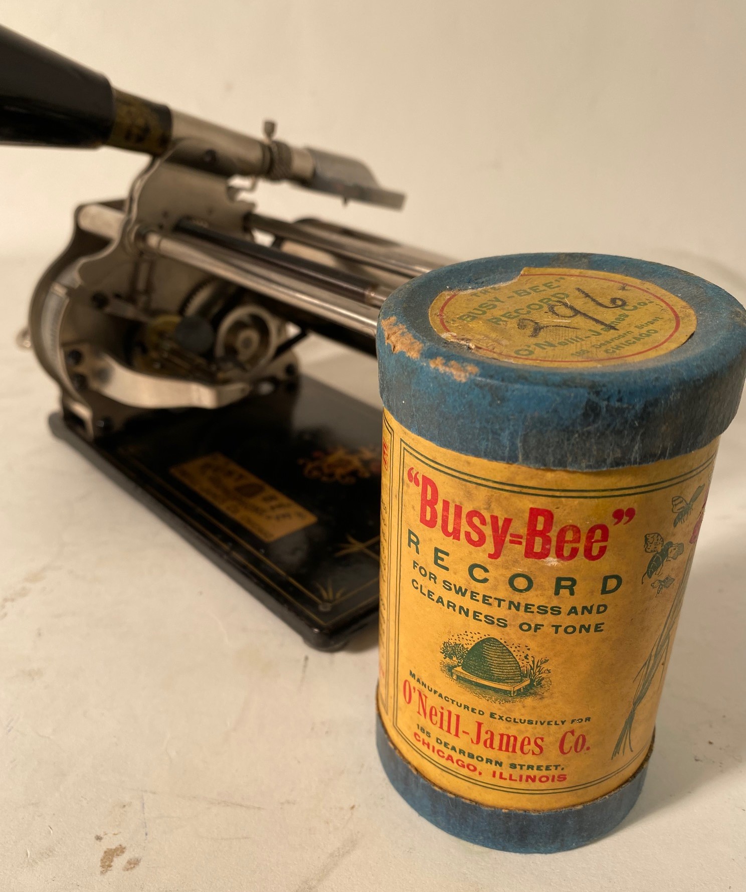 Here we have one of the sweetest pristine original condition Busy Bee phonos you will ever see. This machine comes complete with a minty original cone horn and 4 minty Busy Bee records. This "Little Honey" will play for you loud and clear! $575.00 will buy this little beauty and that includes shipping anywhere in the continental US