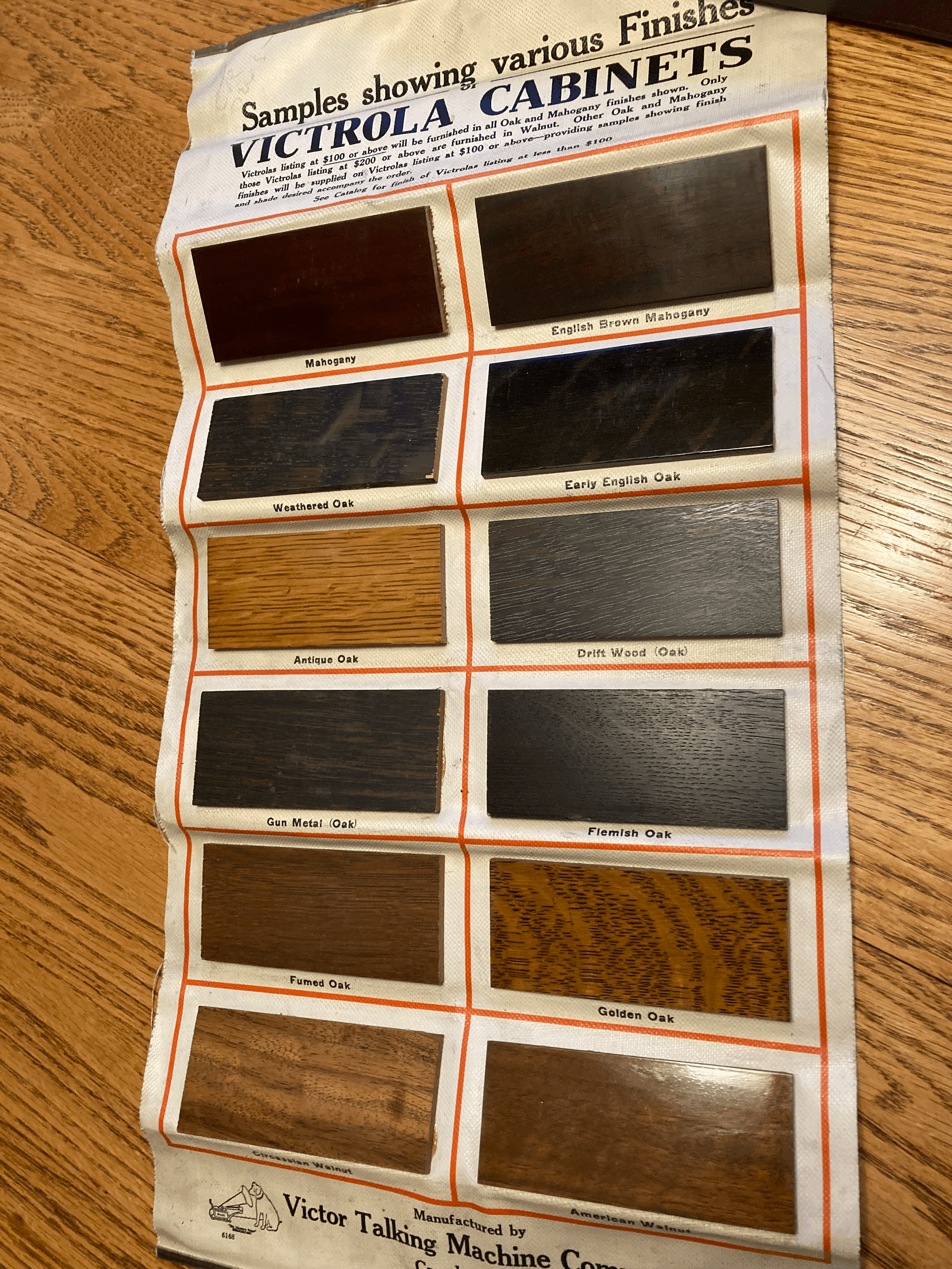 Here's an interesting Victor dealer display of the various cabinet finishes for that moment in Victrola production. It's interesting that of the twelve finishes, two are mahogany, two are walnut, and the remaining eight are oak. We often label a dark oak finish as "fumed oak", but not one of the darker oak finishes has that name. Was the fumed oak process a way of attaining all or most of the dark oak finishes?