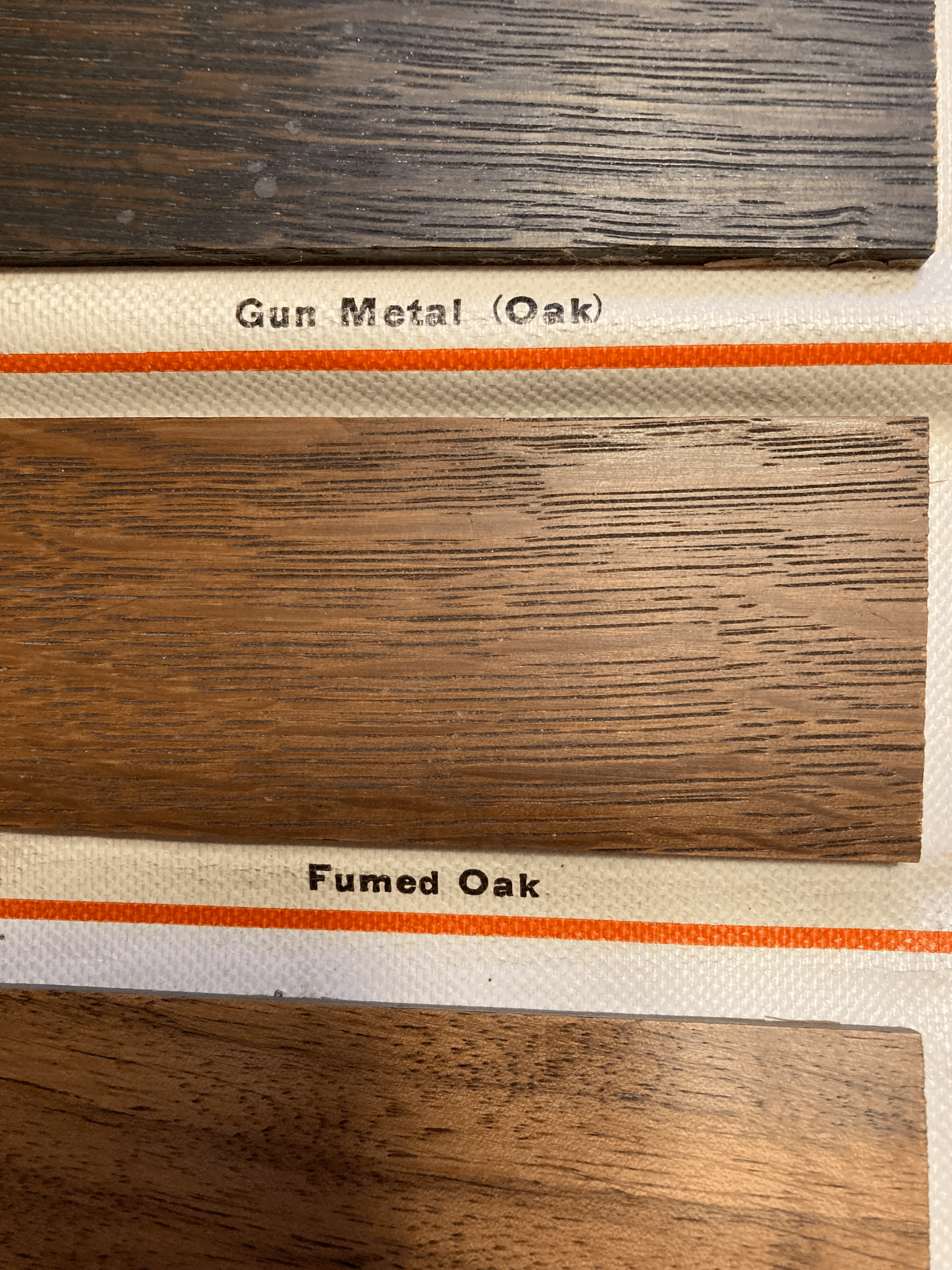 From what I've read about the oak finishes that were being used from the 1890's into the 20's and 30's in some cases, they were more interested in getting the color of the wood the way they wanted it with a chemical change in the wood instead of just using stain. The fuming process can make oak very dark and even almost black from what I've read but sometimes they had to wipe other things on the wood before it was fumed. If I remember correctly, they would often add more tannic acid to oak and some other woods to get the fuming process to make the wood darker. The really dark oak finishes (like Flemish oak) were usually done with the red oaks instead of white as the flake in the quarter sawn red oak was usually more predominate than it was in white oak. Plus, since it was going to be made so dark anyway it was seen as a waste of money to use white oak if it was going to be finished really dark. Almost all of the Flemish oak stain recipes that I've seen have some green in them to offset the reddish color of the wood. I'd have to dig through some of the old wood finishing books I have to get some of that stuff back in my head, but they really had a lot of odd ways of manipulating wood colors back then. And since oak was really popular in those years, they had all sorts of ways to deal with it.