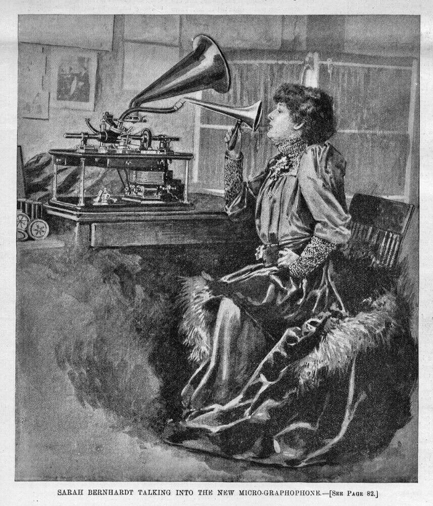 The image I believe is out of a Bettini catalog. Sarah Bernhardt recording on Bettini's machine in his New York studio 1892.