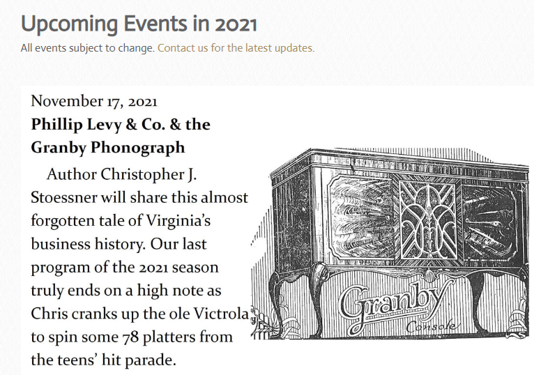 It is going to be a fun talk. I will briefly touch on what defines an "off brand" phonograph, show original Granby advertisements, factory photos, and be explaining to non collectors the basics about how furniture stores and music stores of the day met the demand and cashed in on the cabinet model phonograph craze of the late teens and early 1920's. My talk will be focused on the Granby phonograph but the story is similar to many regional businesses across the country in this time period.