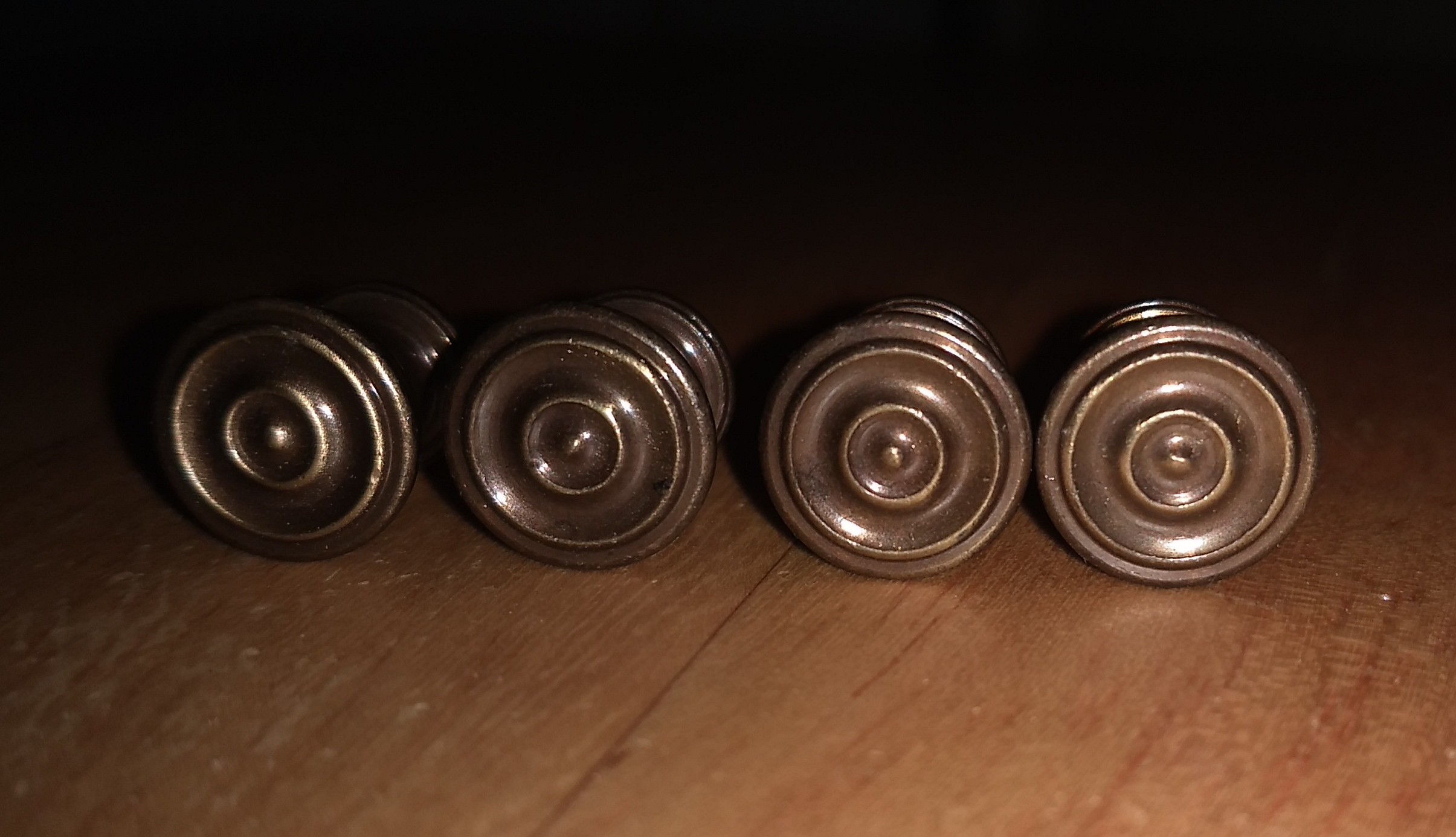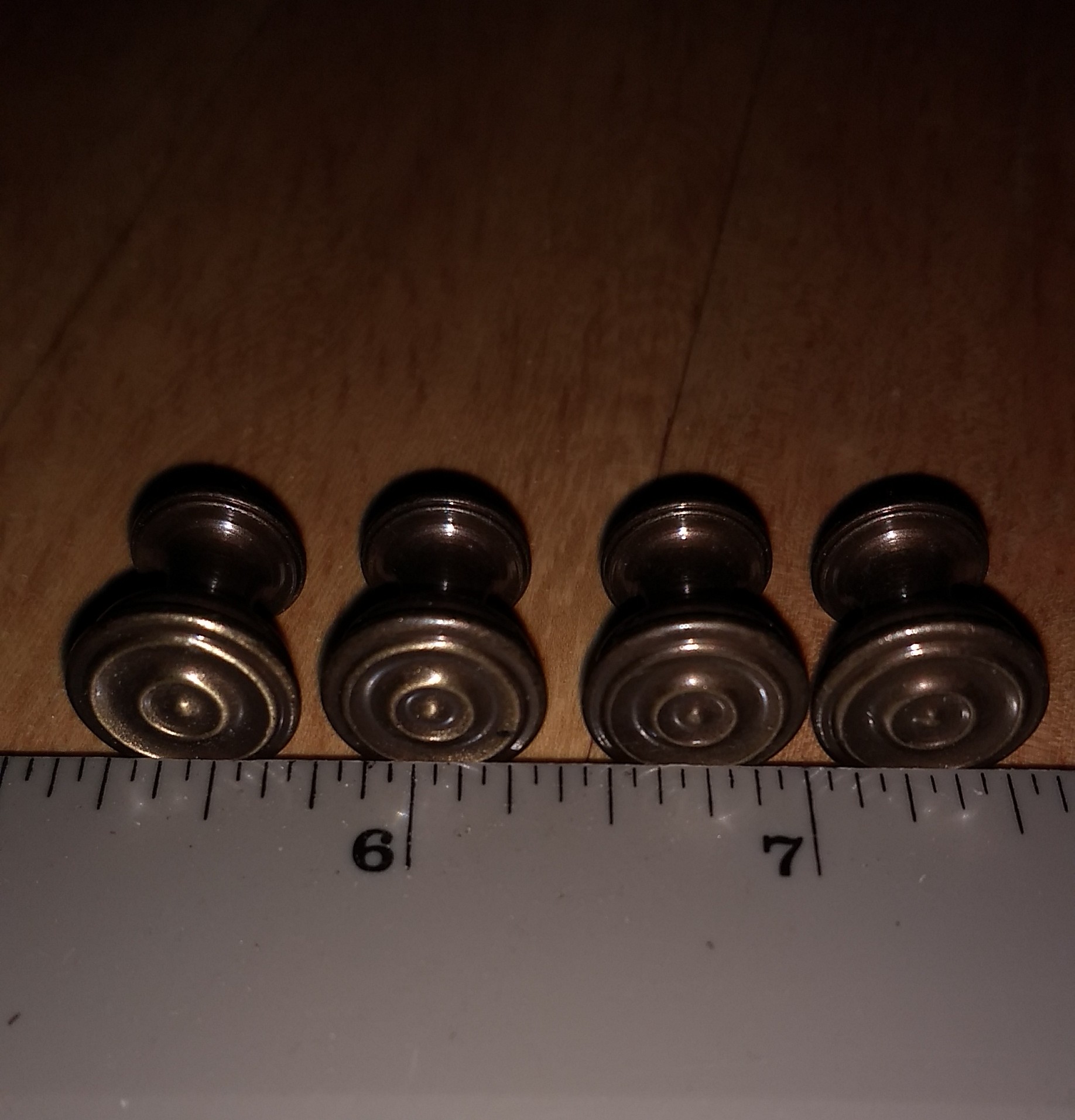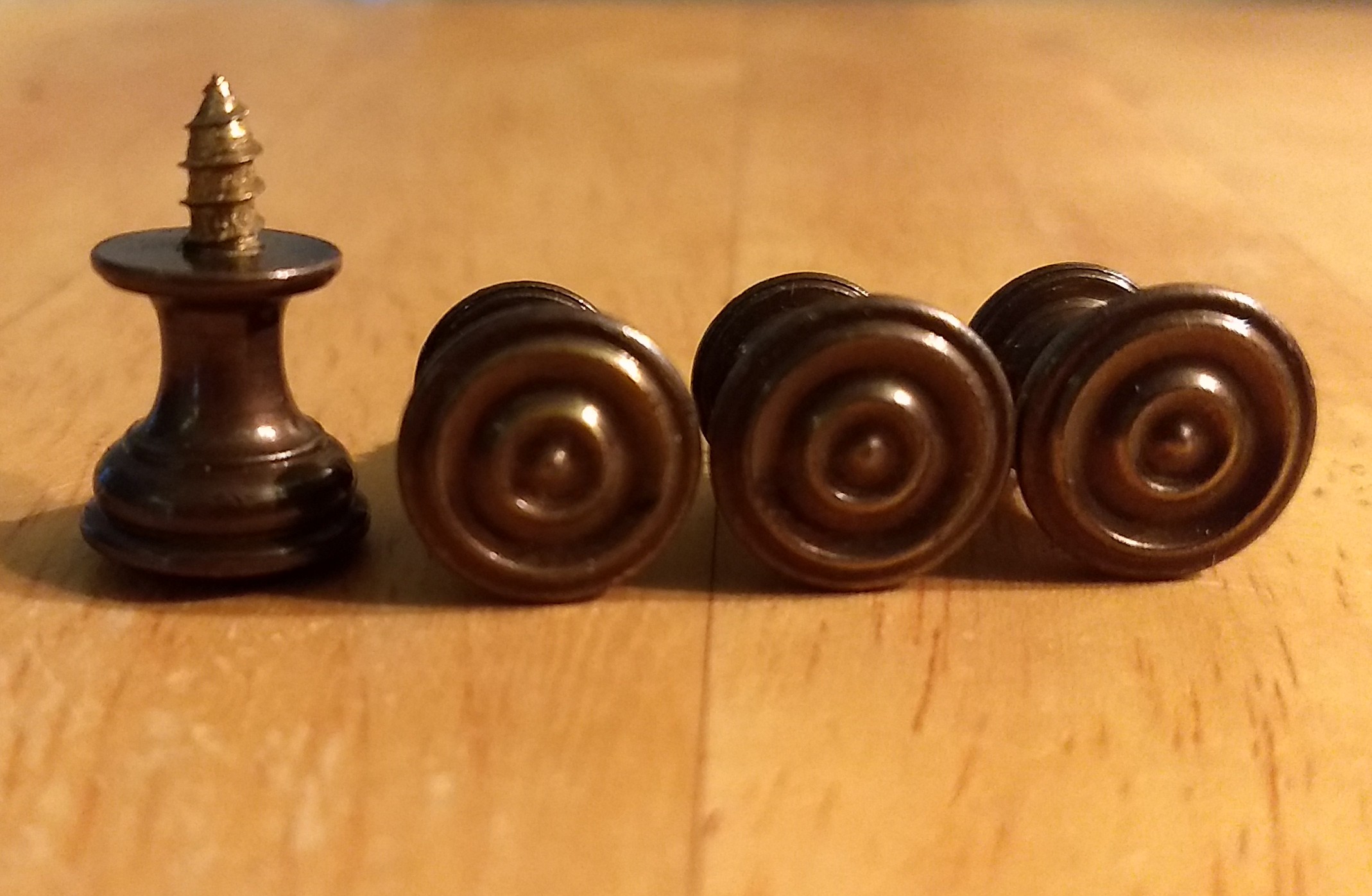 I have this set of four bronze colored knobs for a Credenza. I'm not sure if they were utilized with other models or not. Nice finish, and the larger part of the knob measures 9/16". Each one has the wood type screw as shown. The price is $15.00 plus actual shipping charges.