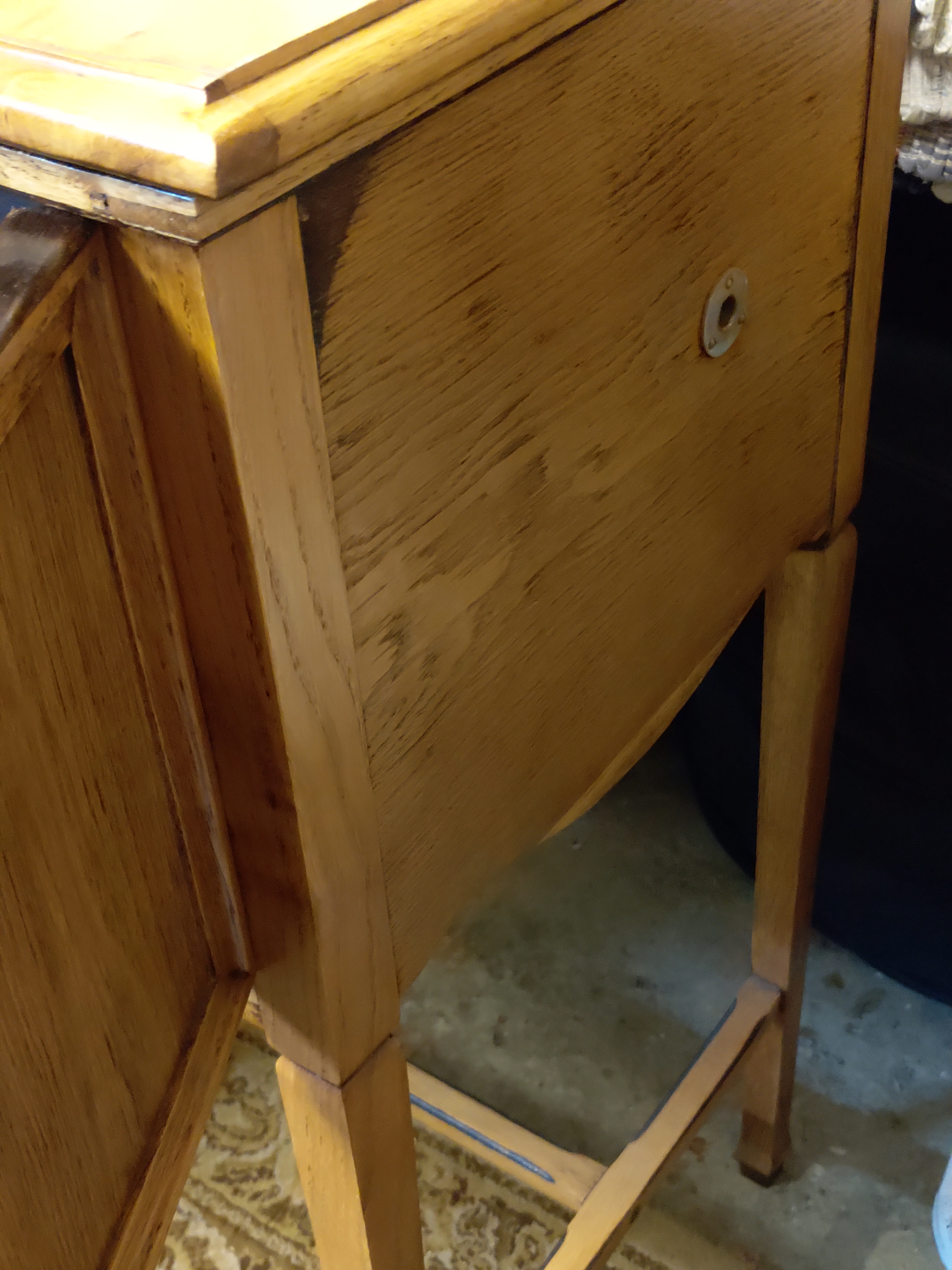 I will refinish the exterior, working to make it look close to the interior, this way it will also be easier to hide the crack on the lid too, as you say Roger. Back then someone must have cleaned it with a liquid stripper to make it look brighter, maybe not enjoying the dark color, or make it match the rest of the interior in the sitting room etc.
