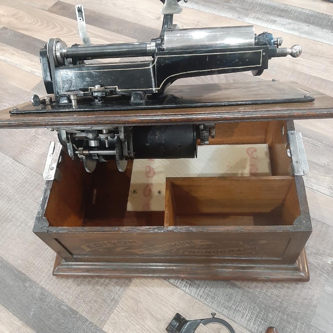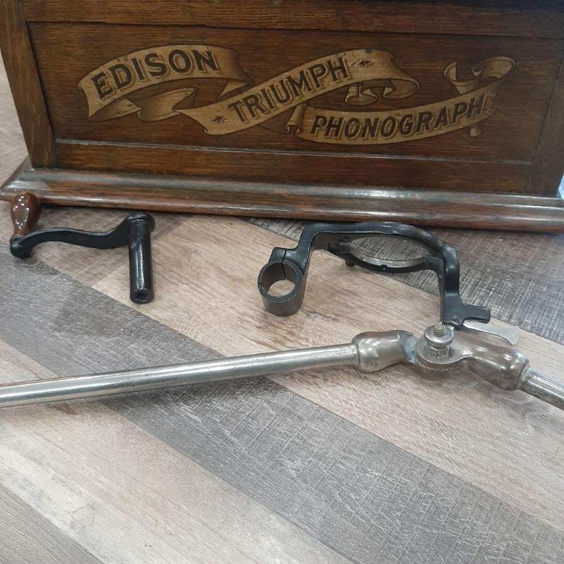 Here is the most wonderful Edison Triumph Banner Model A that I have seen. It looks to have the 2/4 gearing and the model K reproducer. It also has the horizontal carriage included. This is fresh from an estate. The Banner looks to be near perfect. The horn crane is so perfect that you would think that it had been replated but, it is original plating. It has the original shaving device. The horn is just stunning and is nice as you will ever find!!! 1400.00 I can deliver to the upcoming Donley auction. There will be plenty of people there to get it to you. I am not an Edison collector so if you see something that you have questions on I will do my best to answer. I will be out of the country from Dec2 - Dec 7. Tom