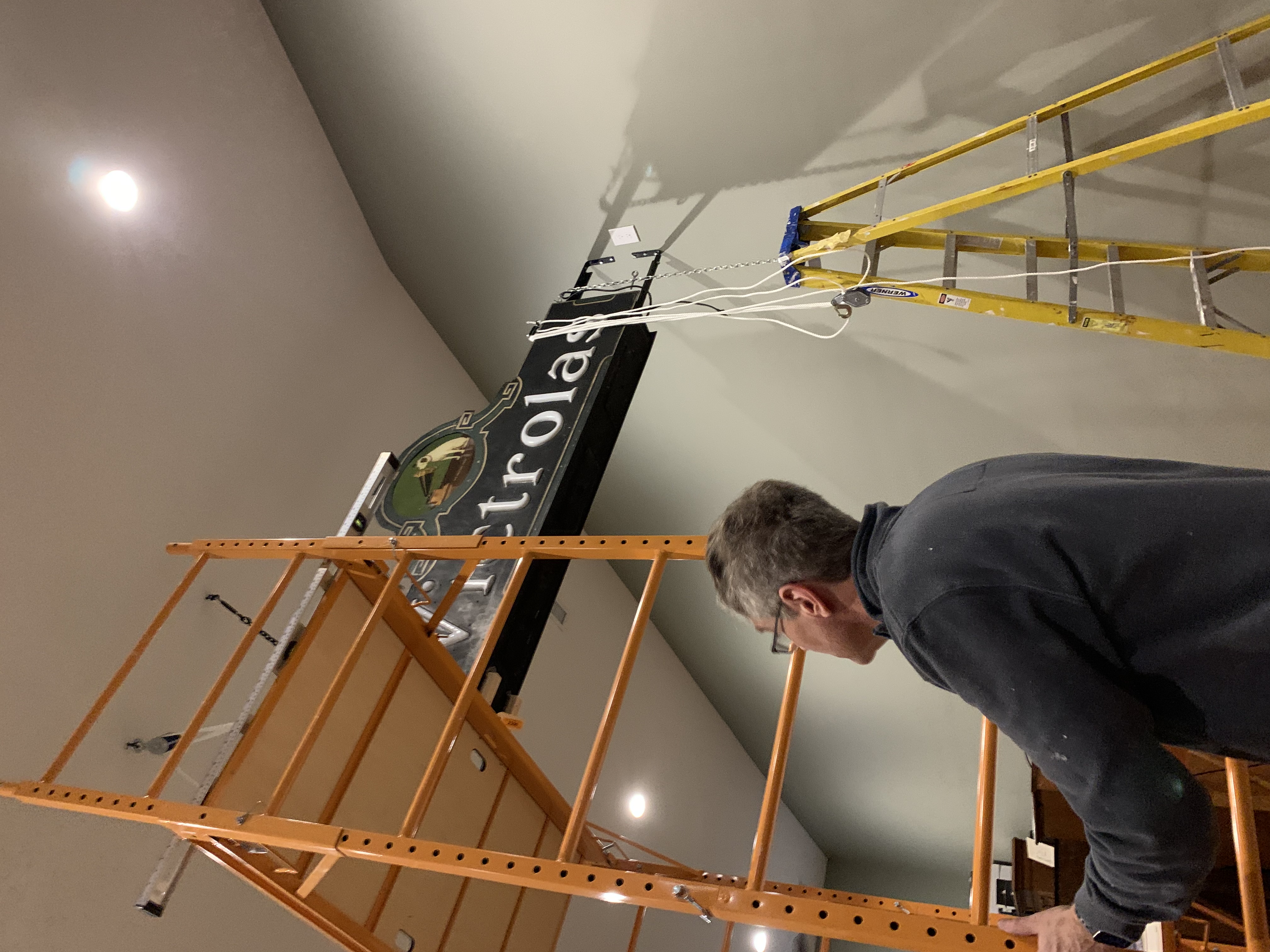 While we will never make it as professional sign hangers, we were able to get the Victrola sign hung and lighted today. Hanging a 8ft x 3 ft 150 lb Victrola sign 11 feet up on a wall was a bit of a challenge. I am happy to report that the sign and all 3 sign hangers survived the ordeal. A special thanks to Curt Angstman and my very understanding wife - I would have never gotten it up without their help. It is now securely hanging in it’s new home and lighting my music building.