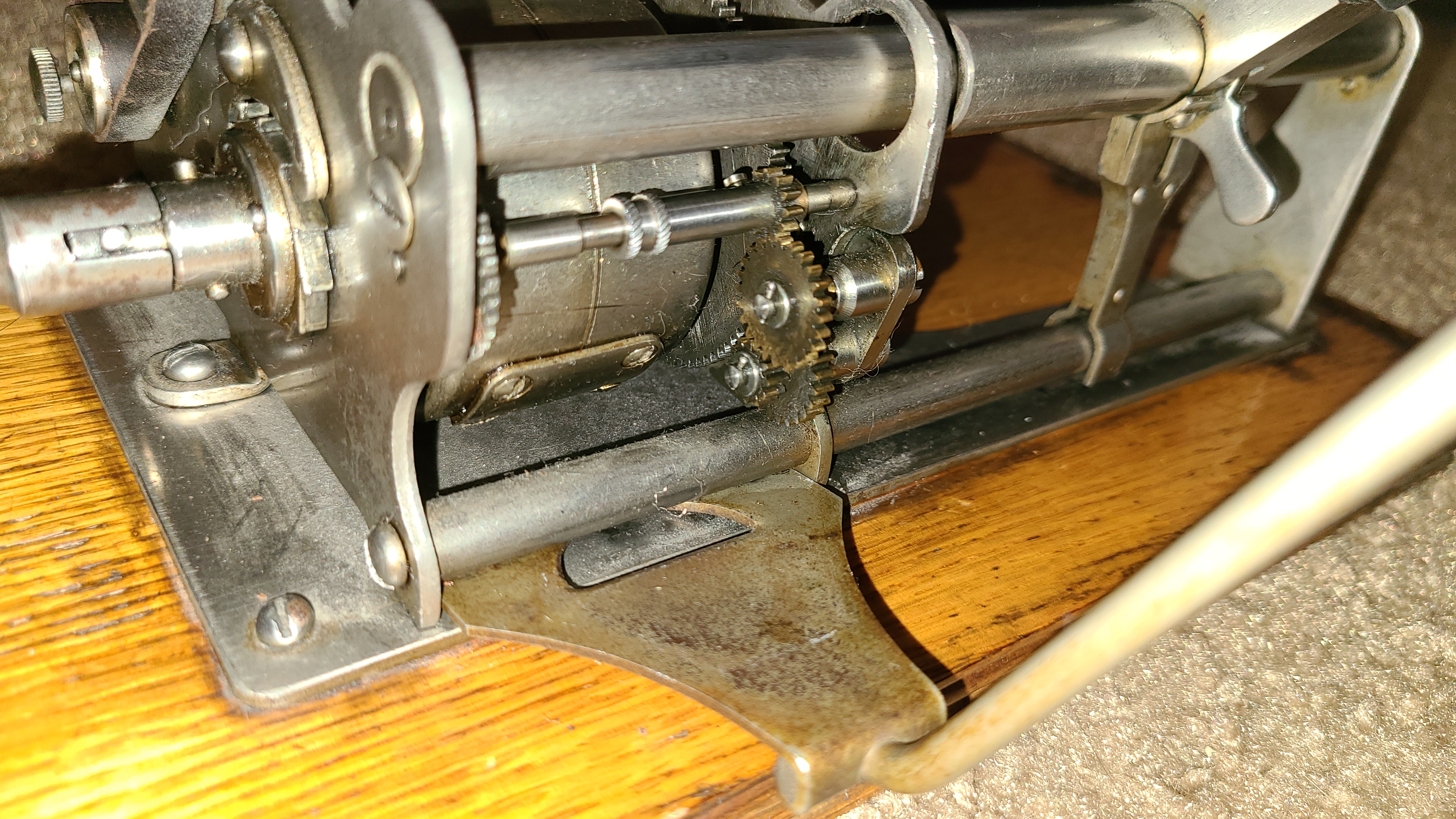 The crank and ratchet arrangement would allow the machine to be wound while playing, where as a stock Model B motor would stop while winding. This would allow for a bit of extra winding to get through 4 minutes without slowing/stopping the motor. Clever! I agree that this appears to be a "machinist's special" rather than a mass produced aftermarket offering.