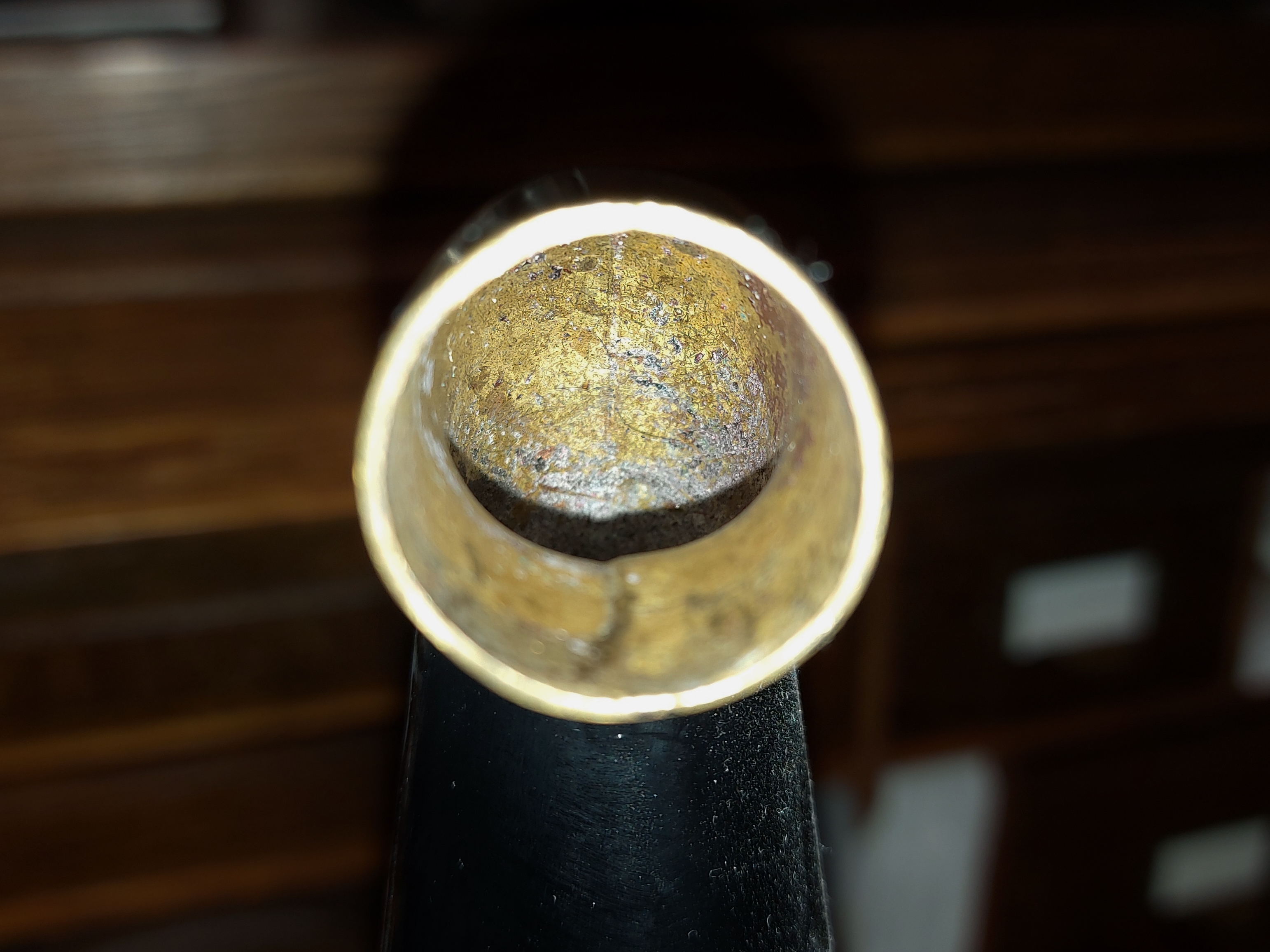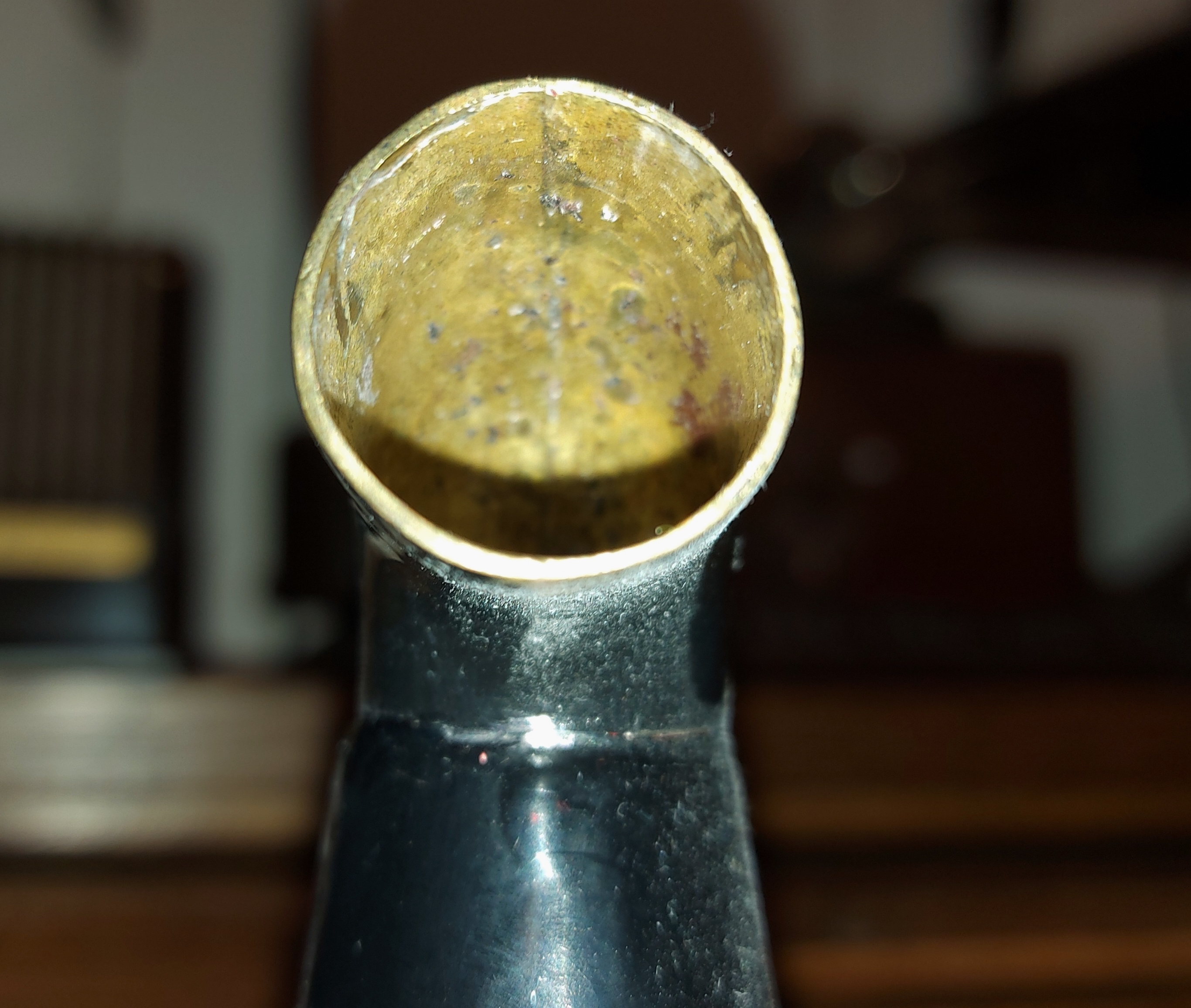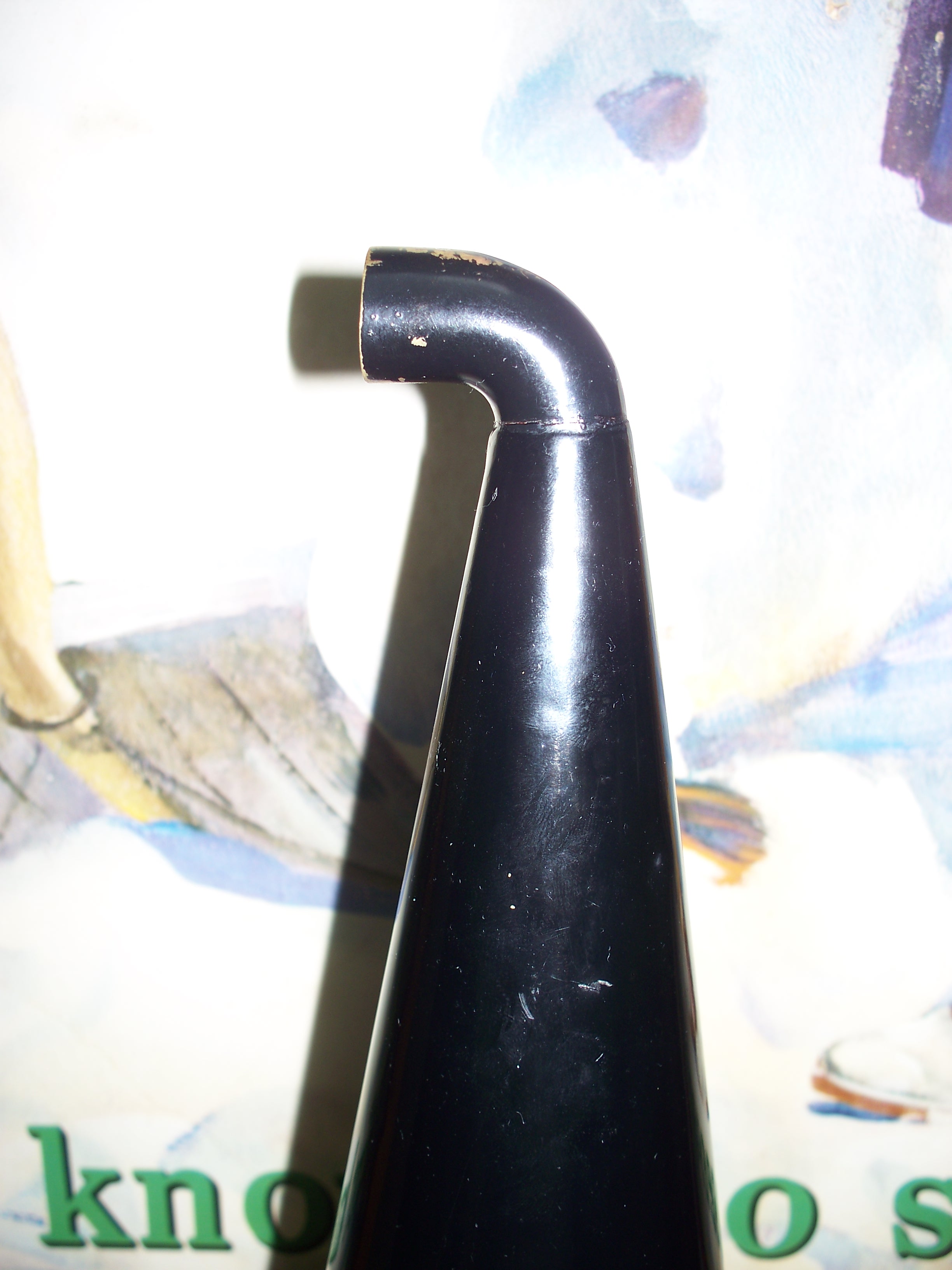 Bob, Thank you for posting the pics of your brass elbow. Mine is also brass (painted black) and quite well made. To solder the two halves and then solder onto the horn would have not only been time consuming, but more expensive than to just switch over to a cheaper and already readily available leather elbow. This would have also cut down on horn material being used too.